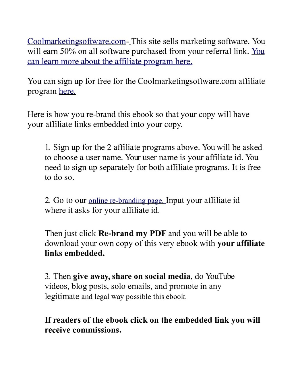 on all software purchased from your referral link. You can learn more about the affiliate program here. You can sign up for free for the Coolmarketingsoftware.com affiliate program here. Here is how you re-brand this ebook so that your copy will have your affiliate links embedded into your copy. 1. Sign up for the 2 affiliate programs above. You will be asked to choose a user name. Your user name is your affiliate id. You need to sign up separately for both affiliate programs. It is free to do so. 2. Go to our online re-branding page. Input your affiliate id where it asks for your affiliate id. Then just click Re-brand my PDF and you will be able to download your own copy of this very ebook with your affiliate links embedded. 3. Then give away, share on social media, do YouTube videos, blog posts, solo emails, and promote in any legitimate and legal way possible this ebook. If readers of the ebook click on the embedded link you will receive commissions.