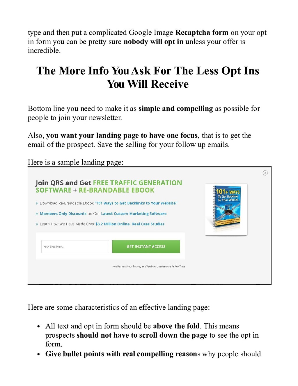 on your opt in form you can be pretty sure nobody will opt in unless your offer is incredible. The More Info You Ask For The Less Opt Ins You Will Receive Bottom line you need to make it as simple and compelling as possible for people to join your newsletter. Also, you want your landing page to have one focus, that is to get the email of the prospect. Save the selling for your follow up emails. Here is a sample landing page: Here are some characteristics of an effective landing page: • All text and opt in form should be above the fold. This means prospects should not have to scroll down the page to see the opt in form. • Give bullet points with real compelling reasons why people should