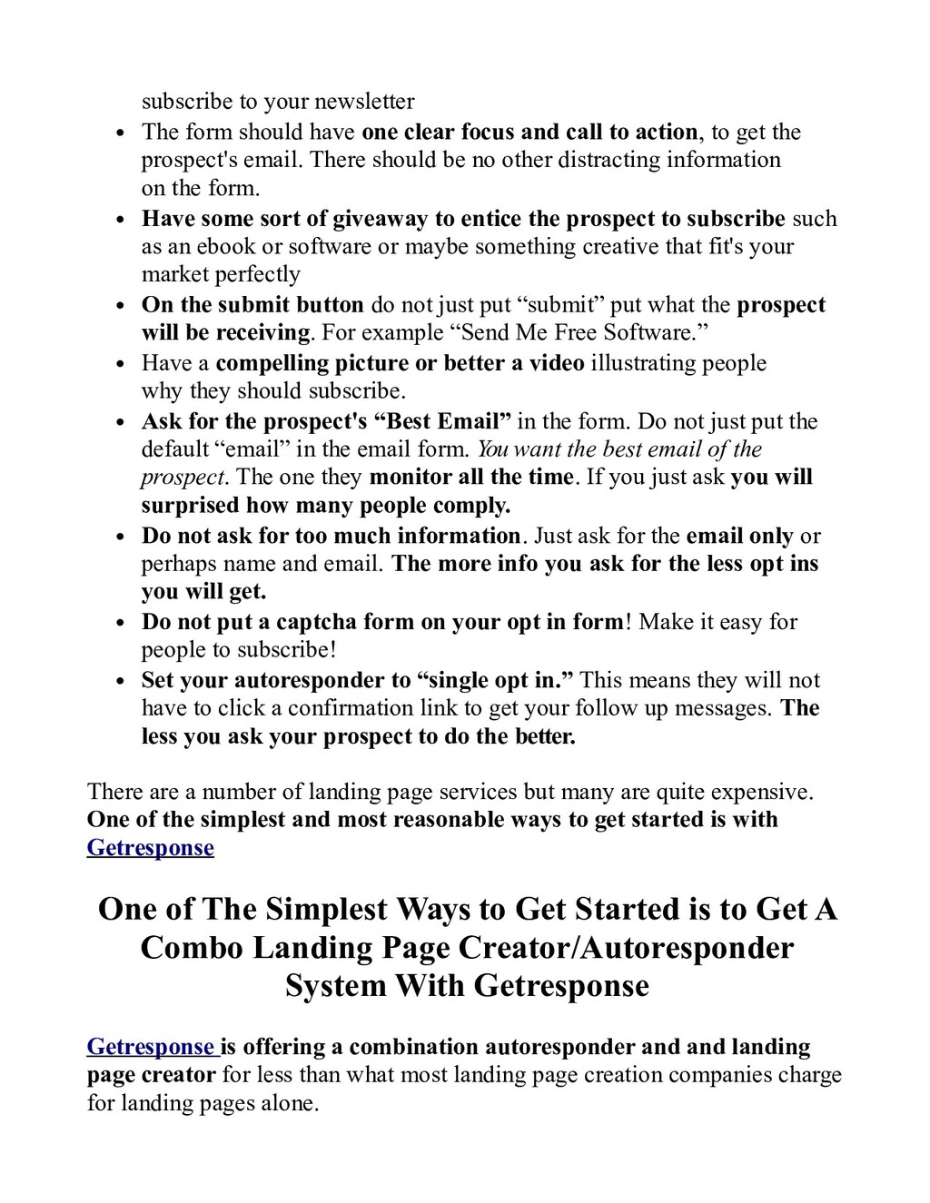 clear focus and call to action, to get the prospect's email. There should be no other distracting information on the form. • Have some sort of giveaway to entice the prospect to subscribe such as an ebook or software or maybe something creative that fit's your market perfectly • On the submit button do not just put “submit” put what the prospect will be receiving. For example “Send Me Free Software.” • Have a compelling picture or better a video illustrating people why they should subscribe. • Ask for the prospect's “Best Email” in the form. Do not just put the default “email” in the email form. You want the best email of the prospect. The one they monitor all the time. If you just ask you will surprised how many people comply. • Do not ask for too much information. Just ask for the email only or perhaps name and email. The more info you ask for the less opt ins you will get. • Do not put a captcha form on your opt in form! Make it easy for people to subscribe! • Set your autoresponder to “single opt in.” This means they will not have to click a confirmation link to get your follow up messages. The less you ask your prospect to do the better. There are a number of landing page services but many are quite expensive. One of the simplest and most reasonable ways to get started is with Getresponse One of The Simplest Ways to Get Started is to Get A Combo Landing Page Creator/Autoresponder System With Getresponse Getresponse is offering a combination autoresponder and and landing page creator for less than what most landing page creation companies charge for landing pages alone.