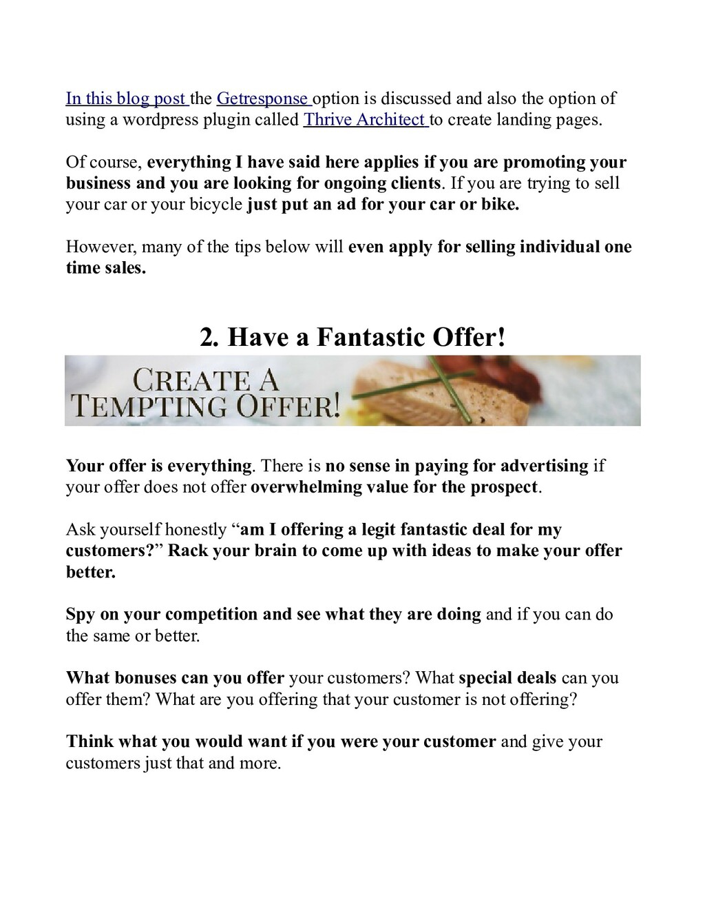 also the option of using a wordpress plugin called Thrive Architect to create landing pages. Of course, everything I have said here applies if you are promoting your business and you are looking for ongoing clients. If you are trying to sell your car or your bicycle just put an ad for your car or bike. However, many of the tips below will even apply for selling individual one time sales. 2. Have a Fantastic Offer! Your offer is everything. There is no sense in paying for advertising if your offer does not offer overwhelming value for the prospect. Ask yourself honestly “am I offering a legit fantastic deal for my customers?” Rack your brain to come up with ideas to make your offer better. Spy on your competition and see what they are doing and if you can do the same or better. What bonuses can you offer your customers? What special deals can you offer them? What are you offering that your customer is not offering? Think what you would want if you were your customer and give your customers just that and more.