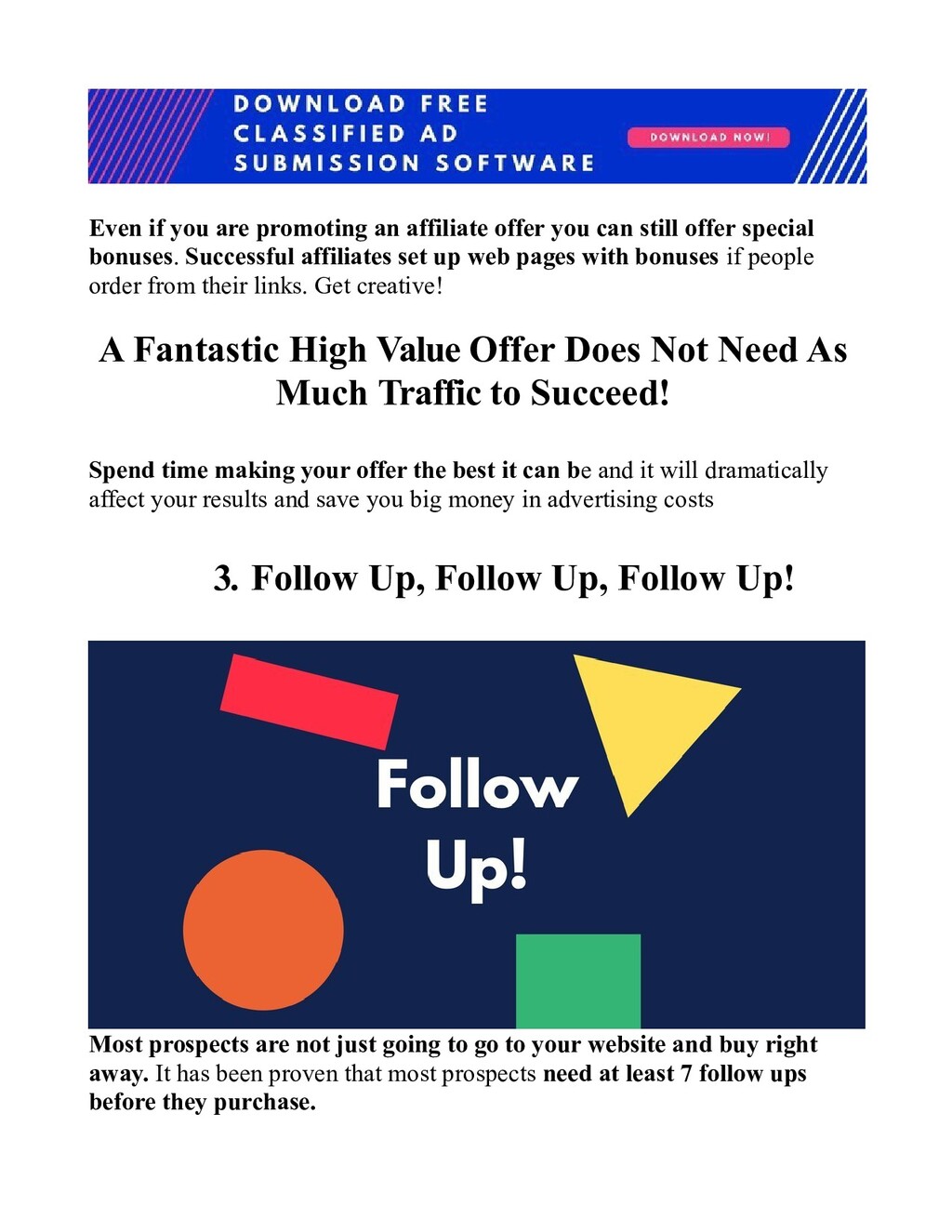 still offer special bonuses. Successful affiliates set up web pages with bonuses if people order from their links. Get creative! A Fantastic High Value Offer Does Not Need As Much Traffic to Succeed! Spend time making your offer the best it can be and it will dramatically affect your results and save you big money in advertising costs 3. Follow Up, Follow Up, Follow Up! Most prospects are not just going to go to your website and buy right away. It has been proven that most prospects need at least 7 follow ups before they purchase.