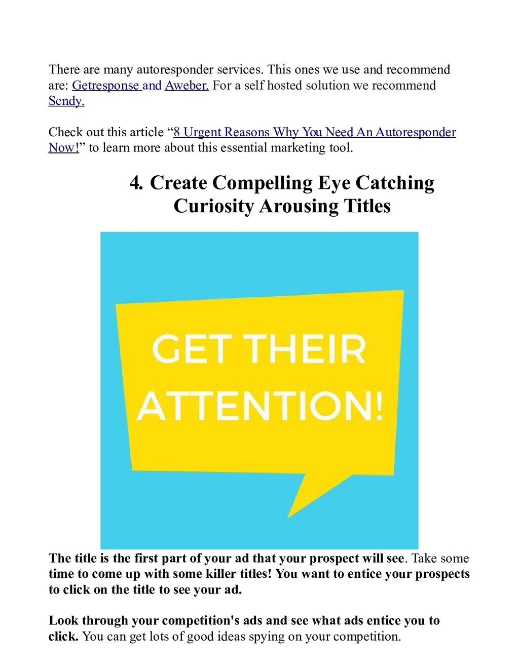 recommend are: Getresponse and Aweber . For a self hosted solution we recommend Sendy. Check out this article “8 Urgent Reasons Why You Need An Autoresponder Now!” to learn more about this essential marketing tool. 4. Create Compelling Eye Catching Curiosity Arousing Titles The title is the first part of your ad that your prospect will see. Take some time to come up with some killer titles! You want to entice your prospects to click on the title to see your ad. Look through your competition's ads and see what ads entice you to click. You can get lots of good ideas spying on your competition.