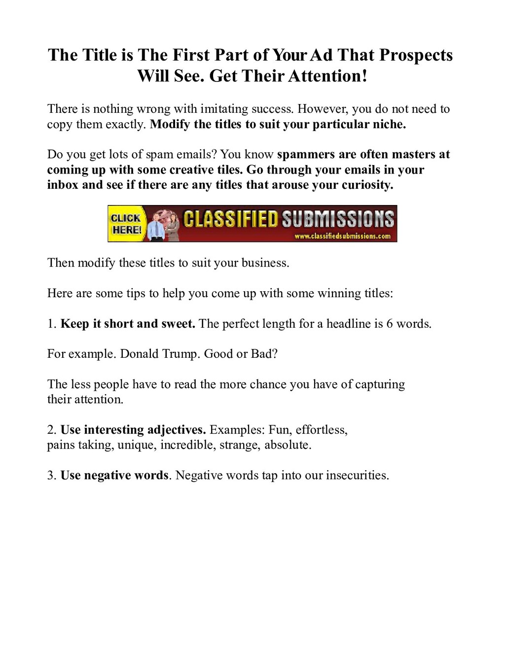Prospects Will See. Get Their Attention! There is nothing wrong with imitating success. However, you do not need to copy them exactly. Modify the titles to suit your particular niche. Do you get lots of spam emails? You know spammers are often masters at coming up with some creative tiles. Go through your emails in your inbox and see if there are any titles that arouse your curiosity. Then modify these titles to suit your business. Here are some tips to help you come up with some winning titles: 1. Keep it short and sweet. The perfect length for a headline is 6 words. For example. Donald Trump. Good or Bad? The less people have to read the more chance you have of capturing their attention. 2. Use interesting adjectives. Examples: Fun, effortless, pains taking, unique, incredible, strange, absolute. 3. Use negative words. Negative words tap into our insecurities.