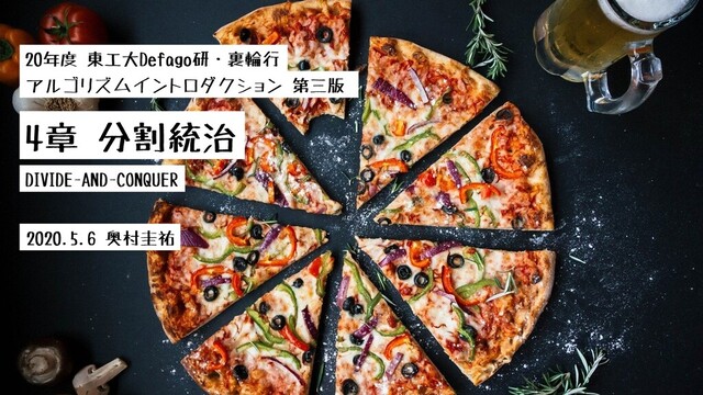 <latexit sha1_base64="qL53cSu9dmByO8Al1Gk78N909xo=">AAACF3icbVDLSsNAFJ3UV62vqEs3g0VoF9akCropFN24rGAf0LRhMp20004mYWYilJC/cOOvuHGhiFvd+TdOHwttPXDhcM693HuPFzEqlWV9G5mV1bX1jexmbmt7Z3fP3D9oyDAWmNRxyELR8pAkjHJSV1Qx0ooEQYHHSNMb3Uz85gMRkob8Xo0j0glQn1OfYqS05JqlfoEXYQU6Mg7cZFix0m7isLDveglP4Sm0U4i6Q+gX+JnXHRZdM2+VrCngMrHnJA/mqLnml9MLcRwQrjBDUrZtK1KdBAlFMSNpzokliRAeoT5pa8pRQGQnmf6VwhOt9KAfCl1cwan6eyJBgZTjwNOdAVIDuehNxP+8dqz8q05CeRQrwvFskR8zqEI4CQn2qCBYsbEmCAuqb4V4gATCSkeZ0yHYiy8vk0a5ZJ+XyncX+er1PI4sOALHoABscAmq4BbUQB1g8AiewSt4M56MF+Pd+Ji1Zoz5zCH4A+PzB3rmnZ0=</latexit> の漸近的な限界を求めたい. 2. ならば f(n) = ⇥ nlogb a <latexit sha1_base64="Ks1AlFFCTG7WiuRanz+qDw6sENc=">AAACEHicbVA9SwNBEN3zM8avU0ubxSDGJtxFQRshaGMZIVEhF8PeZi5Z3Ns7dueEcOQn2PhXbCwUsbW089+4+Sj8ejDweG+GmXlhKoVBz/t0Zmbn5hcWC0vF5ZXVtXV3Y/PSJJnm0OSJTPR1yAxIoaCJAiVcpxpYHEq4Cm/PRv7VHWgjEtXAQQrtmPWUiARnaKWOuxeV1f5J0OgDskBChGV1kwcy6dFOHg4pGwZa9Pq433FLXsUbg/4l/pSUyBT1jvsRdBOexaCQS2ZMy/dSbOdMo+AShsUgM5Ayfst60LJUsRhMOx8/NKS7VunSKNG2FNKx+n0iZ7Exg9geuBsz7Jvf3kj8z2tlGB23c6HSDEHxyaIokxQTOkqHdoUGjnJgCeNa2Fsp7zPNONoMizYE//fLf8llteIfVKoXh6Xa6TSOAtkmO6RMfHJEauSc1EmTcHJPHskzeXEenCfn1XmbtM4405kt8gPO+xfRe5x3</latexit> g(n) = ⇥(nlogb a lg n) <latexit sha1_base64="BLkJ0TYEYNeTtHA0a2yDIQ46FUY=">AAACDHicbVDLSgMxFM34rPVVdekmWIR2U2aqoBuh6MZlhb6gM5ZMmpmGZpIhyQhlmA9w46+4caGIWz/AnX9j2s5CWw8EDuecy809fsyo0rb9ba2srq1vbBa2its7u3v7pYPDjhKJxKSNBROy5yNFGOWkralmpBdLgiKfka4/vpn63QciFRW8pScx8SIUchpQjLSRBqVyWOFVeAXd1ohoVOH3qctEOPBTlGXQZWHKs6pJ2TV7BrhMnJyUQY7moPTlDgVOIsI1ZkipvmPH2kuR1BQzkhXdRJEY4TEKSd9QjiKivHR2TAZPjTKEgZDmcQ1n6u+JFEVKTSLfJCOkR2rRm4r/ef1EB5deSnmcaMLxfFGQMKgFnDYDh1QSrNnEEIQlNX+FeIQkwtr0VzQlOIsnL5NOveac1ep35+XGdV5HARyDE1ABDrgADXALmqANMHgEz+AVvFlP1ov1bn3MoytWPnME/sD6/AFBbZqE</latexit> f(n) <latexit sha1_base64="pG5iFsNQm8e14VQk0dg/VxXte+4=">AAAB63icbVBNSwMxEJ2tX7V+VT16CRahXspuK+ix6MVjBfsB7VKyabYNTbJLkhXK0r/gxYMiXv1D3vw3Zts9aOuDgcd7M8zMC2LOtHHdb6ewsbm1vVPcLe3tHxwelY9POjpKFKFtEvFI9QKsKWeStg0znPZiRbEIOO0G07vM7z5RpVkkH80spr7AY8lCRrDJpLAqL4fliltzF0DrxMtJBXK0huWvwSgiiaDSEI617ntubPwUK8MIp/PSINE0xmSKx7RvqcSCaj9d3DpHF1YZoTBStqRBC/X3RIqF1jMR2E6BzUSvepn4n9dPTHjjp0zGiaGSLBeFCUcmQtnjaMQUJYbPLMFEMXsrIhOsMDE2npINwVt9eZ106jWvUas/XFWat3kcRTiDc6iCB9fQhHtoQRsITOAZXuHNEc6L8+58LFsLTj5zCn/gfP4AXnuNyw==</latexit> g(n) <latexit sha1_base64="H/IG5bwopmw0jogcQhVX+ha6RXU=">AAAB63icbVBNSwMxEJ2tX7V+VT16CRahXspuK+ix6MVjBfsB7VKyabYNTbJLkhXK0r/gxYMiXv1D3vw3Zts9aOuDgcd7M8zMC2LOtHHdb6ewsbm1vVPcLe3tHxwelY9POjpKFKFtEvFI9QKsKWeStg0znPZiRbEIOO0G07vM7z5RpVkkH80spr7AY8lCRrDJpHFVXg7LFbfmLoDWiZeTCuRoDctfg1FEEkGlIRxr3ffc2PgpVoYRTuelQaJpjMkUj2nfUokF1X66uHWOLqwyQmGkbEmDFurviRQLrWcisJ0Cm4le9TLxP6+fmPDGT5mME0MlWS4KE45MhLLH0YgpSgyfWYKJYvZWRCZYYWJsPCUbgrf68jrp1Gteo1Z/uKo0b/M4inAG51AFD66hCffQgjYQmMAzvMKbI5wX5935WLYWnHzmFP7A+fwBYAKNzA==</latexit> まず を に代入 g(n) = ⇥ 0 @ logb n 1 X j=0 aj ⇣ n bj ⌘logb a 1 A <latexit sha1_base64="QBLS8MVoVNa+EdN3xkMW9vtKSSM=">AAACS3icbVBNa9tAFFy5TZO4X257zGWpCTiHGikppJdAaC85phAnAcsRT+sneZPVSuw+Fcyi/9dLL731T/SSQ0vpIWtHgXwNLAwzb3hvJ62UtBSGv4LOk6crz1bX1rvPX7x89br35u2xLWsjcCRKVZrTFCwqqXFEkhSeVgahSBWepBdfFv7JNzRWlvqI5hVOCsi1zKQA8lLSS/OB3tqLj2ZIECvMaBDbukjc+V7YnLlYlTlPXNpw/SFqOJy586adygwIpxuXLrQmNjKf0dbtBNyISa8fDsMl+EMStaTPWhwmvZ/xtBR1gZqEAmvHUVjRxIEhKRQ23bi2WIG4gBzHnmoo0E7csouGb3plyrPS+KeJL9XbCQeFtfPCH7hZAM3sfW8hPuaNa8o+TZzUVU2oxfWirFacSr4olk+lQUFq7gkII/2tXMzAt0S+/q4vIbr/5YfkeHsY7Qy3v37s739u61hjG+w9G7CI7bJ9dsAO2YgJ9p39Zn/Y3+BHcBn8C/5fj3aCNvOO3UFn5Qq9QbR8</latexit> logb n 1 X j=0 aj ⇣ n bj ⌘logb a = nlogb a logb n 1 X j=0 ⇣ a blogb a ⌘j = nlogb a logb n 1 X j=0 1 = nlogb a logb n <latexit sha1_base64="ecHlZmsiitUNdZaqrsWwW5L6WLE=">AAAC3XiclVLBThsxEPUuLaVpSwM99mI1oqKHRru0ElyQUHvpkUoNILJhNet4Ewevd2XPIkWWJS4cWlW98l/c+A8+oE6IRBrKgZEsPb3xezOecVZJYTCKroNw6cnT5WcrzxsvXr5afd1cWz8wZa0Z77BSlvooA8OlULyDAiU/qjSHIpP8MDv9OskfnnFtRKl+4LjivQIGSuSCAXoqbd4kpi5SO9qN3IlNZDmgqc0cVR9jR+HEjlwieY6bSa6BWeVsNuFcosVgiB/mFeDo+121wDxsPm8LU9t54V2BkTdJHuVM4wcUd7fSZitqR9Og90E8Ay0yi/20eZX0S1YXXCGTYEw3jirsWdAomOSukdSGV8BOYcC7HioouOnZ6XYc3fBMn+al9kchnbLzCguFMePCN7ZRAA7NYm5C/i/XrTHf6Vmhqhq5YreF8lpSLOlk1bQvNGcoxx4A08L3StkQ/MTRf4iGH0K8+OT74GCrHX9qb33/3Nr7MhvHCnlL3pFNEpNtske+kX3SISw4Ds6Dn8GvMA0vwt/hn9urYTDTvCH/RHj5FxhZ5o8=</latexit> 中身を評価 もとに戻してdone 32