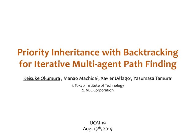 it drops priority. Agents that have not reached goal have higher priority. pi(t) ⌘i(t) + ✏i <latexit sha1_base64="AVKYBP7oENlayRSOsgLuj/iMBD8=">AAACeHicbZHNThRBFIVrGn9w/GHApZuKEyNoMulGoy6Jblxi4gAJPencrrk9VKi/VN0WJ53mGXgat/IavIorq4dJQMabVHLynXsW91TplAyUple9ZO3e/QcP1x/1Hz95+mxjsLl1EGztBY6FVdYflRBQSYNjkqTwyHkEXSo8LE+/dP7hD/RBWvOd5g4nGmZGVlIARVQM3riike027fBcYUXgvT3jORIUsoNvo3ZBqrgqi8EwHaWL4asiW4ohW85+sdn7kE+tqDUaEgpCOM5SR5MGPEmhsO3ndUAH4hRmeBylAY1h0iyOavmrSKa8sj4+Q3xBbyca0CHMdRk3NdBJuOt18MYzeCas1mCmTQ5+puFn2+SdZ12Te80jO+9grqSWFNrVhDT/SUR4k7h9DVWfJo00riY04vqYqlacLO9+gU+lR0FqHgUIL2MfXJyAB0Hxr/qx6exur6viYHeUvRul394P9z4vO19nL9hLts0y9pHtsa9sn42ZYBfsF/vNLnt/Ep68TnauV5PeMvOc/TPJ7l8E68PB</latexit> elapsed timestep since last updated its goal, or, be zero if no goal ai <latexit sha1_base64="bKnDqKuin7Sp6S2MR2LJh+yFi9M=">AAACT3icbZFLSwMxFIUz9dXWZ3XpJlgEV2VGRV2KblxWtA/olHInTWswjyHJqGWo/8Ct/i6X/hJ3YqYOVFsvBA7fyYHckyjmzFjf//AKC4tLyyvFUnl1bX1jc6uy3TQq0YQ2iOJKtyMwlDNJG5ZZTtuxpiAiTlvR/WXmtx6oNkzJWzuKaVfAULIBI2AduoEe621V/Zo/GTwvglxUUT71XsU7CfuKJIJKSzgY0wn82HZT0JYRTsflMDE0BnIPQ9pxUoKgpptO3jrG+4708UBpd6TFE/o7kYIwZiQid1OAvTOzXgannqSPRAkBsp+GoIcCnsZpmHkqTkMtsGPPGQw5E8ya8XyCyX8SDk4Tv7exg7NuymScWCrJzzKDhGOrcFYu7jNNieUjJ4Bo5vrA5A40EOu+oOyaDmZ7nRfNw1pwVPOvj6vnF3nnRbSL9tABCtApOkdXqI4aiKAhekGv6M179z69r0J+teDlYgf9mULpG0Teth4=</latexit> tie-breaker, in [0, 1) unique between agents unique between agents for every timestep for an agent at timestep ai <latexit sha1_base64="bKnDqKuin7Sp6S2MR2LJh+yFi9M=">AAACT3icbZFLSwMxFIUz9dXWZ3XpJlgEV2VGRV2KblxWtA/olHInTWswjyHJqGWo/8Ct/i6X/hJ3YqYOVFsvBA7fyYHckyjmzFjf//AKC4tLyyvFUnl1bX1jc6uy3TQq0YQ2iOJKtyMwlDNJG5ZZTtuxpiAiTlvR/WXmtx6oNkzJWzuKaVfAULIBI2AduoEe621V/Zo/GTwvglxUUT71XsU7CfuKJIJKSzgY0wn82HZT0JYRTsflMDE0BnIPQ9pxUoKgpptO3jrG+4708UBpd6TFE/o7kYIwZiQid1OAvTOzXgannqSPRAkBsp+GoIcCnsZpmHkqTkMtsGPPGQw5E8ya8XyCyX8SDk4Tv7exg7NuymScWCrJzzKDhGOrcFYu7jNNieUjJ4Bo5vrA5A40EOu+oOyaDmZ7nRfNw1pwVPOvj6vnF3nnRbSL9tABCtApOkdXqI4aiKAhekGv6M179z69r0J+teDlYgf9mULpG0Teth4=</latexit> t <latexit sha1_base64="7adVWJLvurBhEiRLn+msARImvWs=">AAACTXicbZHNahsxFIU1Tts47l+cLrMRNYWuzEwb2ixDsunShjoOeAZzR752RPQzSHeamMF9gW7T5+q6D9JdKdU4A07jXhAcvqMDukd5oaSnOP4ZtXYePX6y297rPH32/MXL/e7BubelEzgSVll3kYNHJQ2OSJLCi8Ih6FzhOL86q/3xF3ReWvOZlgVmGhZGzqUACmhI0/1e3I/Xw7dF0ogea2Yw7UYf0pkVpUZDQoH3kyQuKKvAkRQKV5209FiAuIIFToI0oNFn1fqlK/4mkBmfWxeOIb6m9xMVaO+XOg83NdClf+jVcOMZvBZWazCzKgW30HCzqtLas0WVOs0D+1rDVEktya+2E9L8JxHgJnF/G5ofZ5U0RUloxN0y81Jxsryuls+kQ0FqGQQIJ0MfXFyCA0HhAzqh6eRhr9vi/F0/ed+Ph0e9k9Om8zY7ZK/ZW5awj+yEfWIDNmKCIfvGbtn36Ef0K/od/bm72oqazCv2z7R2/wLALLZU</latexit>
