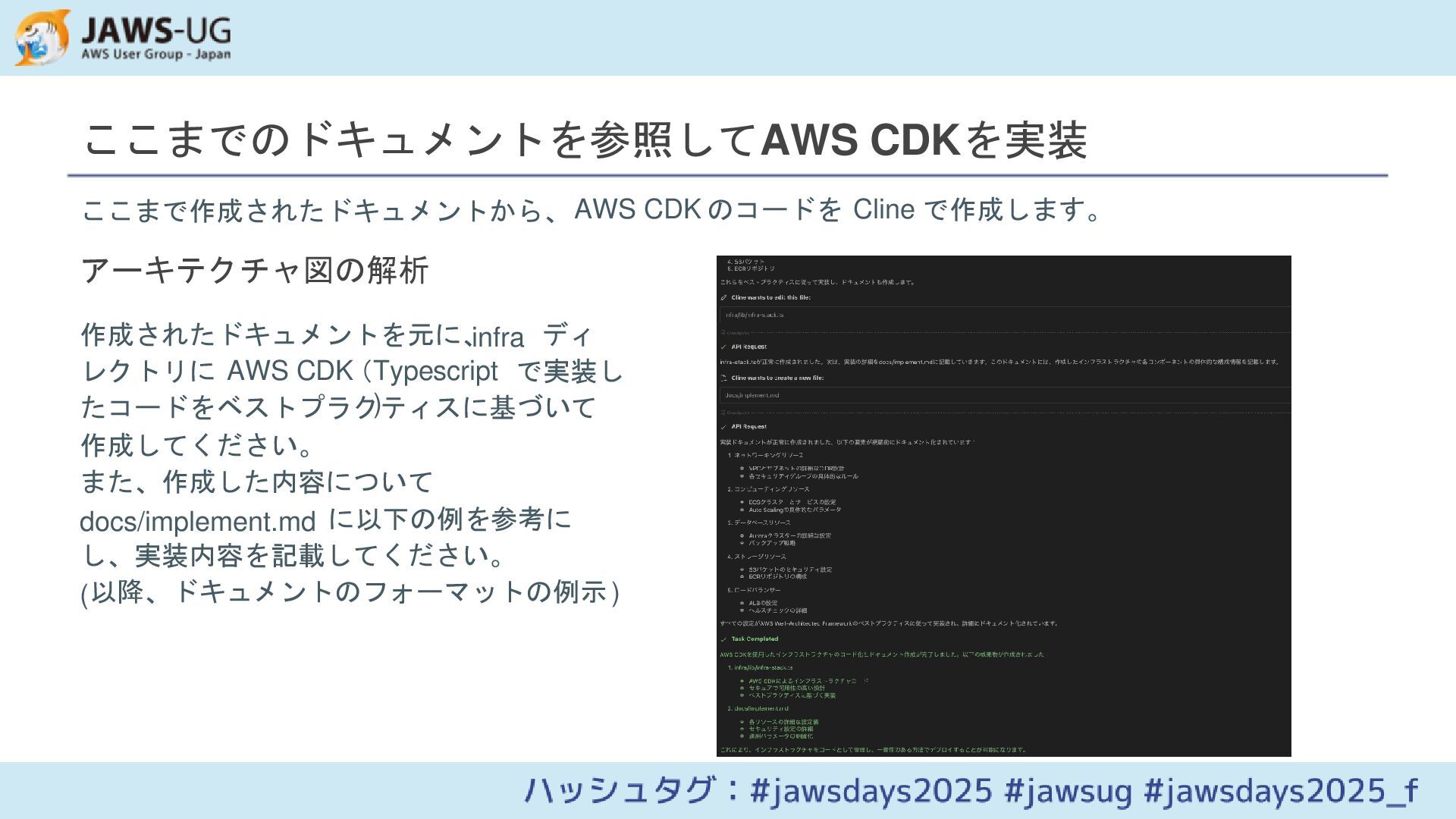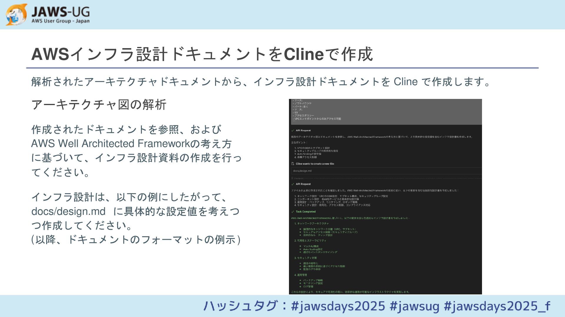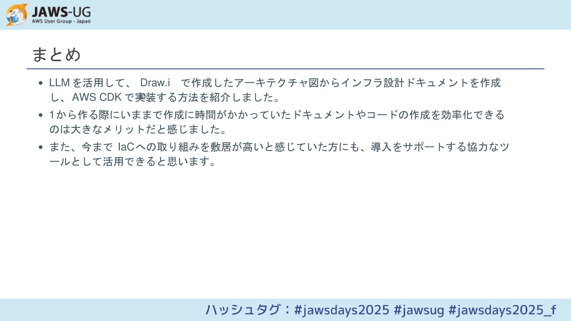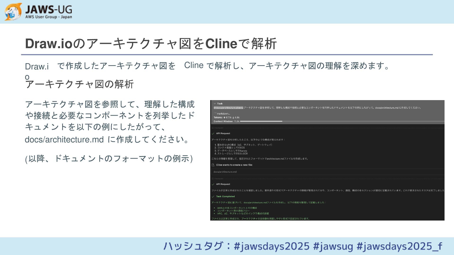 Draw.ioで作成したAWSアーキテクチャ図を基に、LLM(Cline)を活用してインフラ設計ドキュメントを作成し、AWS CDKで実装する方法を紹介します。アーキテクチャ図の解析から実装までの一連のプロセスを効率化するアプローチを解説します。