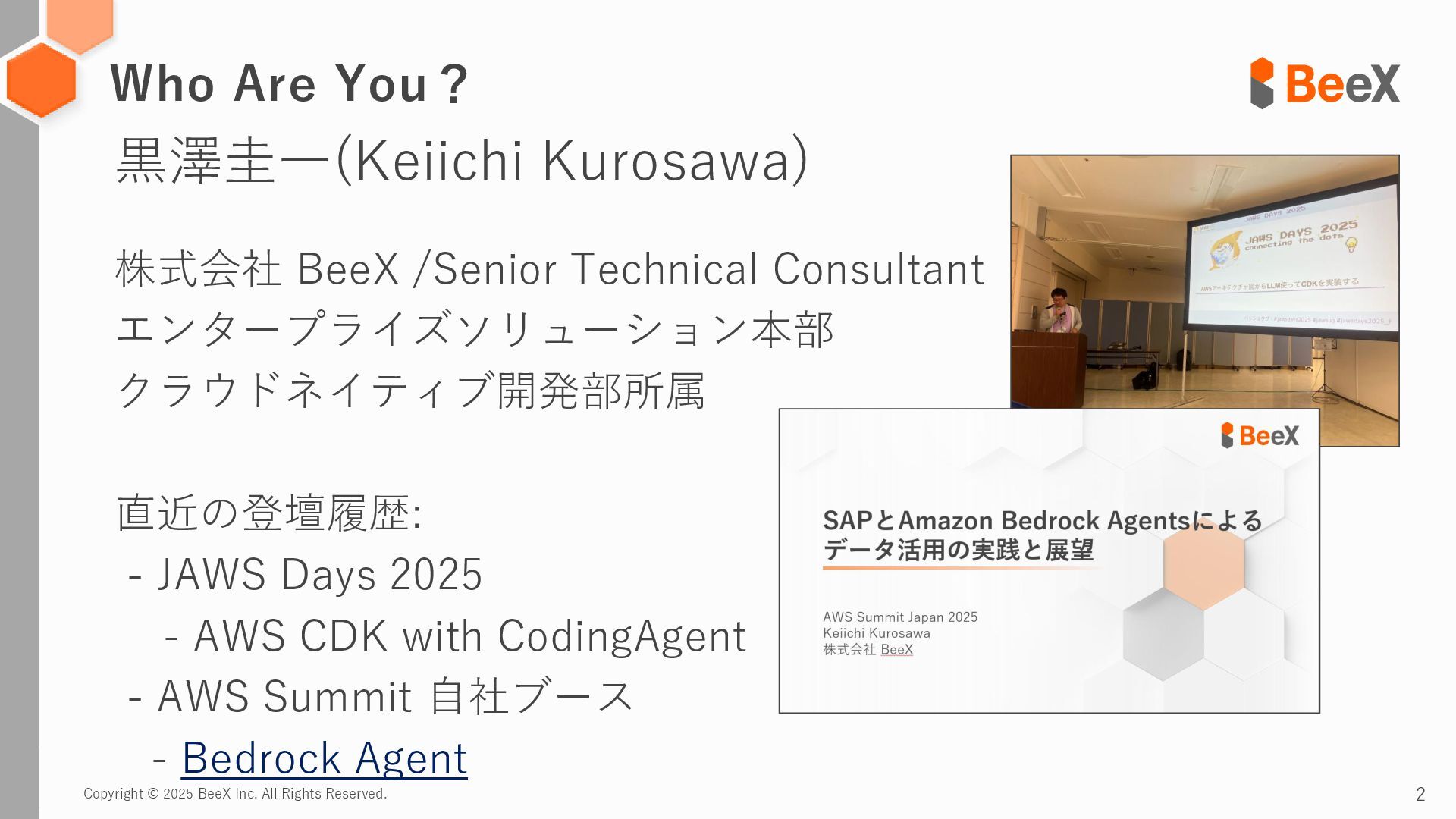 Kurosawa) 株式会社 BeeX /Senior Technical Consultant エンタープライズソリューション本部 クラウドネイティブ開発部所属 直近の登壇履歴: - JAWS Days 2025 - AWS CDK with CodingAgent - AWS Summit 自社ブース - Bedrock Agent Who Are You?