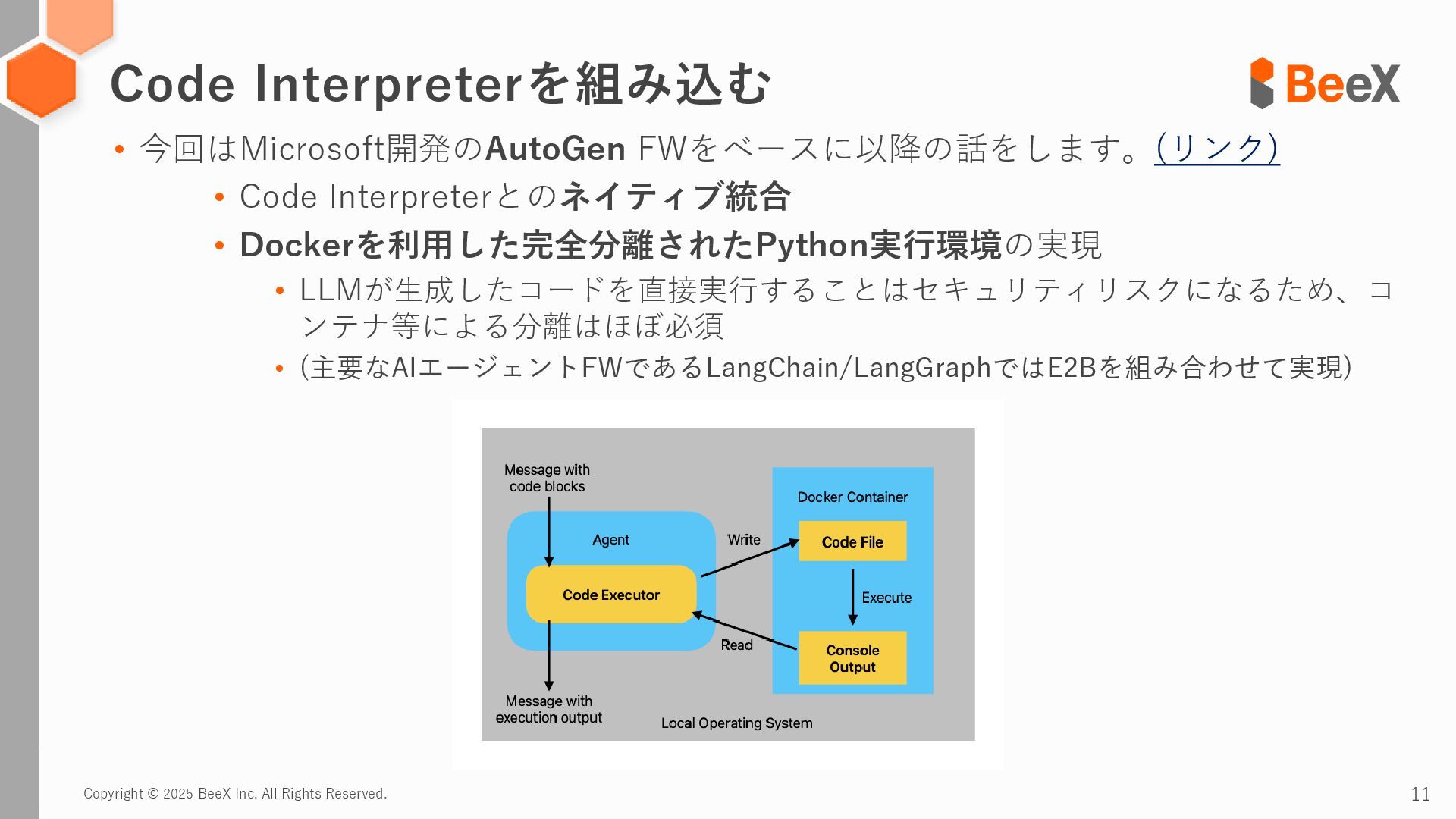 今回はMicrosoft開発のAutoGen FWをベースに以降の話をします。(リンク) • Code Interpreterとのネイティブ統合 • Dockerを利用した完全分離されたPython実行環境の実現 • LLMが生成したコードを直接実行することはセキュリティリスクになるため、コ ンテナ等による分離はほぼ必須 • (主要なAIエージェントFWであるLangChain/LangGraphではE2Bを組み合わせて実現) Code Interpreterを組み込む