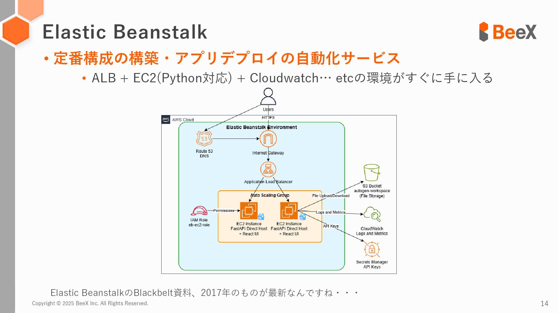 AIエージェントの構成や機能の拡張方法が急激に変化している中で、サービスの変化 にアプリを適用させるのは悪手なのでは?という疑問 • Bedrock AgentではTools部分実装がLambdaだったり、AgentCoreだとエンドポイントの制 約やCode InterpreterをAWS SDK経由での呼び出しだったり(そもそもAgentCoreはまだ Preview) • シンプルなビルディングブロックでAIエージェントアプリを高速に構築し、素早いFBと機 能拡張を行うことのほうがビジネス価値につながる • AIエージェントアプリケーションを動作させられる環境をシンプルに素早く構築可能 • Webアプリケーションを動かすための標準構成(DB含む)を合わせて作れるAWSサービスは 他にない • Amplifyも近いがTSベースのアプリに限られる • コンピューティング、データベース、LBなど複数のビルディングブロックを使用、管理す る必要がある。 なぜElastic Beanstalkなのか