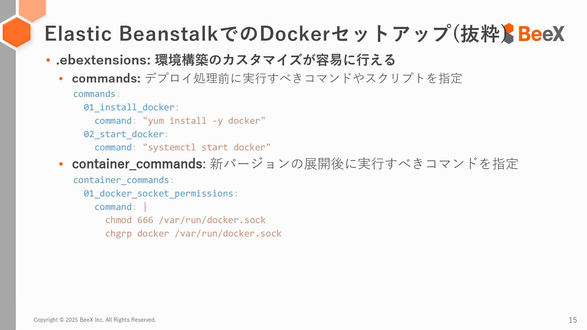 .ebextensions: 環境構築のカスタマイズが容易に行える • commands: デプロイ処理前に実行すべきコマンドやスクリプトを指定 commands: 01_install_docker: command: "yum install -y docker" 02_start_docker: command: "systemctl start docker" • container_commands: 新バージョンの展開後に実行すべきコマンドを指定 container_commands: 01_docker_socket_permissions: command: | chmod 666 /var/run/docker.sock chgrp docker /var/run/docker.sock Elastic BeanstalkでのDockerセットアップ(抜粋)