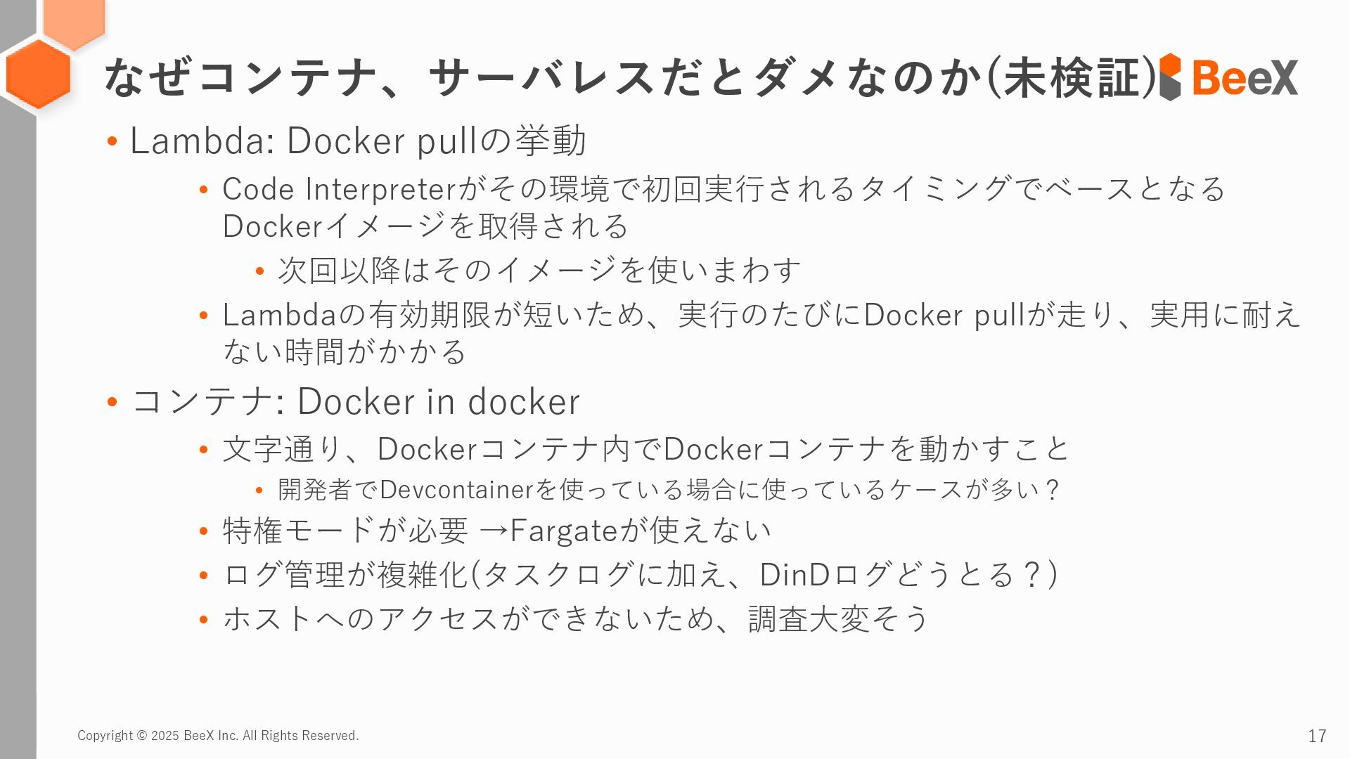 Lambda: Docker pullの挙動 • Code Interpreterがその環境で初回実行されるタイミングでベースとなる Dockerイメージを取得される • 次回以降はそのイメージを使いまわす • Lambdaの有効期限が短いため、実行のたびにDocker pullが走り、実用に耐え ない時間がかかる • コンテナ: Docker in docker • 文字通り、Dockerコンテナ内でDockerコンテナを動かすこと • 開発者でDevcontainerを使っている場合に使っているケースが多い? • 特権モードが必要 →Fargateが使えない • ログ管理が複雑化(タスクログに加え、DinDログどうとる?) • ホストへのアクセスができないため、調査大変そう なぜコンテナ、サーバレスだとダメなのか(未検証)
