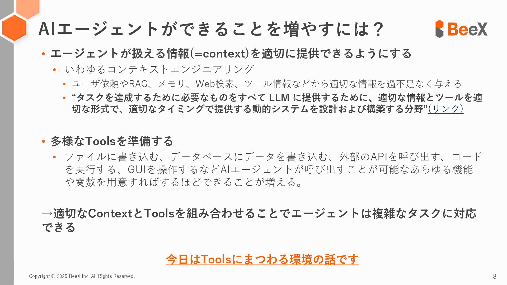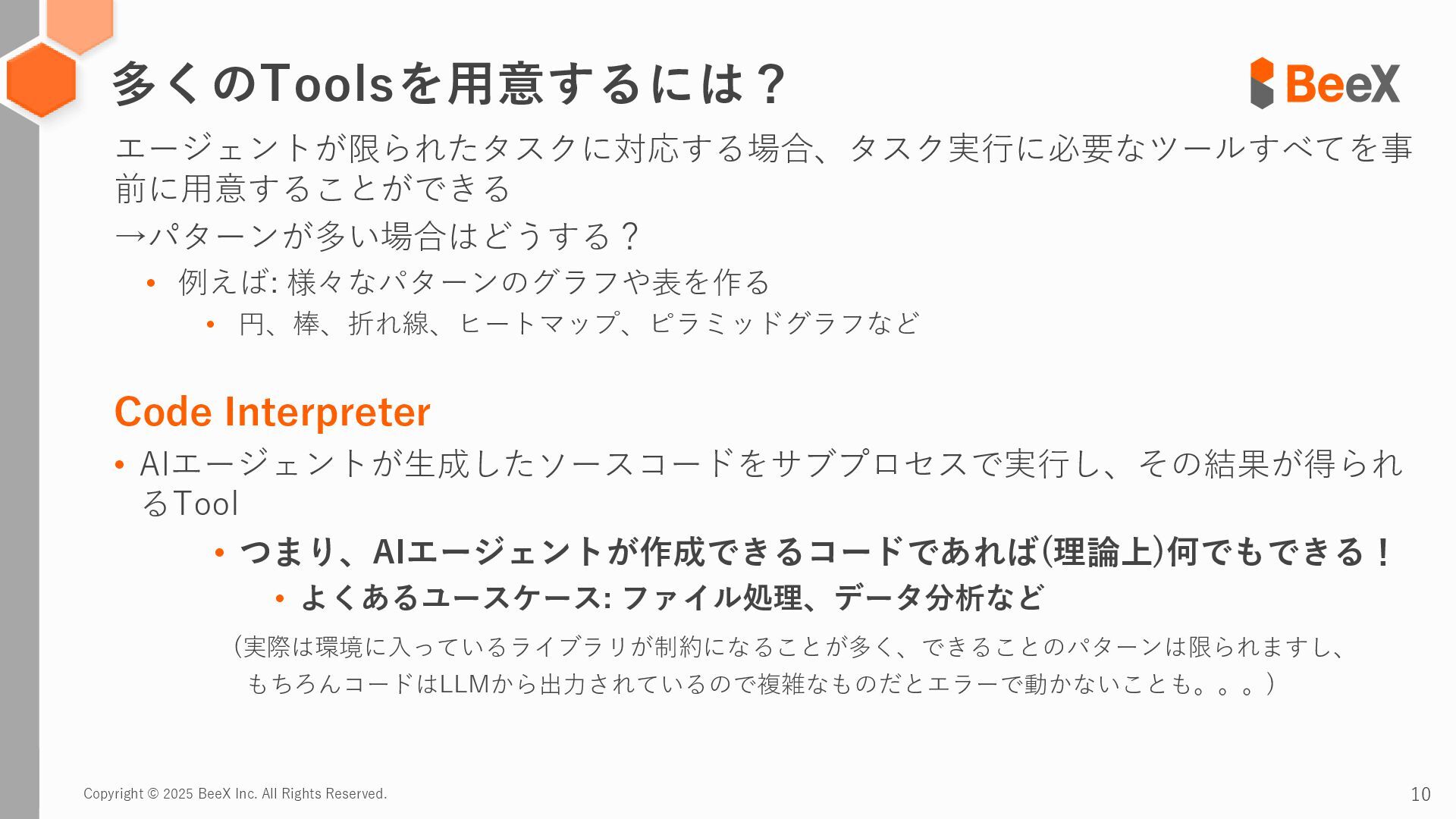 Copyright © 2025 BeeX Inc. All Rights Reserved. 10 エージェントが限られたタスクに対応する場合、タスク実行に必要なツールすべてを事
