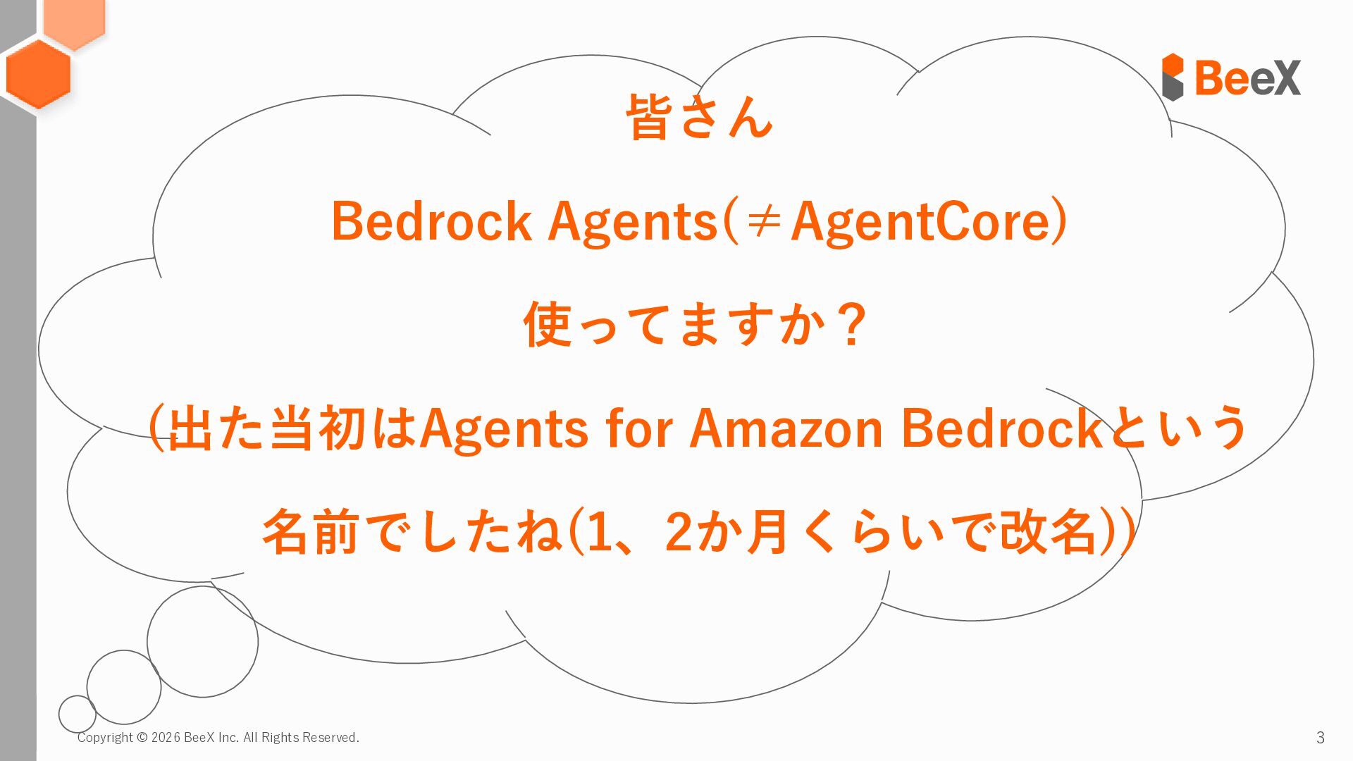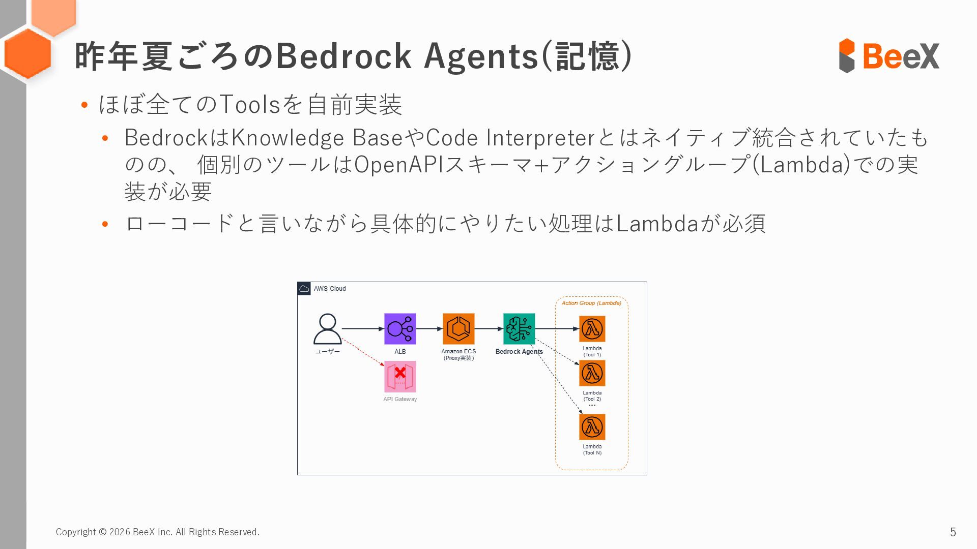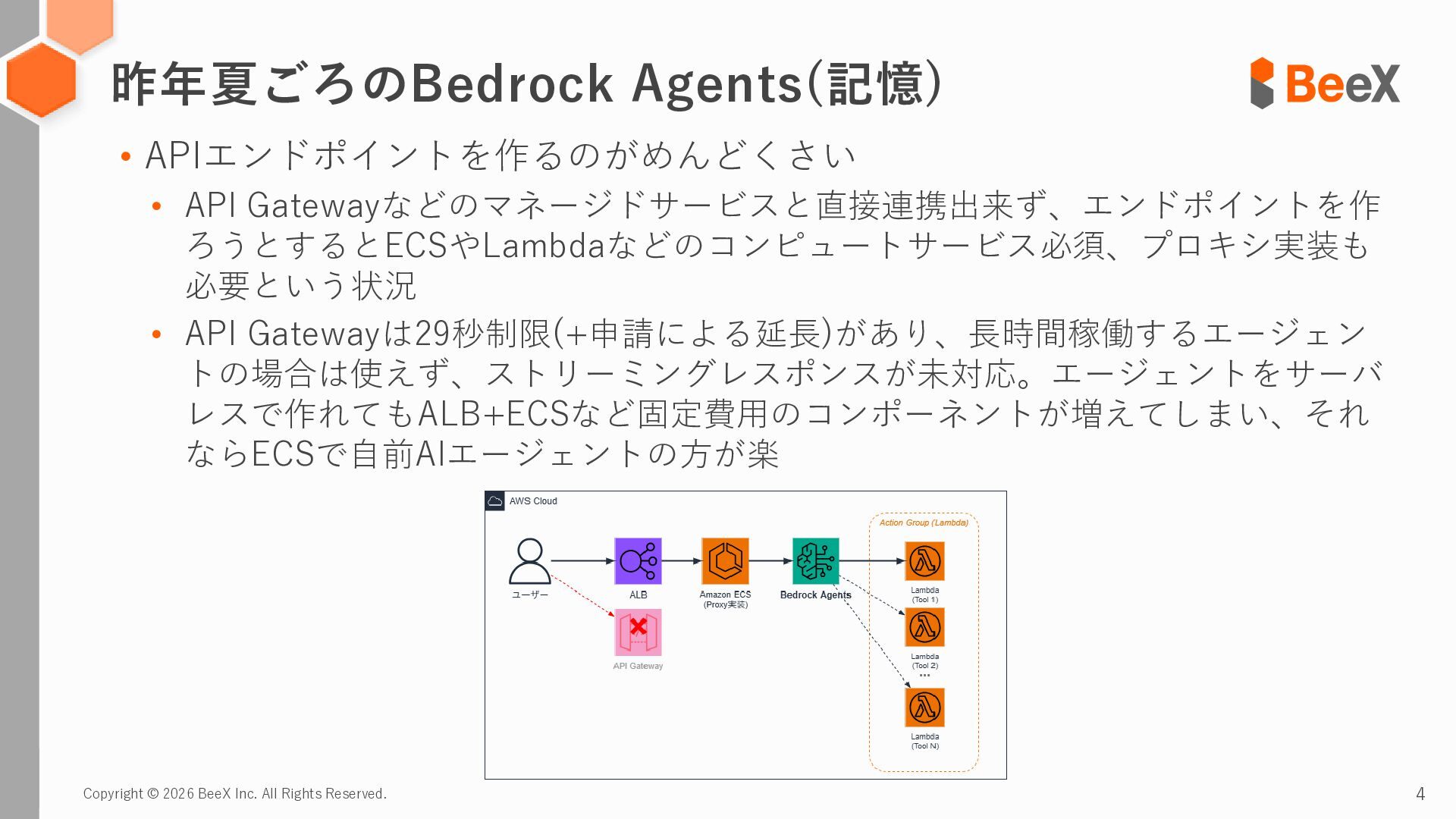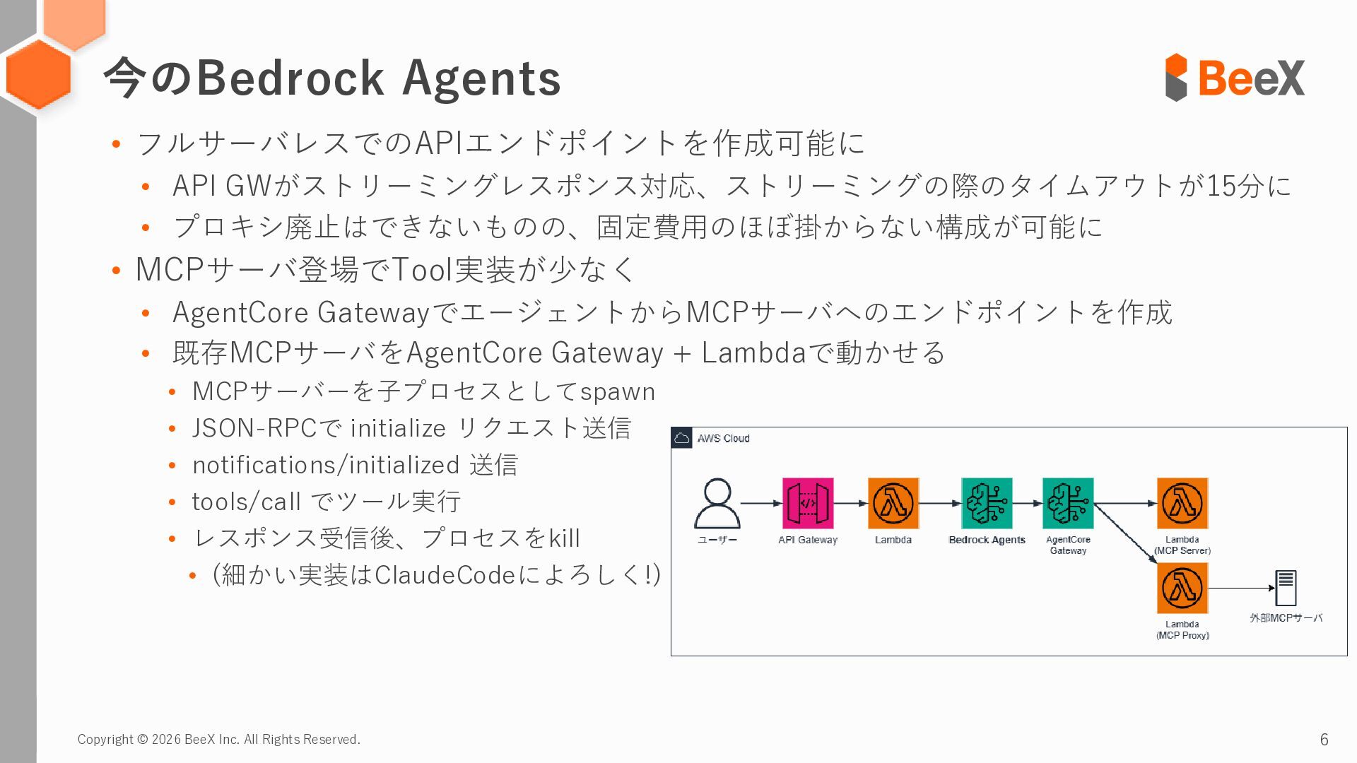 フルサーバレスでのAPIエンドポイントを作成可能に • API GWがストリーミングレスポンス対応、ストリーミングの際のタイムアウトが15分に • プロキシ廃止はできないものの、固定費用のほぼ掛からない構成が可能に • MCPサーバ登場でTool実装が少なく • AgentCore GatewayでエージェントからMCPサーバへのエンドポイントを作成 • 既存MCPサーバをAgentCore Gateway + Lambdaで動かせる • MCPサーバーを子プロセスとしてspawn • JSON-RPCで initialize リクエスト送信 • notifications/initialized 送信 • tools/call でツール実行 • レスポンス受信後、プロセスをkill • (細かい実装はClaudeCodeによろしく!) 今のBedrock Agents