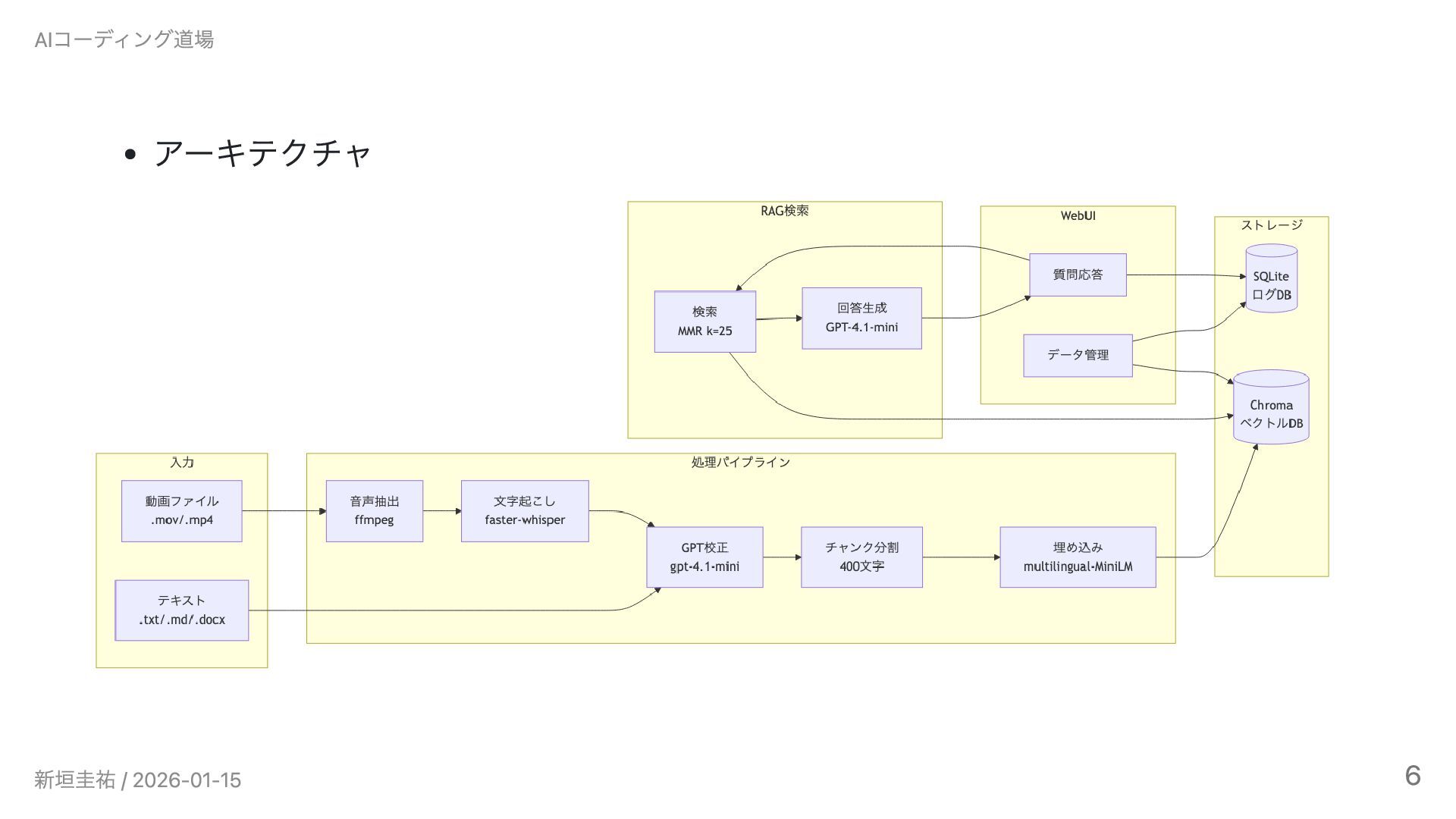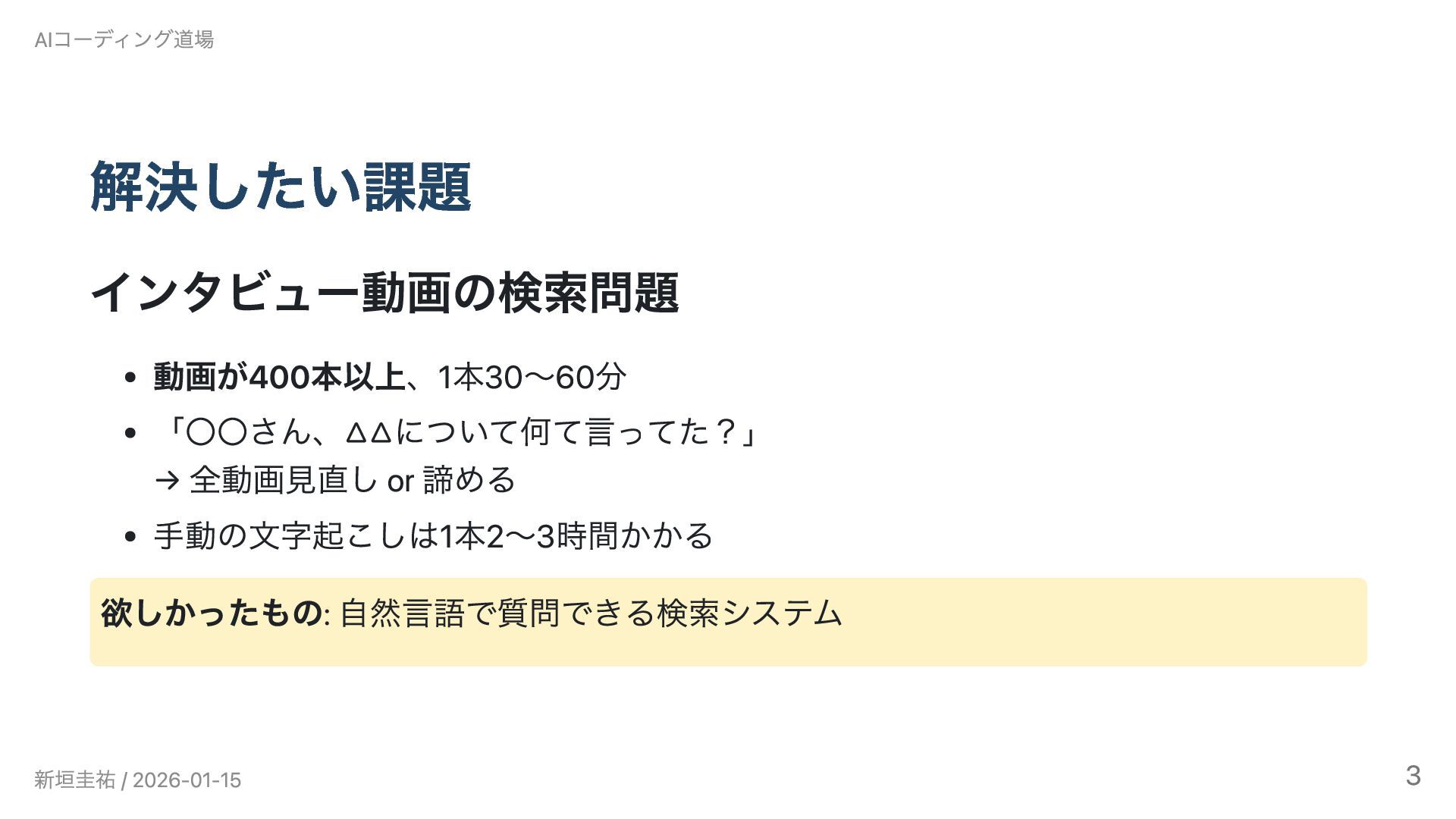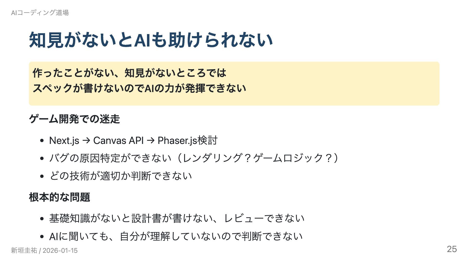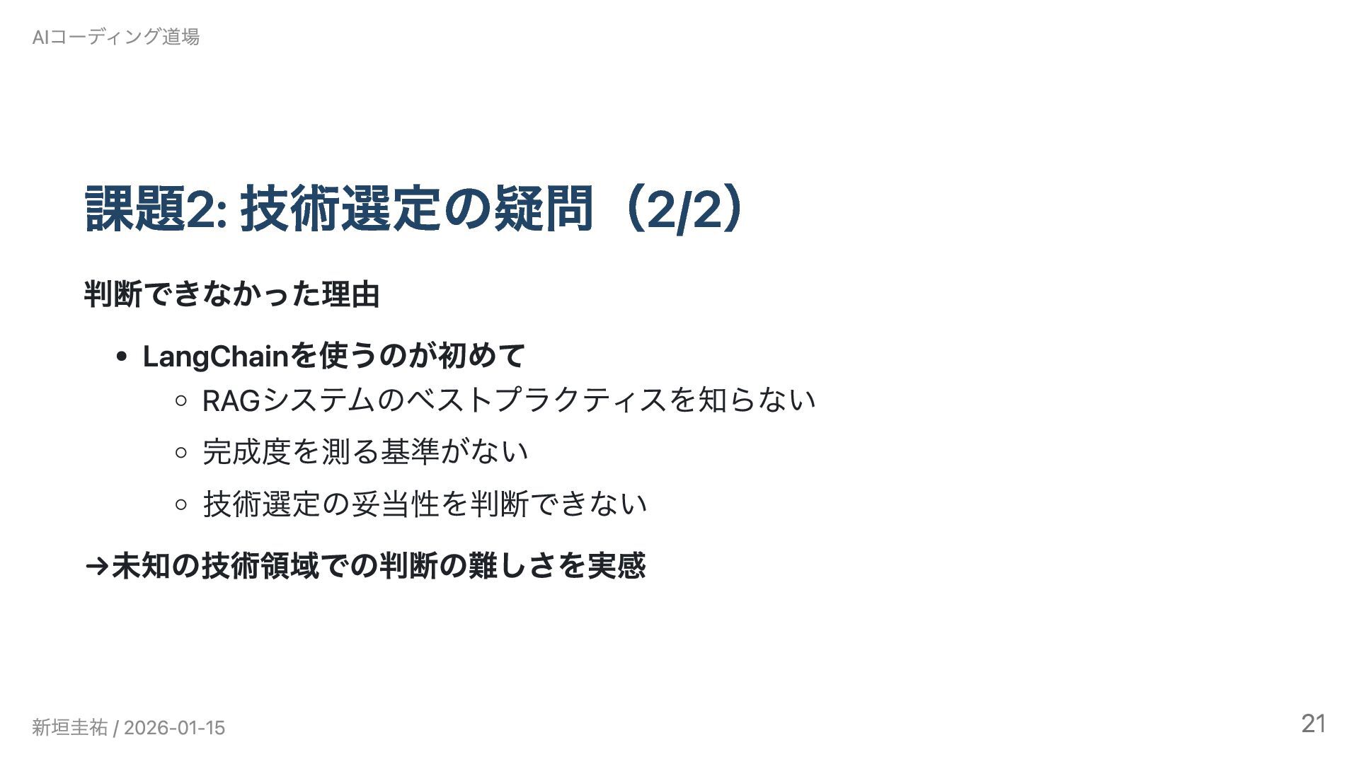 AIコーディング道場勉強会 #6(2026/1/15)の発表資料です。 Claude Codeで3ヶ月間、インタビュー動画のRAGシステムとゲーム開発に挑戦しました。設計書を書くことでAIとの開発が加速した一方、「使われないシステム」という課題から技術選定と課題設定の難しさを実感。既知の技術では大幅に加速できるが、未知の領域では基礎知識がないとAIも助けられないという実践的な知見を共有します。技術スタック: LangChain / faster-whisper / Chroma / GPT-4o-mini / Streamlit / Railway