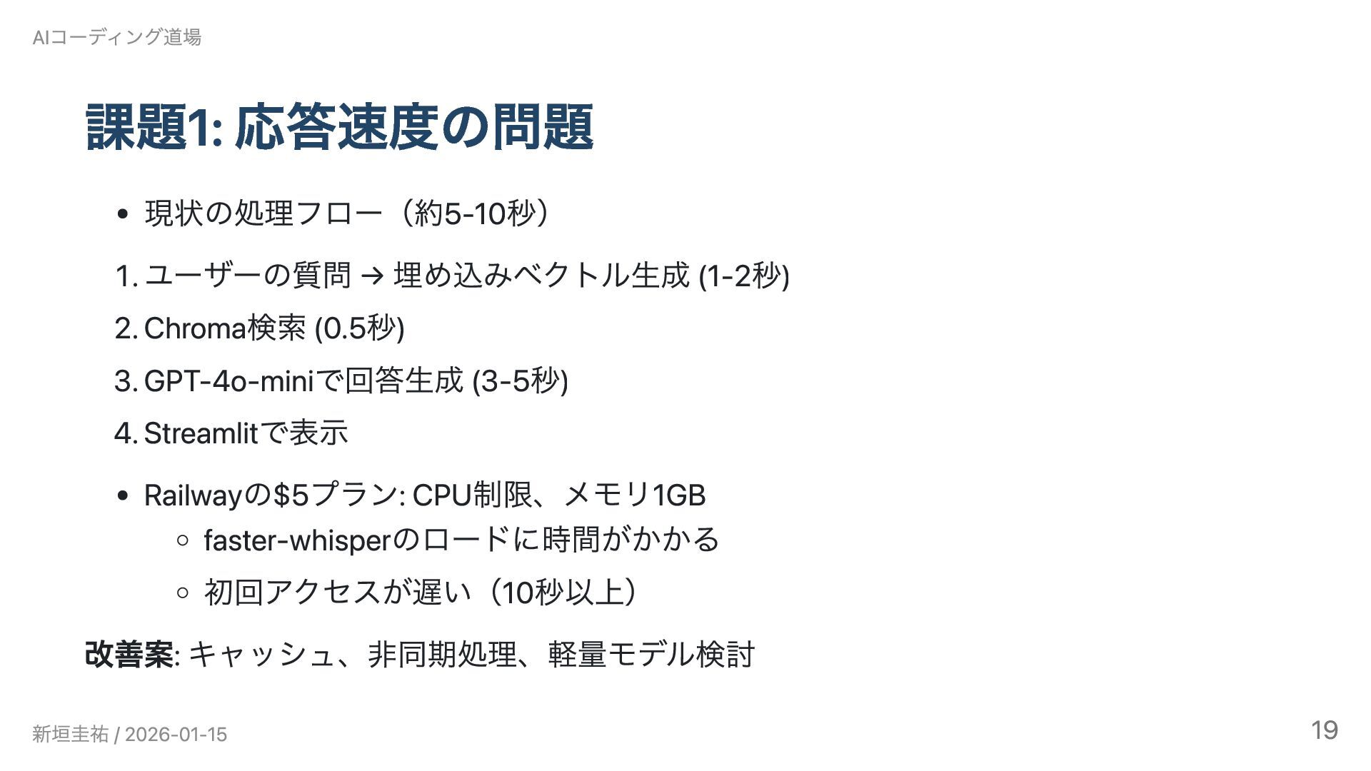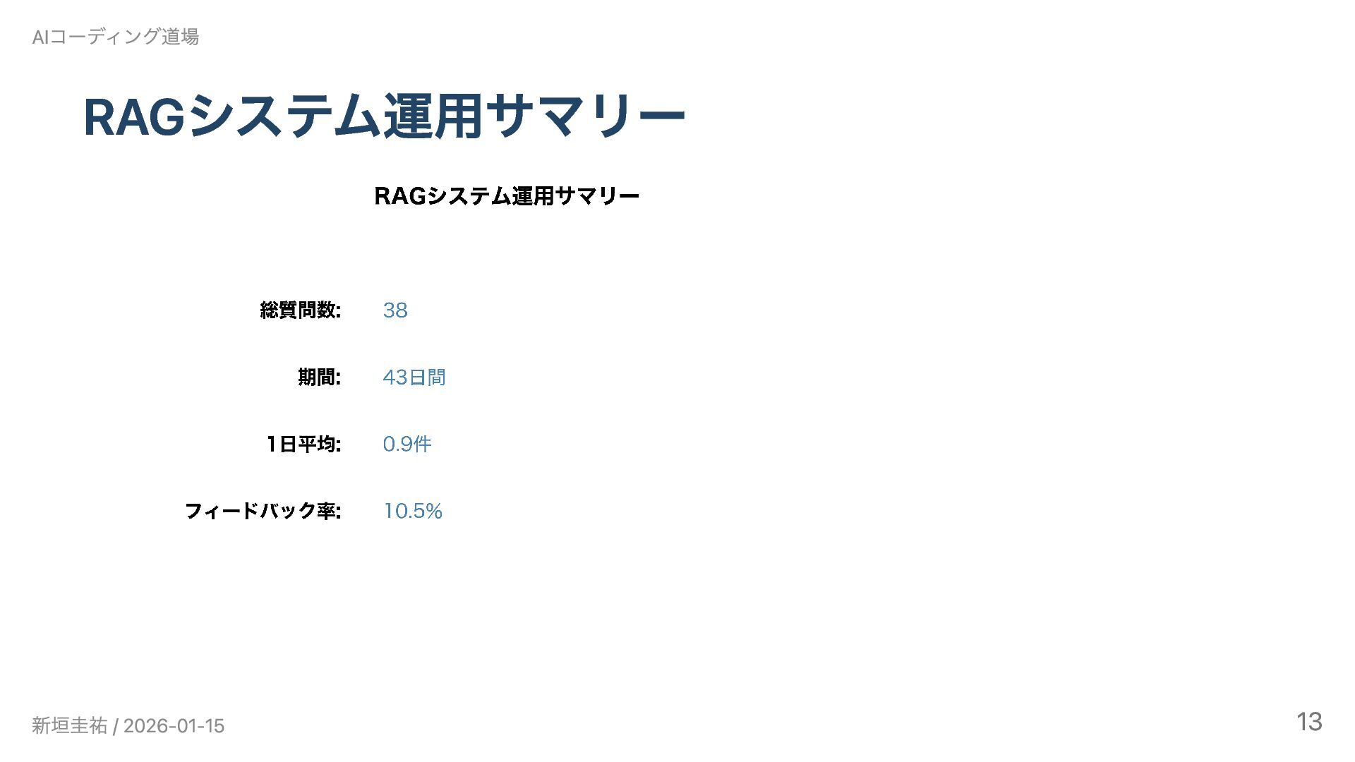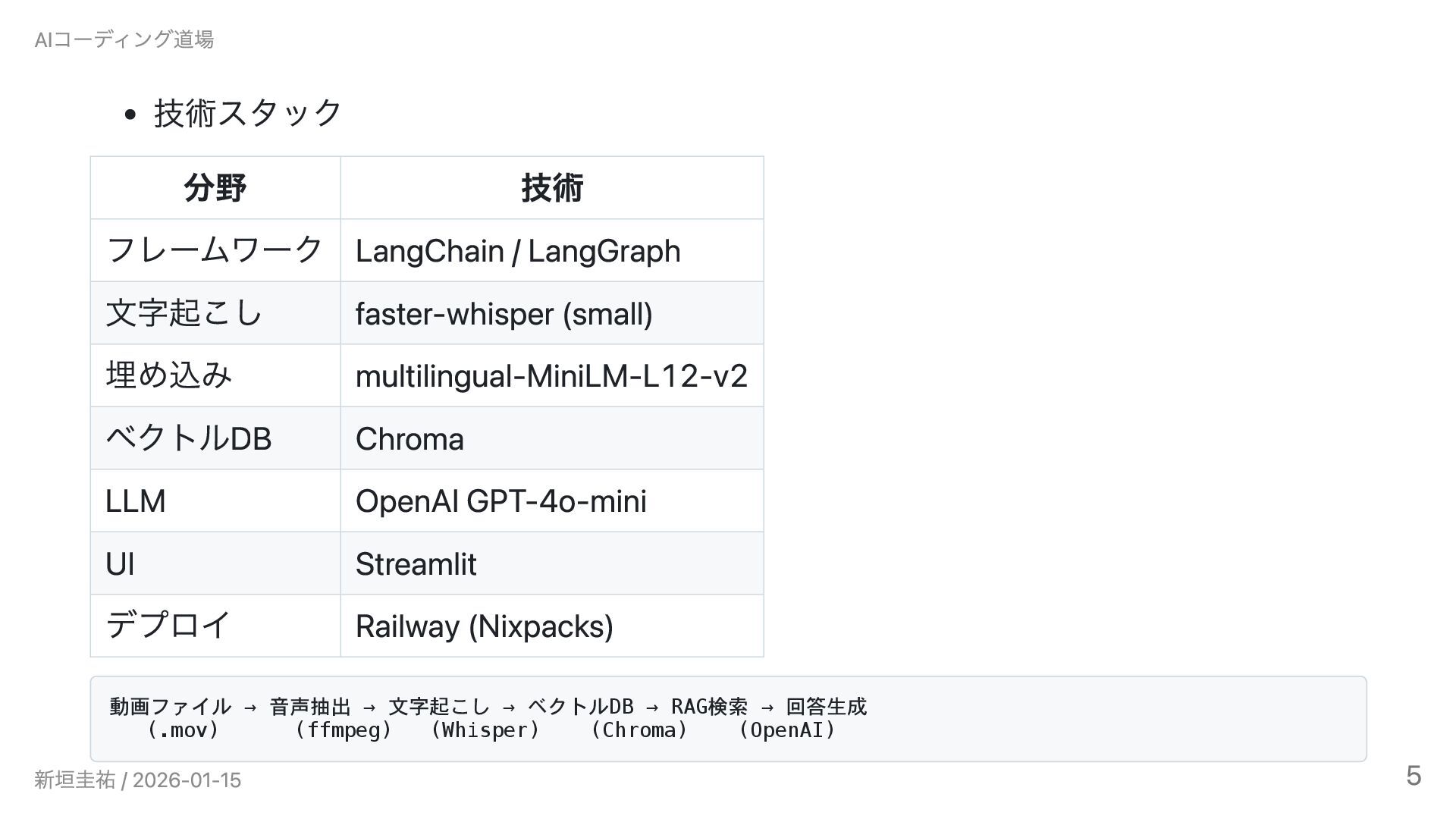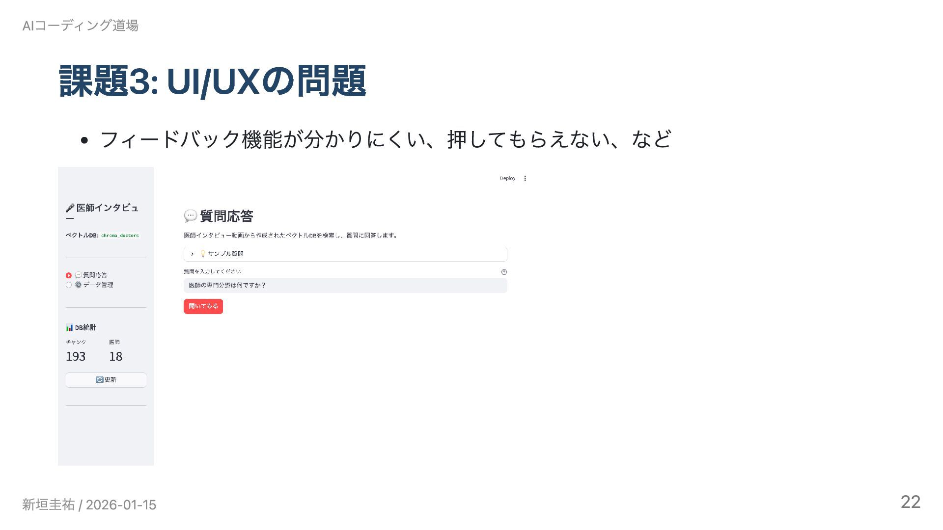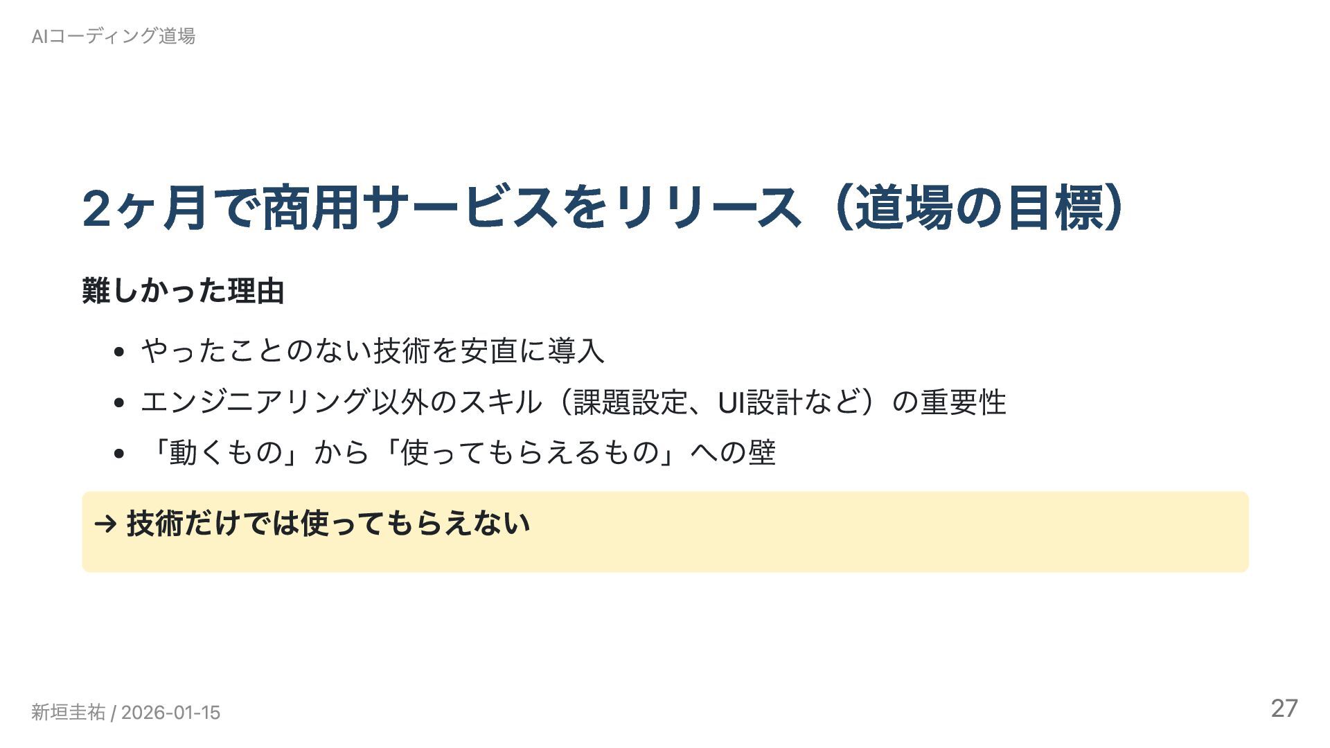 AIコーディング道場勉強会 #6(2026/1/15)の発表資料です。 Claude Codeで3ヶ月間、インタビュー動画のRAGシステムとゲーム開発に挑戦しました。設計書を書くことでAIとの開発が加速した一方、「使われないシステム」という課題から技術選定と課題設定の難しさを実感。既知の技術では大幅に加速できるが、未知の領域では基礎知識がないとAIも助けられないという実践的な知見を共有します。技術スタック: LangChain / faster-whisper / Chroma / GPT-4o-mini / Streamlit / Railway