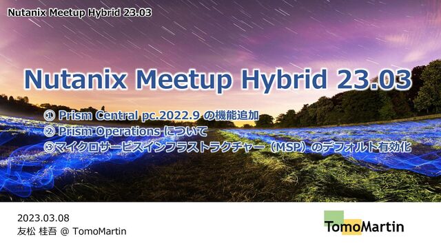 Prism Operations について ③マイクロサービスインフラストラクチャー(MSP)のデフォルト有効化 Nutanix Meetup Hybrid 23.03 2023.03.08 友松 桂吾 @ TomoMartin