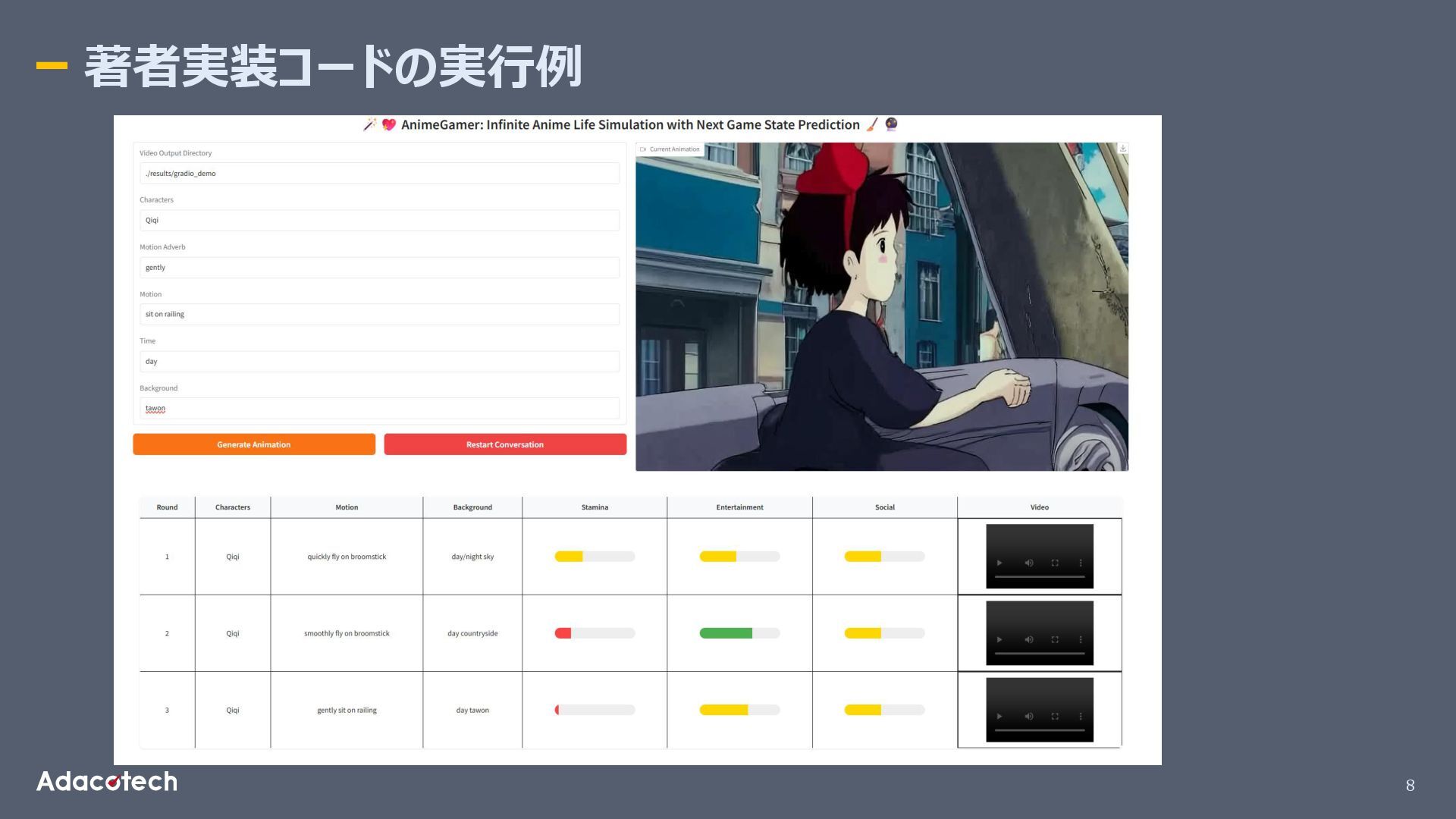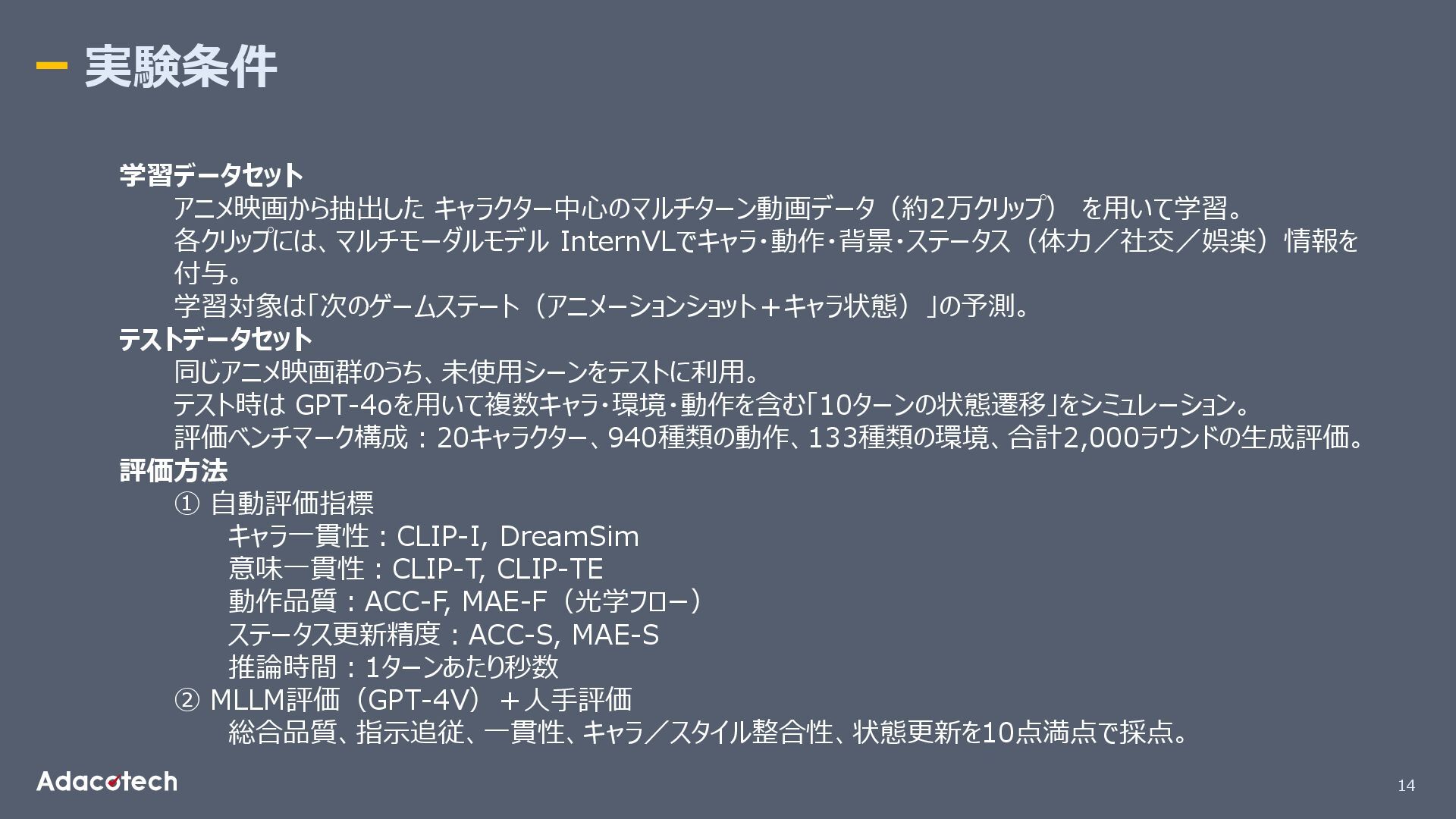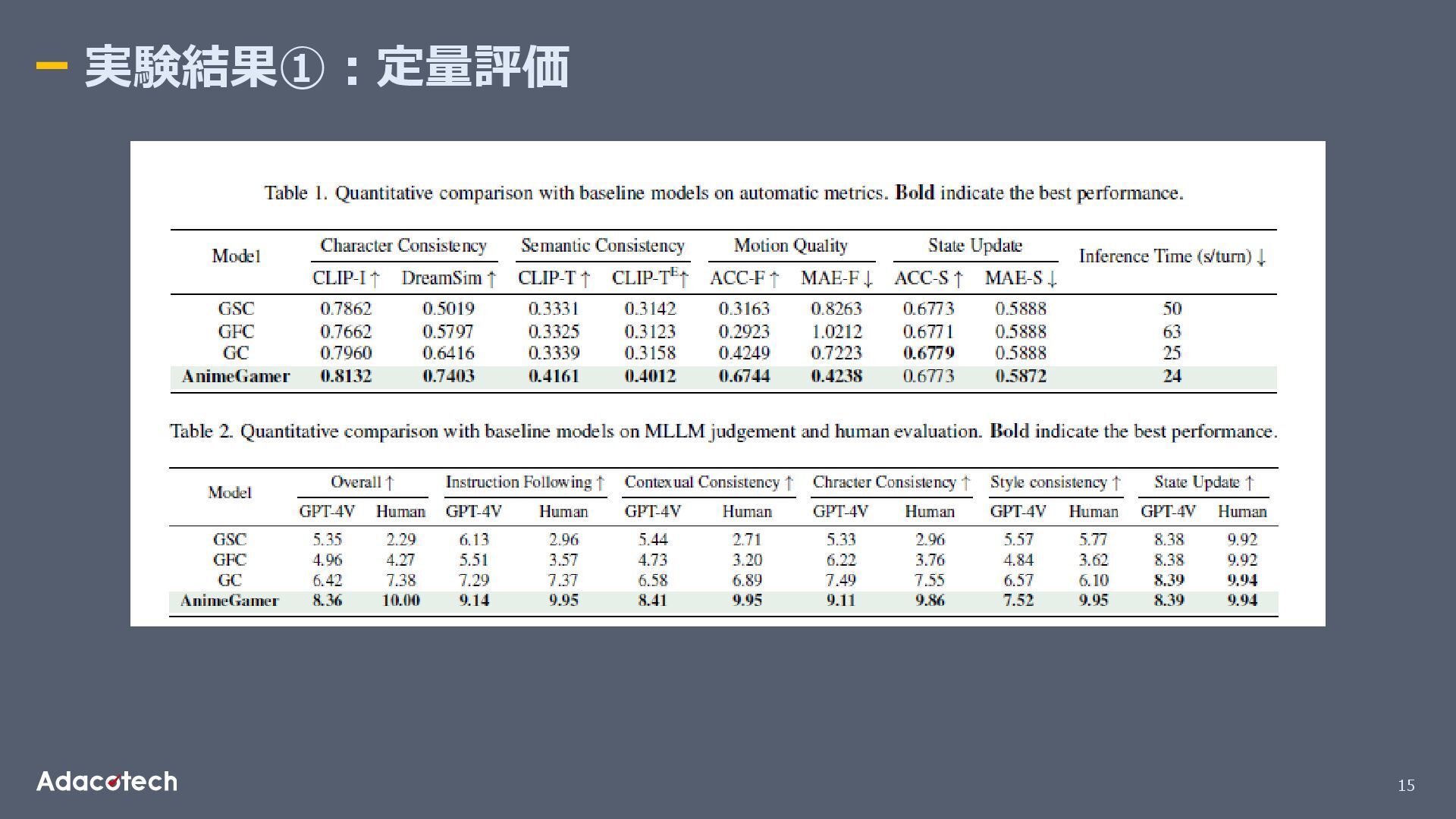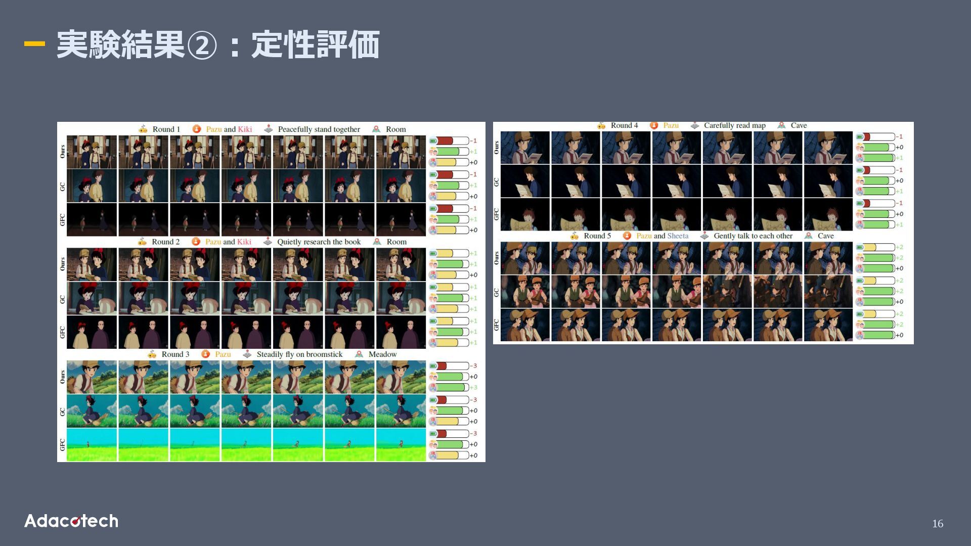 テストデータセット 同じアニメ映画群のうち、未使用シーンをテストに利用。 テスト時は GPT-4oを用いて複数キャラ・環境・動作を含む「10ターンの状態遷移」をシミュレーション。 評価ベンチマーク構成:20キャラクター、940種類の動作、133種類の環境、合計2,000ラウンドの生成評価。 評価方法 ① 自動評価指標 キャラ一貫性:CLIP-I, DreamSim 意味一貫性:CLIP-T, CLIP-TE 動作品質:ACC-F, MAE-F(光学フロー) ステータス更新精度:ACC-S, MAE-S 推論時間:1ターンあたり秒数 ② MLLM評価(GPT-4V)+人手評価 総合品質、指示追従、一貫性、キャラ/スタイル整合性、状態更新を10点満点で採点。