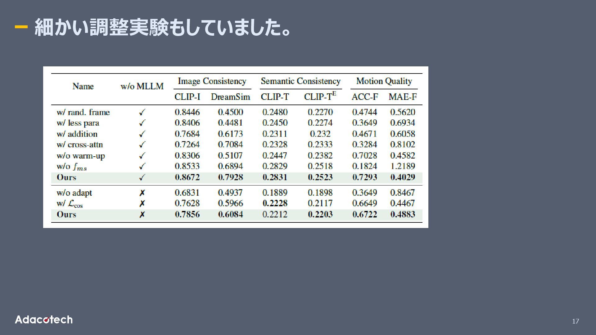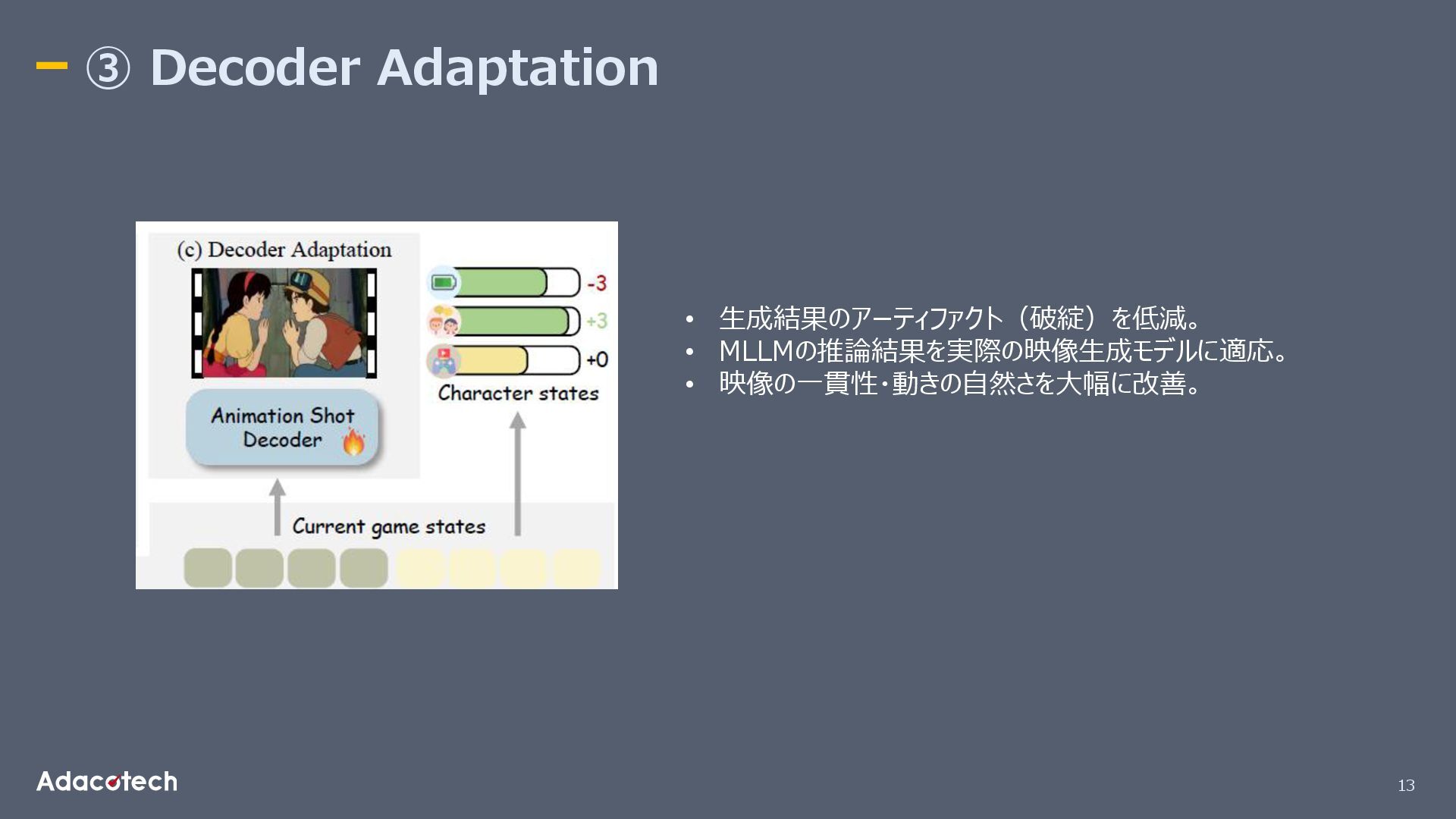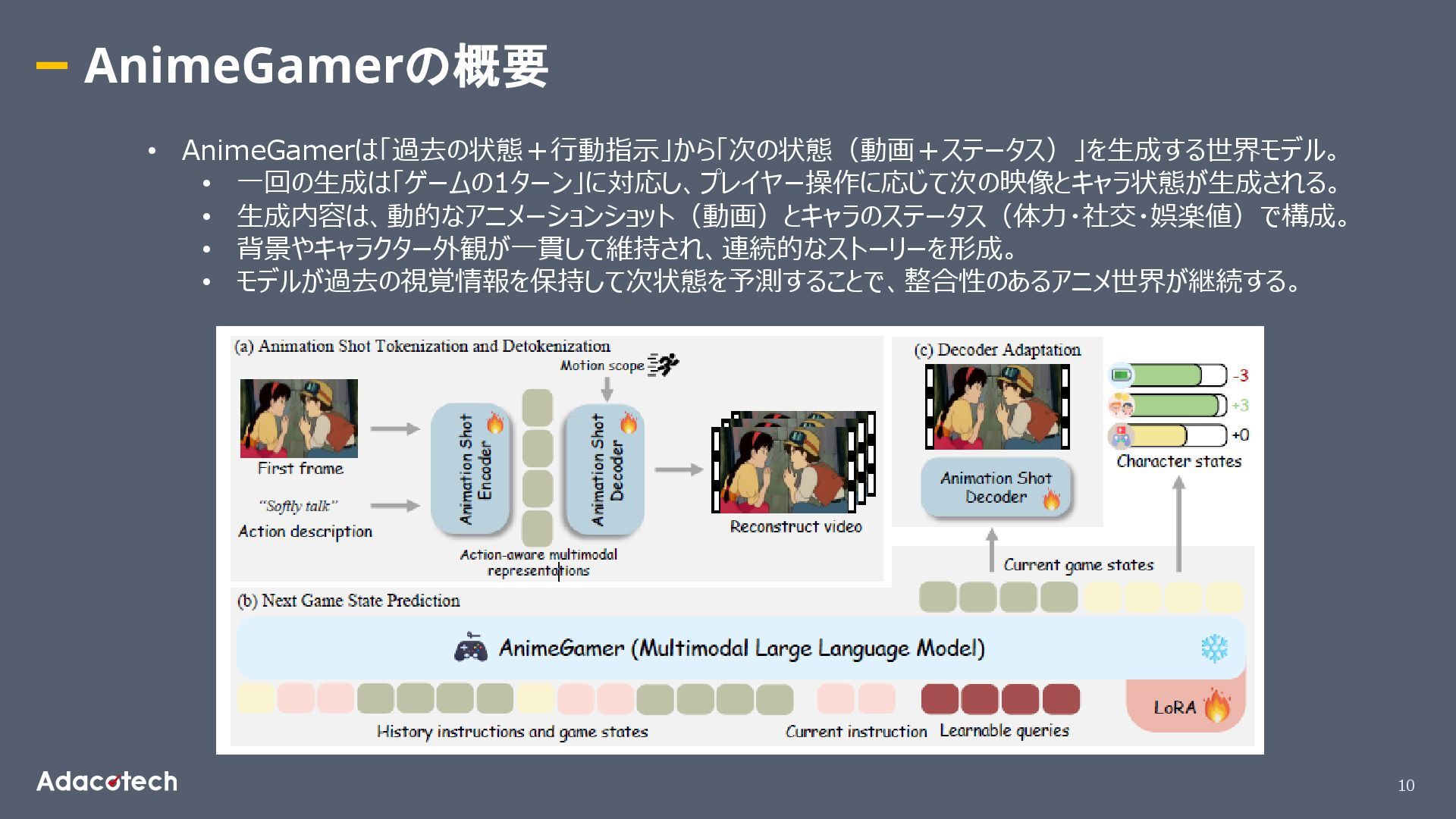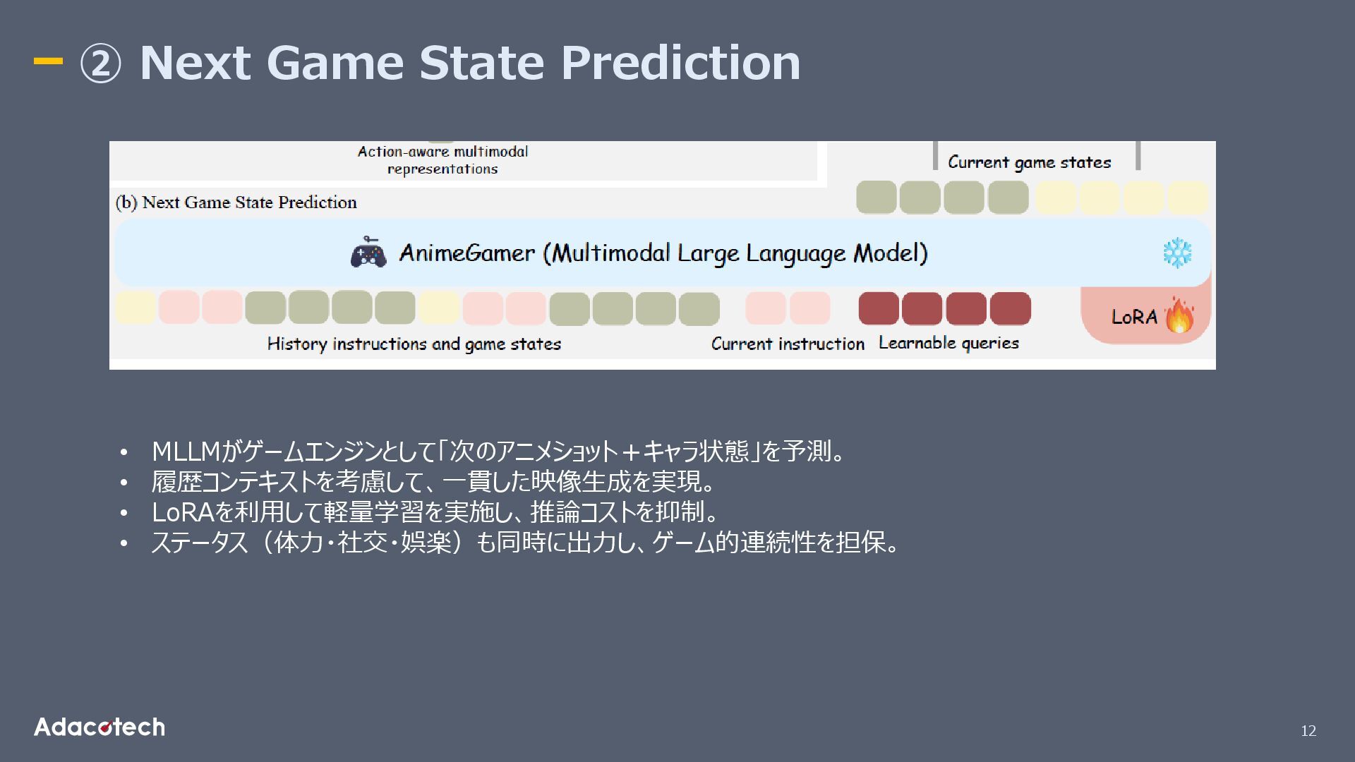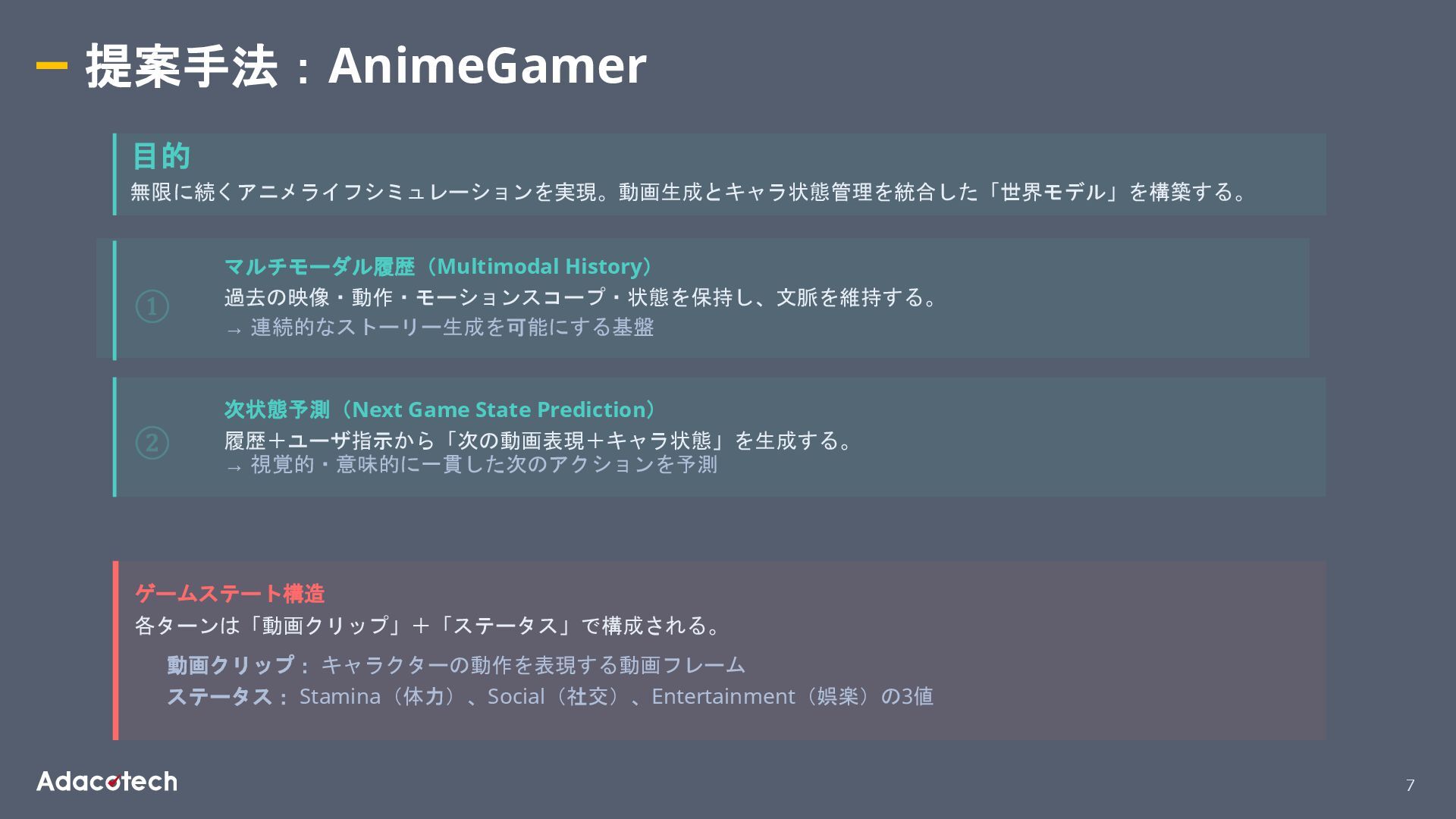 テストデータセット 同じアニメ映画群のうち、未使用シーンをテストに利用。 テスト時は GPT-4oを用いて複数キャラ・環境・動作を含む「10ターンの状態遷移」をシミュレーション。 評価ベンチマーク構成:20キャラクター、940種類の動作、133種類の環境、合計2,000ラウンドの生成評価。 評価方法 ① 自動評価指標 キャラ一貫性:CLIP-I, DreamSim 意味一貫性:CLIP-T, CLIP-TE 動作品質:ACC-F, MAE-F(光学フロー) ステータス更新精度:ACC-S, MAE-S 推論時間:1ターンあたり秒数 ② MLLM評価(GPT-4V)+人手評価 総合品質、指示追従、一貫性、キャラ/スタイル整合性、状態更新を10点満点で採点。