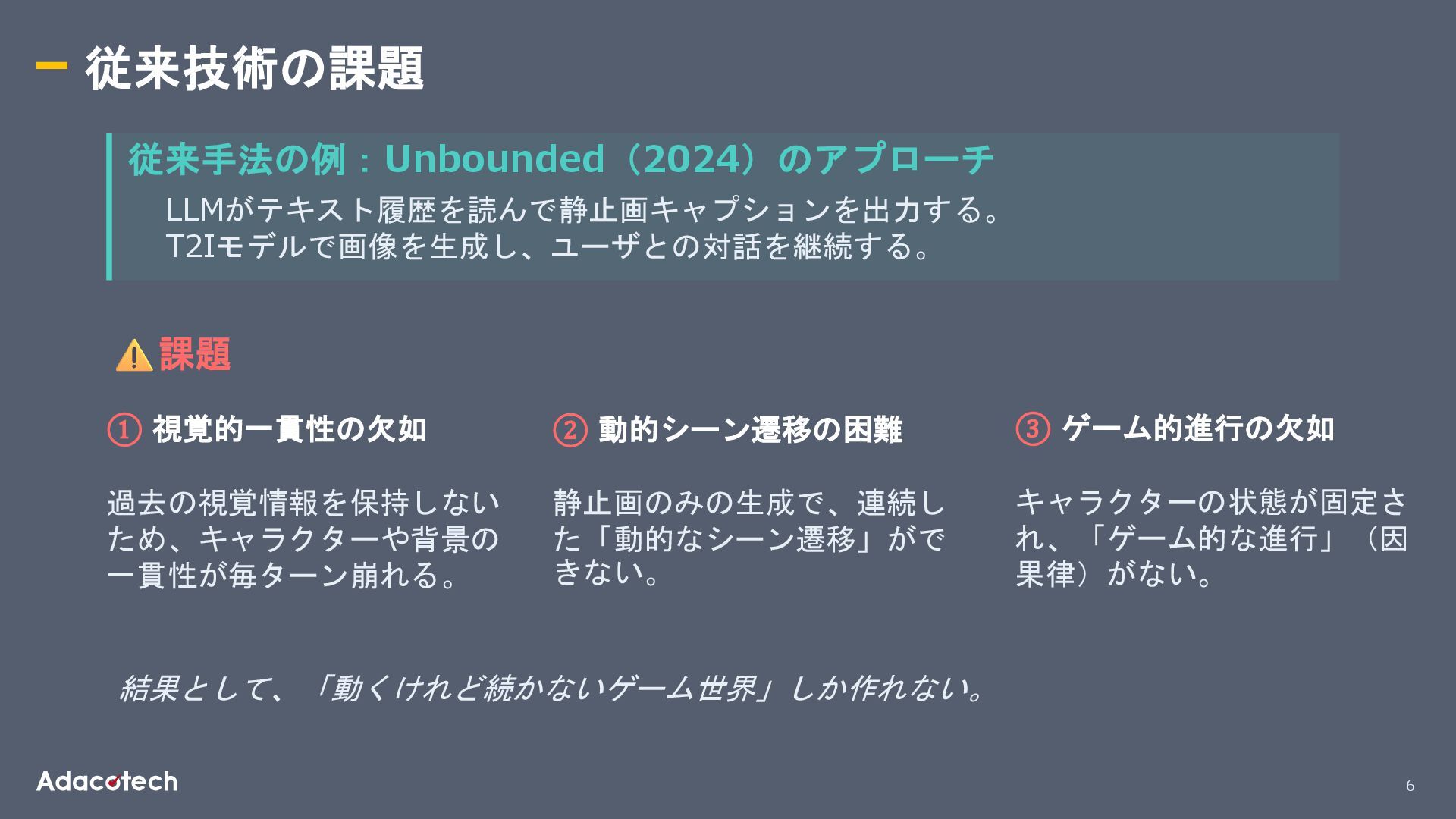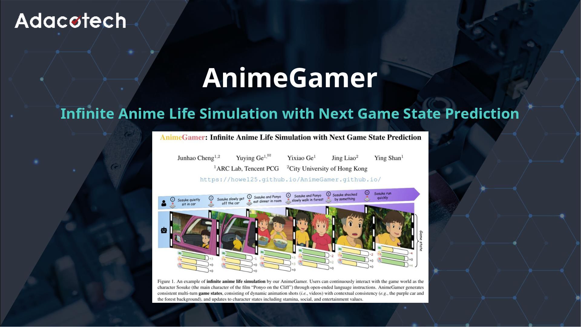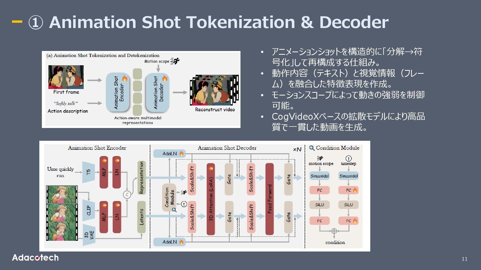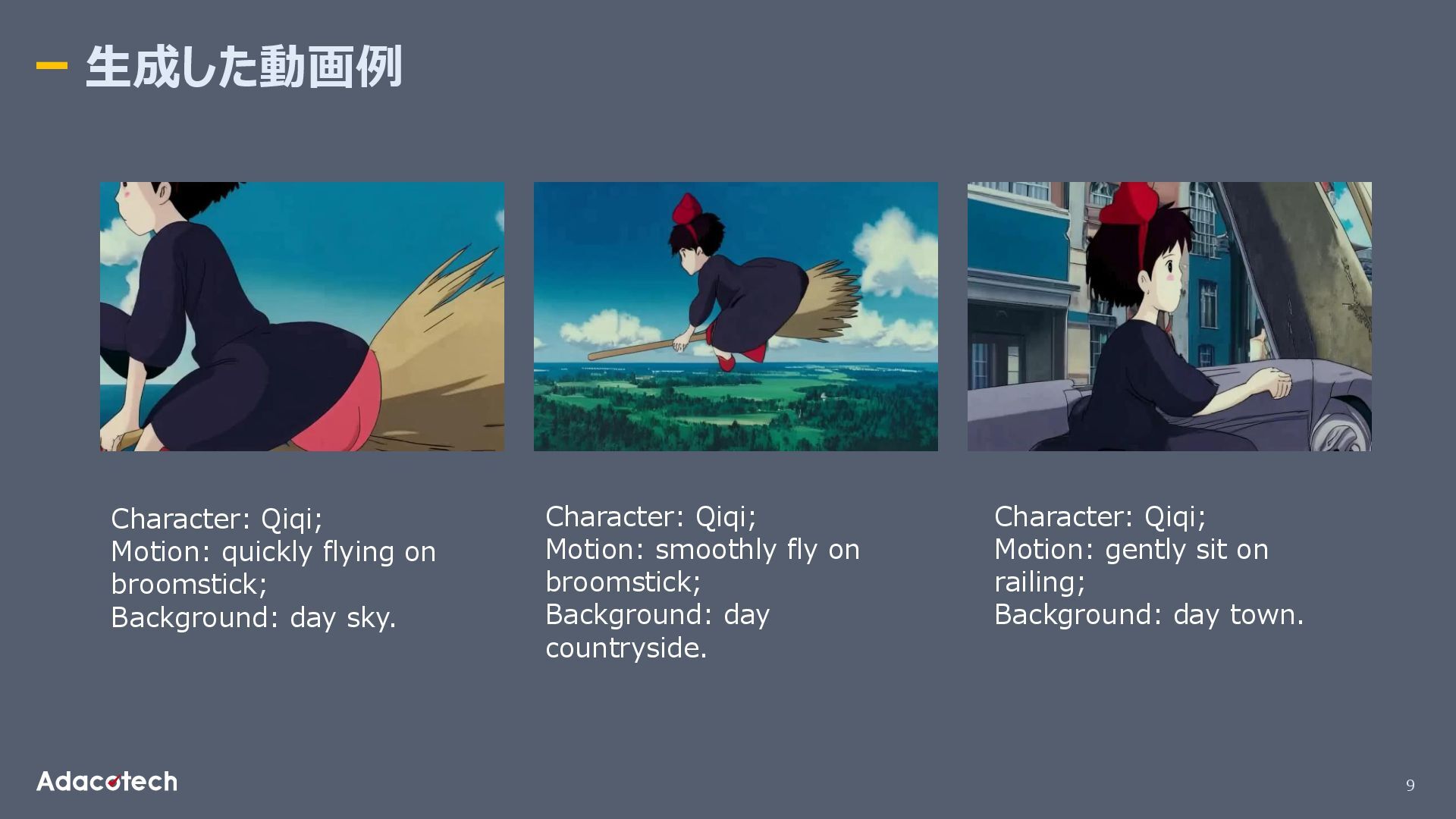 テストデータセット 同じアニメ映画群のうち、未使用シーンをテストに利用。 テスト時は GPT-4oを用いて複数キャラ・環境・動作を含む「10ターンの状態遷移」をシミュレーション。 評価ベンチマーク構成:20キャラクター、940種類の動作、133種類の環境、合計2,000ラウンドの生成評価。 評価方法 ① 自動評価指標 キャラ一貫性:CLIP-I, DreamSim 意味一貫性:CLIP-T, CLIP-TE 動作品質:ACC-F, MAE-F(光学フロー) ステータス更新精度:ACC-S, MAE-S 推論時間:1ターンあたり秒数 ② MLLM評価(GPT-4V)+人手評価 総合品質、指示追従、一貫性、キャラ/スタイル整合性、状態更新を10点満点で採点。