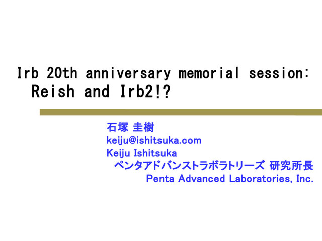 Irbは今年で生まれて20年になります. それを記念してReishとIrbの次世代の話をします. ReishはRubyistのためのshellで, Rubyの機能を実現しています. また, Ruby操作から自然にshell操作に変換可能な言語です. Reishは現在開発中です. ReishはIrbと使い方が似ていて, その開発からいろいろな知見を得ることができます。それを基にIrbの次世代の構想をお話しします.