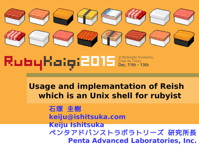 Reish is an Unix shell for Rubyist. It was a language that was realized Ruby in the syntax of the shell. I will introduce usage and implementation of Reish.
