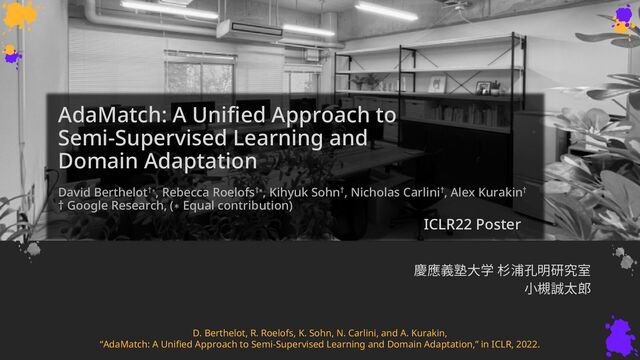 David Berthelot†∗, Rebecca Roelofs†∗, Kihyuk Sohn†, Nicholas Carlini†, Alex Kurakin† † Google Research, (∗ Equal contribution) 慶應義塾大学 杉浦孔明研究室 小槻誠太郎 ICLR22 Poster D. Berthelot, R. Roelofs, K. Sohn, N. Carlini, and A. Kurakin, “AdaMatch: A Unified Approach to Semi-Supervised Learning and Domain Adaptation,” in ICLR, 2022.