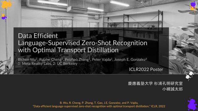 Wu1, Ruizhe Cheng2, Peizhao Zhang1, Peter Vajda1, Joseph E. Gonzalez2 1: Meta Reality Labs, 2: UC Berkeley 慶應義塾大学 杉浦孔明研究室 小槻誠太郎 ICLR2022 Poster B. Wu, R. Cheng, P. Zhang, T. Gao, J.E. Gonzalez, and P. Vajda, “Data efficient language-supervised zero-shot recognition with optimal transport distillation,” ICLR, 2022