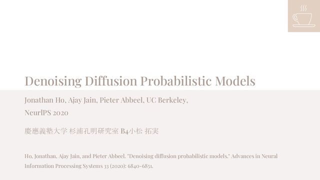 潜在変数モデル GANs GAN[GoodFellow+, NIPS14] 最尤推定を用いず、生成器と識別器を競 合させることで学習を行う 自己回帰モデル PixelRNN[A. Oord+, ICML16] 過去の出力結果を条件に新しいデータを 次々に出力するモデル 正規化フロー NICE[L.Dinh+, ICLR15] 簡単な分布に対し、可逆変換を繰り返し適 用することで目的の分布を得るモデル VQ-VAE-2[Ali+, NeurIPS19] Big GAN[Andrew+, ICLR19] Glow[Diederik+, NeurIPS18]