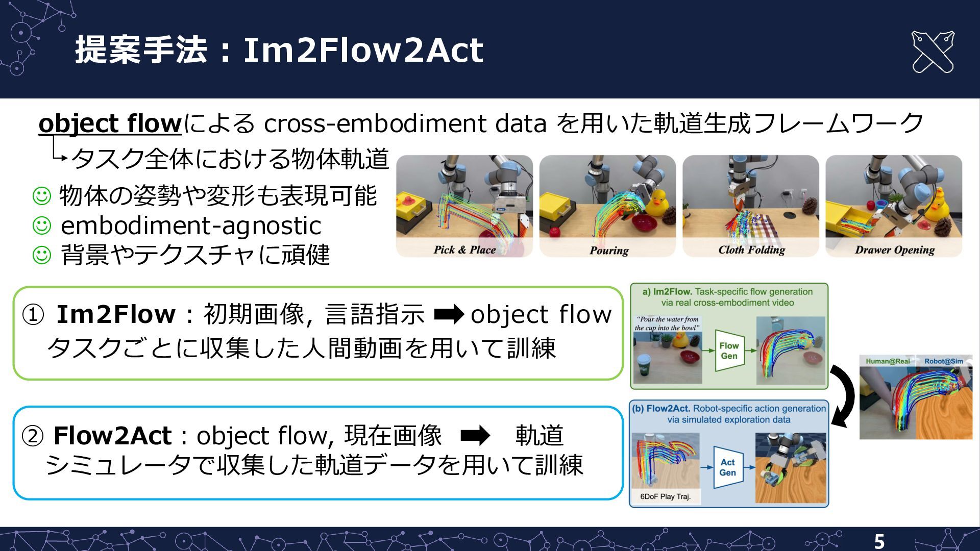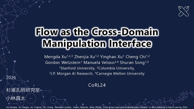 Manuela Veloso3,4 Shuran Song1,2 1Stanford University, 2Columbia University, 3J.P. Morgan AI Research, 4Carnegie Mellon University Flow as the Cross-Domain Manipulation Interface 2026 ææµŠåæç 究宀 å°æè倪 Xu, Mengda., Xu, Zhenjia., Xu, Yinghao., Chi, Cheng., Wetzstein, Gordon., Veloso, Manuela., Song, Shuran. âFlow as the Cross-domain Manipulation Interfaceâ. In 8th Conference of Robot Learning, 2024. CoRL24