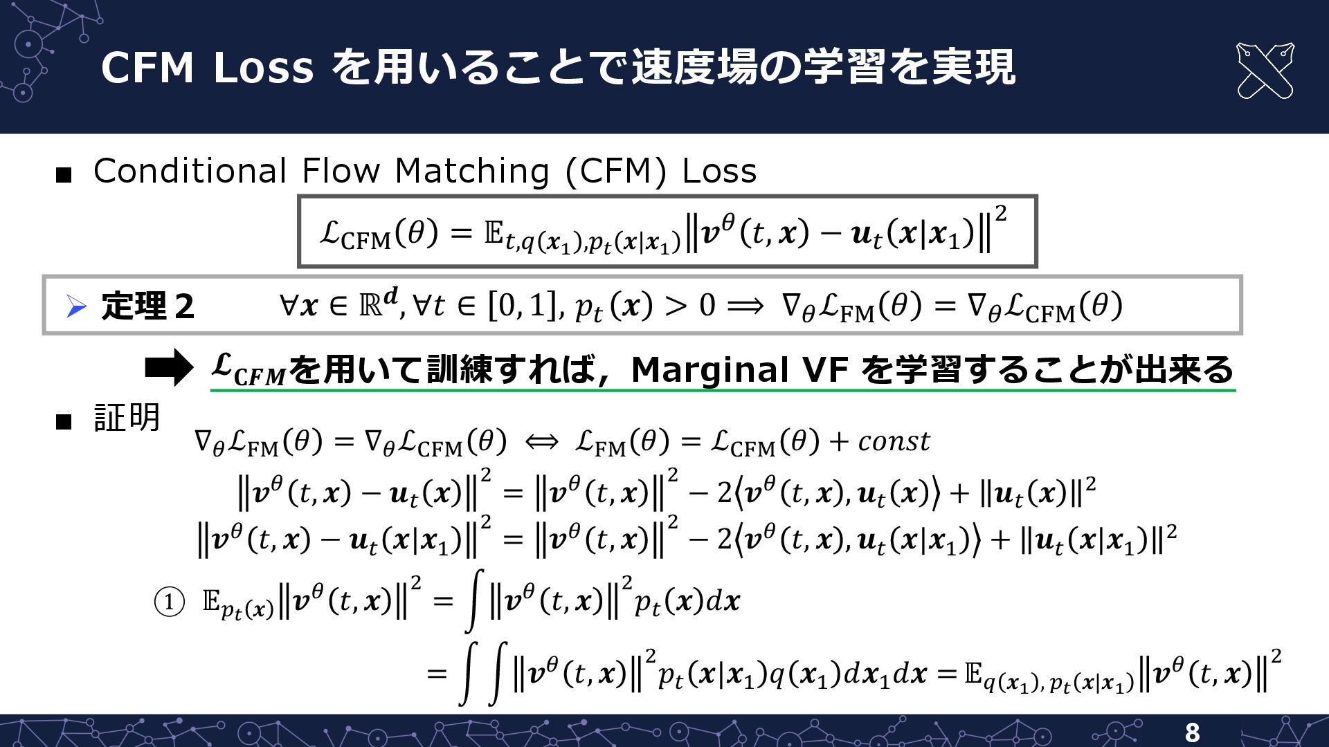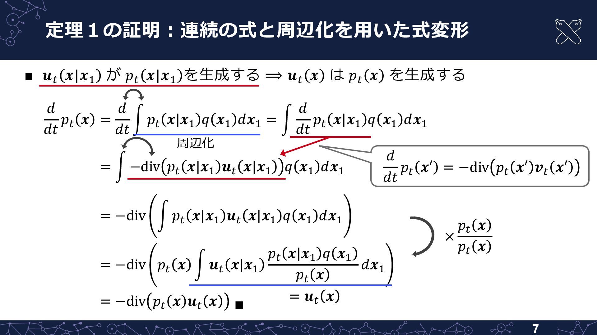 𝒗& 𝑡, 𝒙 , 𝒖% 𝒙 = & 𝒗& 𝑡, 𝒙 , 𝒖% 𝒙 , ∫ 𝒖% 𝒙|𝒙( 𝑝% 𝒙|𝒙( 𝑞 𝒙( 𝑑𝒙( 𝑝% 𝒙 𝑝% 𝒙 𝑑𝒙 = & 𝒗& 𝑡, 𝒙 , 𝒖% 𝒙 , & 𝒖% 𝒙|𝒙( 𝑝% 𝒙|𝒙( 𝑞 𝒙( 𝑑𝒙( 𝑑𝒙 = & & 𝒗& 𝑡, 𝒙 , 𝒖% 𝒙 , 𝒖% 𝒙|𝒙( 𝑝% 𝒙|𝒙( 𝑞 𝒙( 𝑑𝒙( 𝑑𝒙 = 𝔼, 𝒙" , *# 𝒙|𝒙" 𝒗& 𝑡, 𝒙 , 𝒖% 𝒙|𝒙( ② 𝒖% 𝒙 ', 𝒖% 𝒙|𝒙( ' は 𝜃 に⾮依存 ⟹ ③ ①, ②, ③ より, ℒ#) 𝜃 = ℒ!#) 𝜃 + 𝑐𝑜𝑛𝑠𝑡 ∎ 𝔼*# 𝒙 𝒖% 𝒙 ', 𝔼, 𝒙" , *# 𝒙|𝒙" 𝒖% 𝒙|𝒙( ' は定数