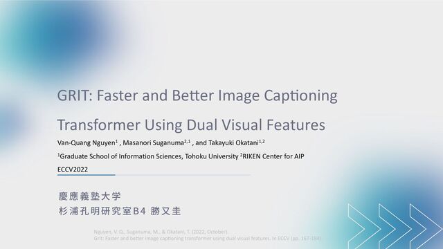 Features B4 Van-Quang Nguyen1 , Masanori Suganuma2,1 , and Takayuki Okatani1,2 1Graduate School of Information Sciences, Tohoku University 2RIKEN Center for AIP ECCV2022 Nguyen, V. Q., Suganuma, M., & Okatani, T. (2022, October). Grit: Faster and beCer image capEoning transformer using dual visual features. In ECCV (pp. 167-184).