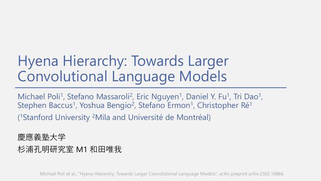 Massaroli2, Eric Nguyen1, Daniel Y. Fu1, Tri Dao1, Stephen Baccus1, Yoshua Bengio2, Stefano Ermon1, Christopher Ré1 (1Stanford University 2Mila and Université de Montréal) 慶應義塾⼤学 杉浦孔明研究室 M1 和⽥唯我 Michael Poli et al., “Hyena Hierarchy: Towards Larger Convolutional Language Models”, arXiv preprint arXiv:2302.10866.