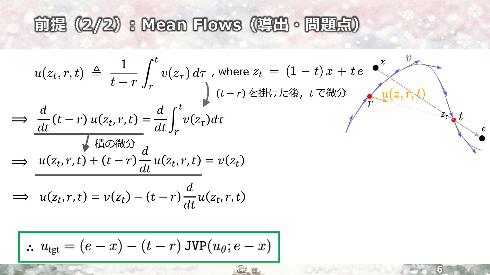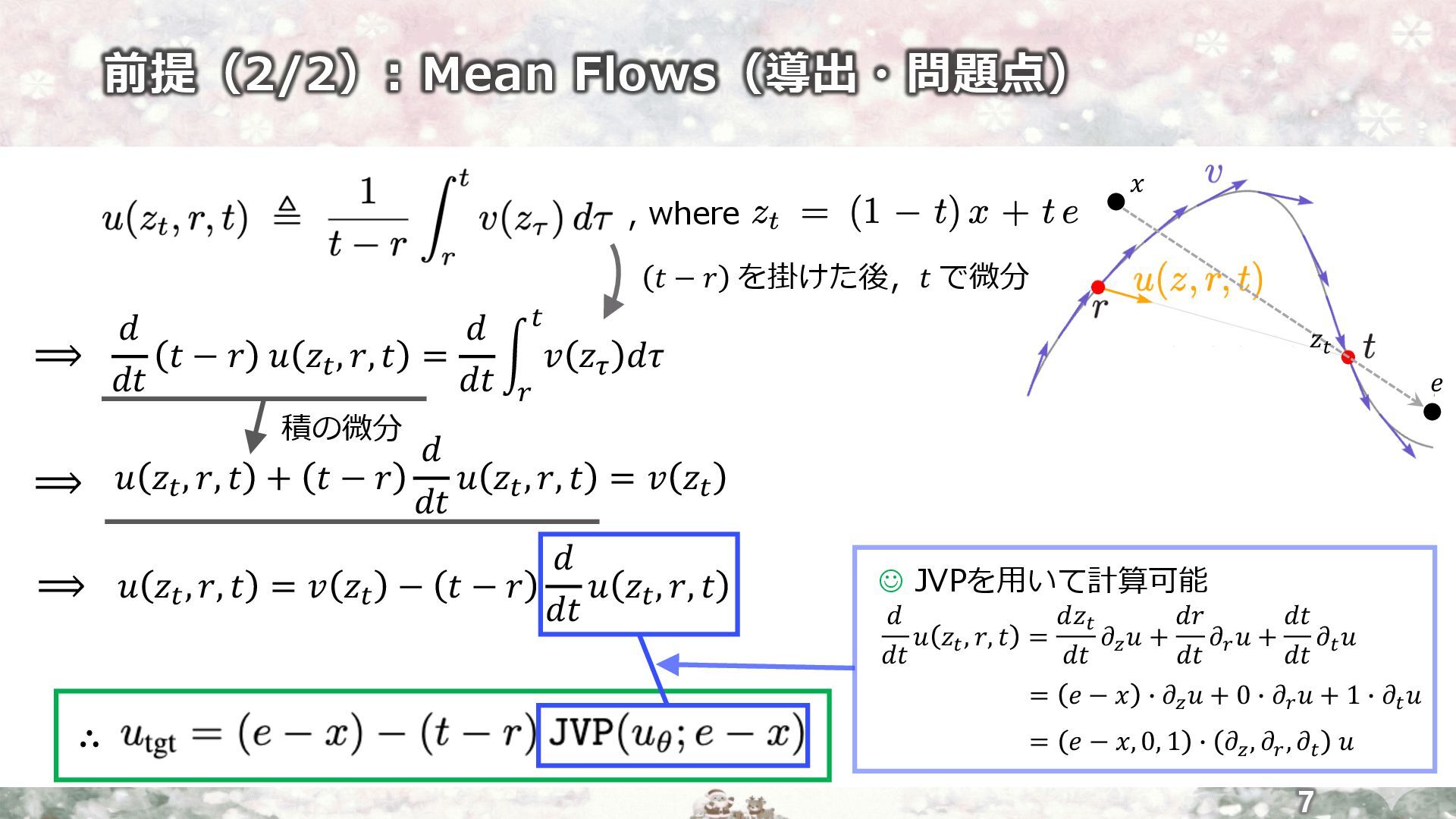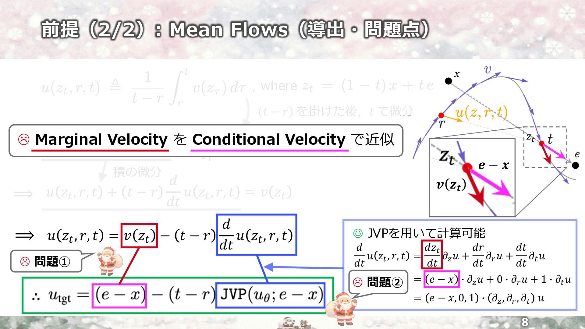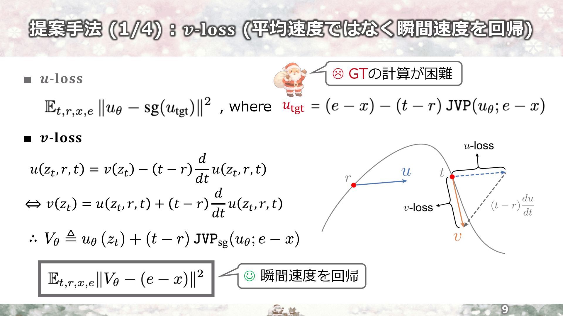 − 𝑟 𝑑 𝑑𝑡 𝑢 𝑧&, 𝑟, 𝑡 = 𝑣 𝑧& 𝑑 𝑑𝑡 𝑡 − 𝑟 𝑢 𝑧&, 𝑟, 𝑡 = 𝑑 𝑑𝑡 - ' & 𝑣 𝑧( 𝑑𝜏 𝑢 𝑧&, 𝑟, 𝑡 = 𝑣 𝑧& − 𝑡 − 𝑟 𝑑 𝑑𝑡 𝑢 𝑧&, 𝑟, 𝑡 , where 積の微分 = 𝑒 − 𝑥, 0, 1 / 𝜕# , 𝜕$ , 𝜕" 𝑢 = 𝑒 − 𝑥 / 𝜕# 𝑢 + 0 / 𝜕$ 𝑢 + 1 / 𝜕" 𝑢 J JVPを⽤いて計算可能 𝑑 𝑑𝑡 𝑢 𝑧" , 𝑟, 𝑡 = 𝑑𝑧" 𝑑𝑡 𝜕# 𝑢 + 𝑑𝑟 𝑑𝑡 𝜕$ 𝑢 + 𝑑𝑡 𝑑𝑡 𝜕" 𝑢 ⟹ ⟹ ⟹ ∴ L 問題① 𝑧" 𝑥 𝑒 𝑡 − 𝑟 を掛けた後,𝑡 で微分 𝒗 𝒛𝒕 𝒆 − 𝒙 L 問題② L Marginal Velocity を Conditional Velocity で近似