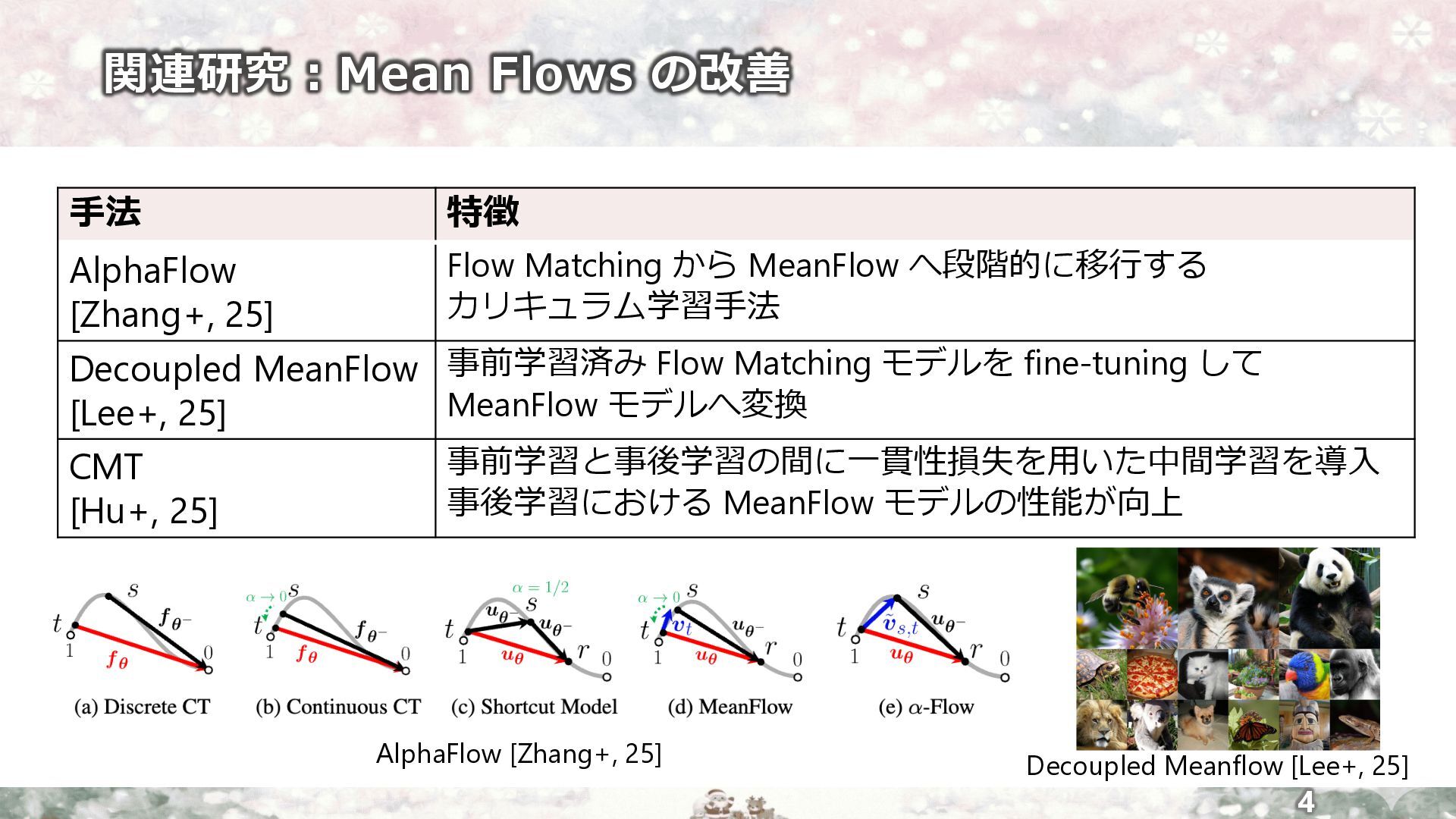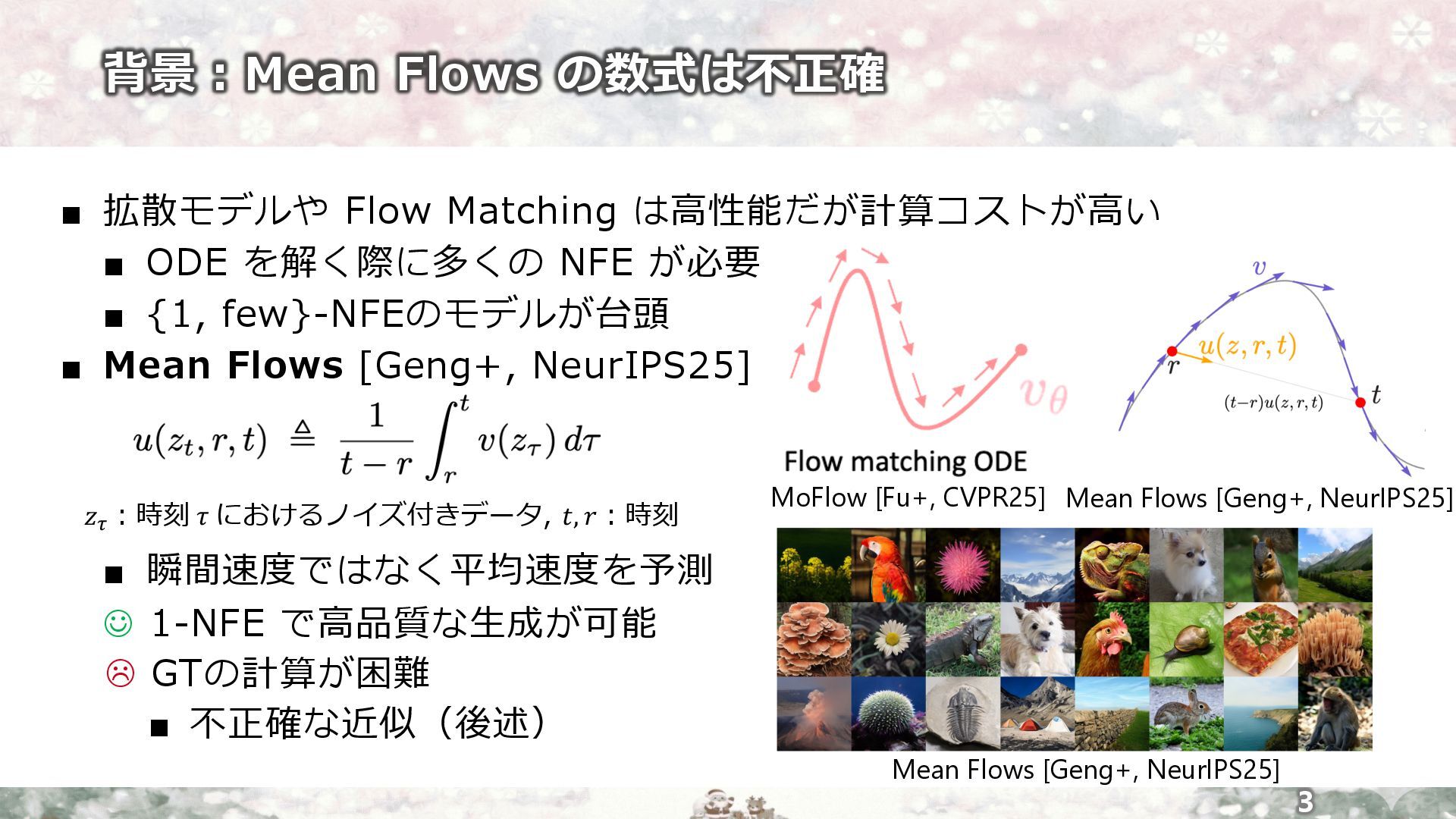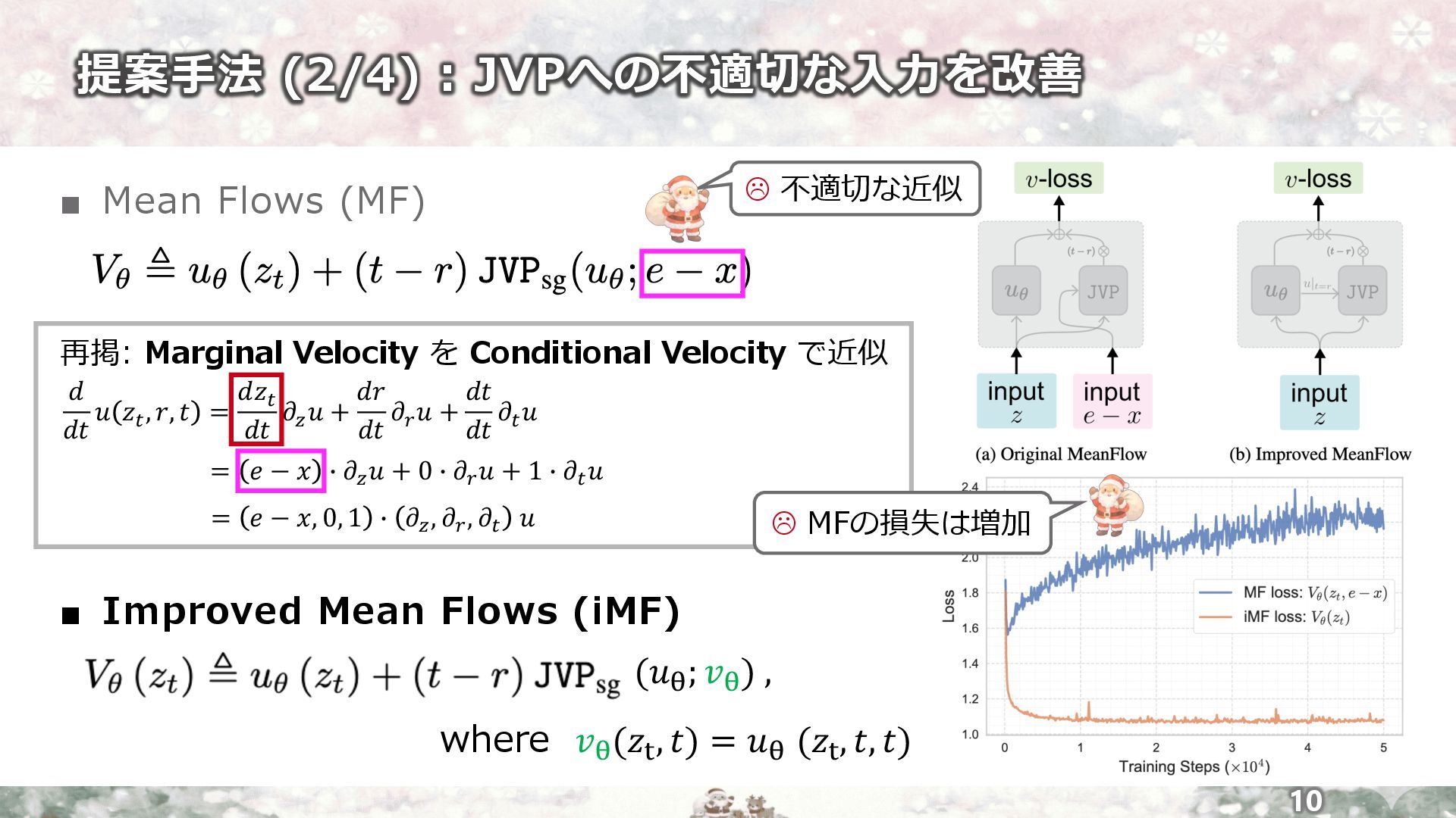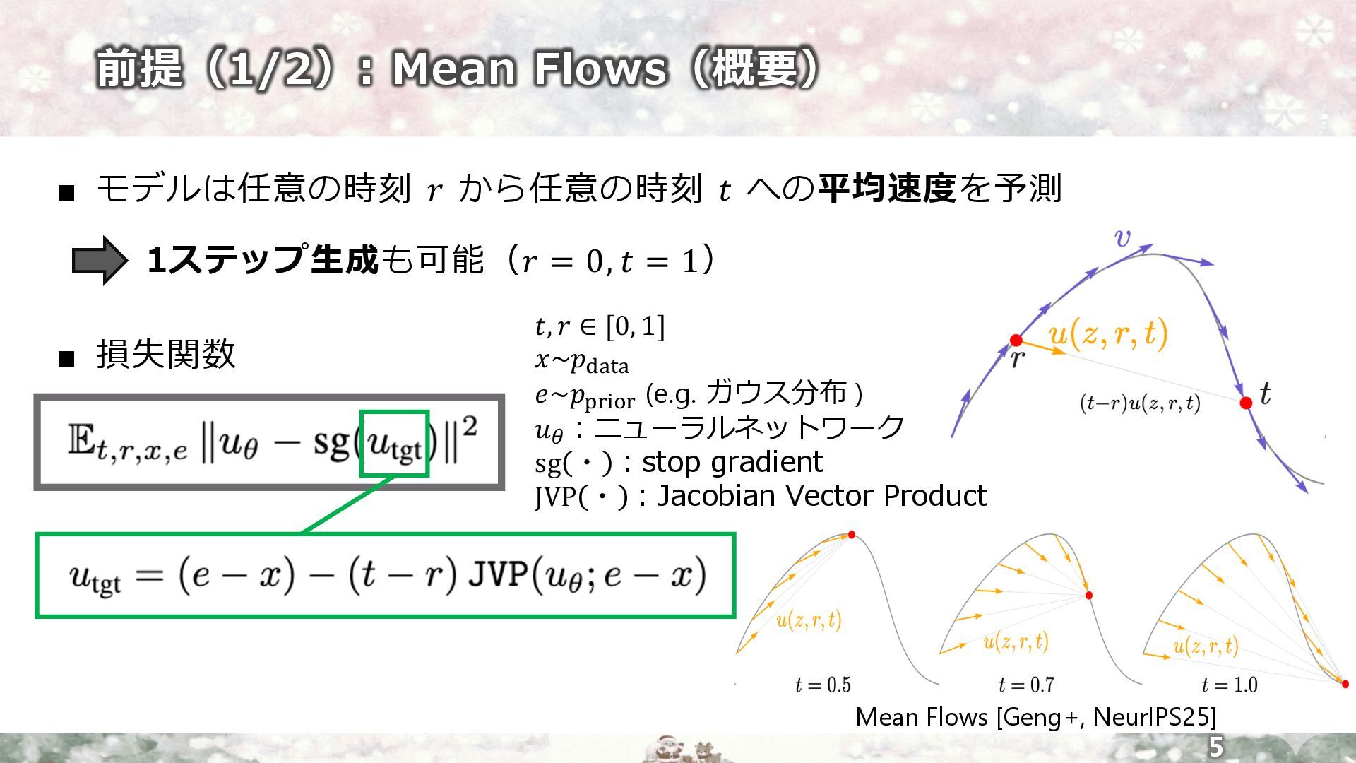 − 𝑟 𝑑 𝑑𝑡 𝑢 𝑧&, 𝑟, 𝑡 = 𝑣 𝑧& 𝑑 𝑑𝑡 𝑡 − 𝑟 𝑢 𝑧&, 𝑟, 𝑡 = 𝑑 𝑑𝑡 - ' & 𝑣 𝑧( 𝑑𝜏 𝑢 𝑧&, 𝑟, 𝑡 = 𝑣 𝑧& − 𝑡 − 𝑟 𝑑 𝑑𝑡 𝑢 𝑧&, 𝑟, 𝑡 , where 積の微分 = 𝑒 − 𝑥, 0, 1 / 𝜕# , 𝜕$ , 𝜕" 𝑢 = 𝑒 − 𝑥 / 𝜕# 𝑢 + 0 / 𝜕$ 𝑢 + 1 / 𝜕" 𝑢 J JVPを⽤いて計算可能 𝑑 𝑑𝑡 𝑢 𝑧" , 𝑟, 𝑡 = 𝑑𝑧" 𝑑𝑡 𝜕# 𝑢 + 𝑑𝑟 𝑑𝑡 𝜕$ 𝑢 + 𝑑𝑡 𝑑𝑡 𝜕" 𝑢 ⟹ ⟹ ⟹ ∴ L 問題① 𝑧" 𝑥 𝑒 𝑡 − 𝑟 を掛けた後,𝑡 で微分 𝒗 𝒛𝒕 𝒆 − 𝒙 L 問題② L Marginal Velocity を Conditional Velocity で近似