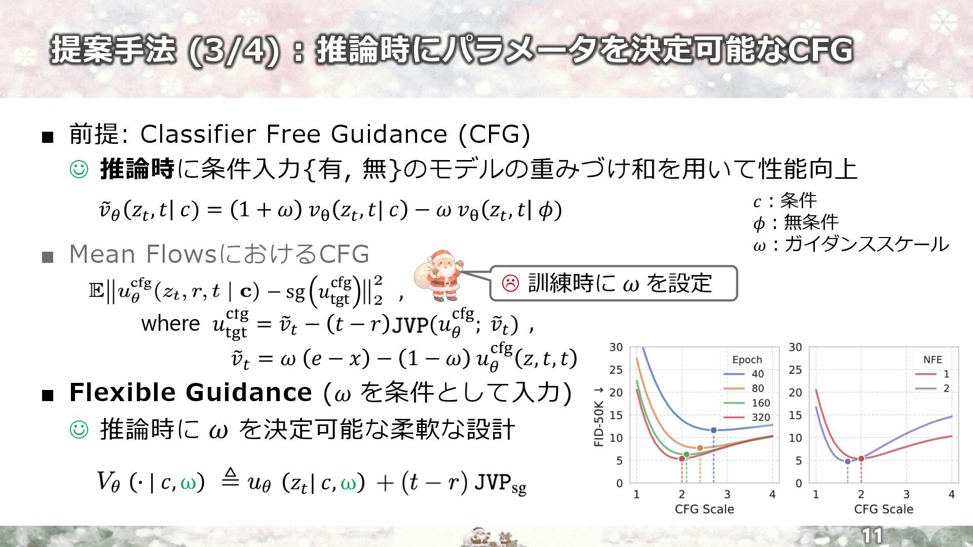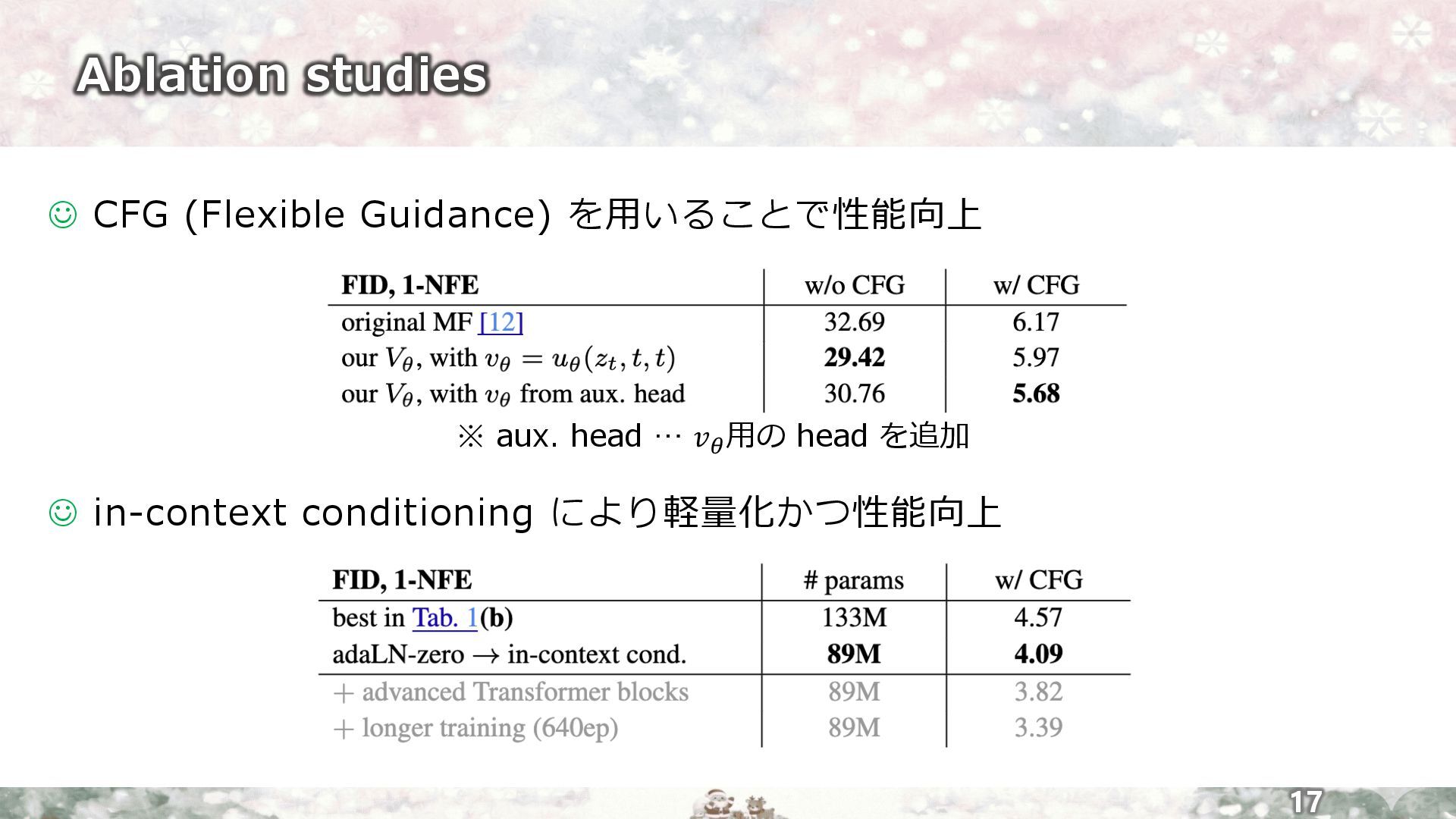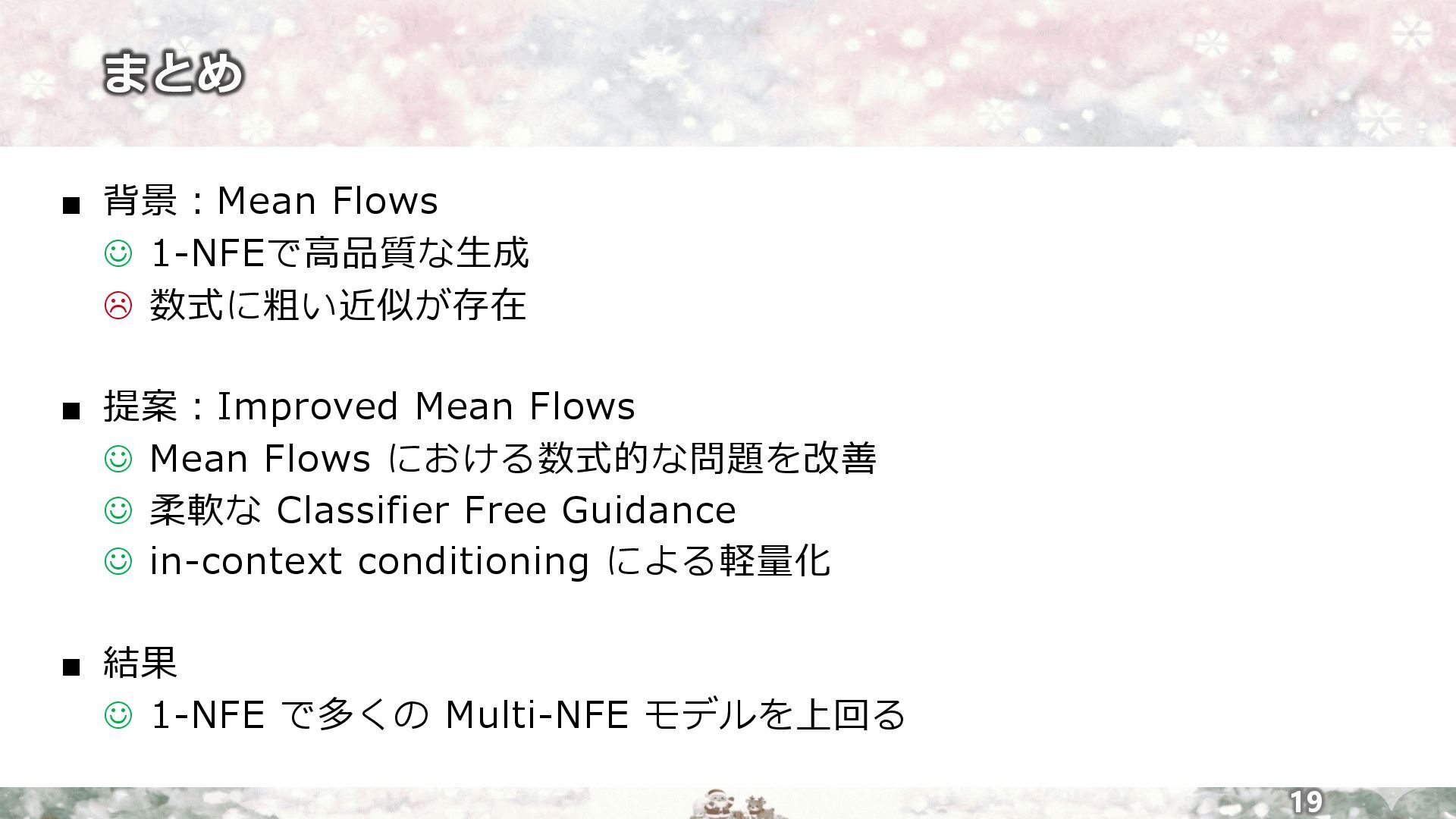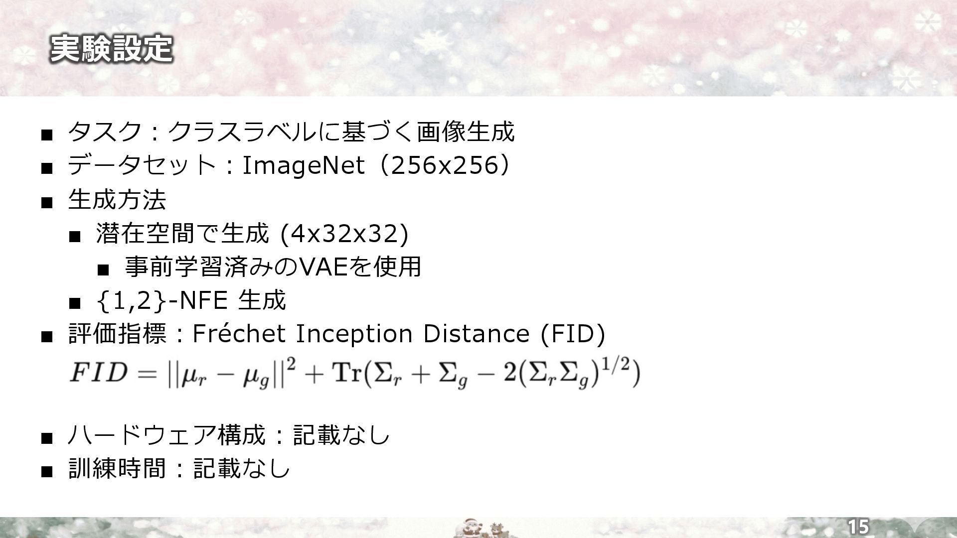 − 𝑟 𝑑 𝑑𝑡 𝑢 𝑧&, 𝑟, 𝑡 = 𝑣 𝑧& 𝑑 𝑑𝑡 𝑡 − 𝑟 𝑢 𝑧&, 𝑟, 𝑡 = 𝑑 𝑑𝑡 - ' & 𝑣 𝑧( 𝑑𝜏 𝑢 𝑧&, 𝑟, 𝑡 = 𝑣 𝑧& − 𝑡 − 𝑟 𝑑 𝑑𝑡 𝑢 𝑧&, 𝑟, 𝑡 , where 積の微分 = 𝑒 − 𝑥, 0, 1 / 𝜕# , 𝜕$ , 𝜕" 𝑢 = 𝑒 − 𝑥 / 𝜕# 𝑢 + 0 / 𝜕$ 𝑢 + 1 / 𝜕" 𝑢 J JVPを⽤いて計算可能 𝑑 𝑑𝑡 𝑢 𝑧" , 𝑟, 𝑡 = 𝑑𝑧" 𝑑𝑡 𝜕# 𝑢 + 𝑑𝑟 𝑑𝑡 𝜕$ 𝑢 + 𝑑𝑡 𝑑𝑡 𝜕" 𝑢 ⟹ ⟹ ⟹ ∴ L 問題① 𝑧" 𝑥 𝑒 𝑡 − 𝑟 を掛けた後,𝑡 で微分 𝒗 𝒛𝒕 𝒆 − 𝒙 L 問題② L Marginal Velocity を Conditional Velocity で近似