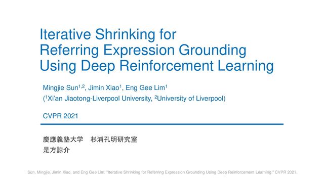 Deep Reinforcement Learning Mingjie Sun1,2, Jimin Xiao1, Eng Gee Lim1 (1Xi’an Jiaotong-Liverpool University, 2University of Liverpool) CVPR 2021 Sun, Mingjie, Jimin Xiao, and Eng Gee Lim. "Iterative Shrinking for Referring Expression Grounding Using Deep Reinforcement Learning." CVPR 2021.