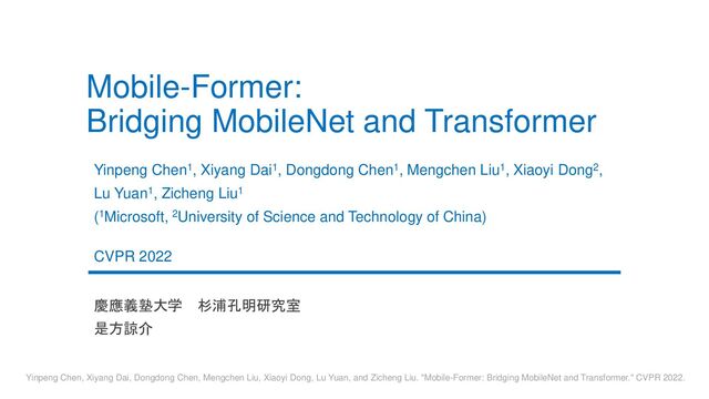 Xiyang Dai1, Dongdong Chen1, Mengchen Liu1, Xiaoyi Dong2, Lu Yuan1, Zicheng Liu1 (1Microsoft, 2University of Science and Technology of China) CVPR 2022 Yinpeng Chen, Xiyang Dai, Dongdong Chen, Mengchen Liu, Xiaoyi Dong, Lu Yuan, and Zicheng Liu. "Mobile-Former: Bridging MobileNet and Transformer." CVPR 2022.