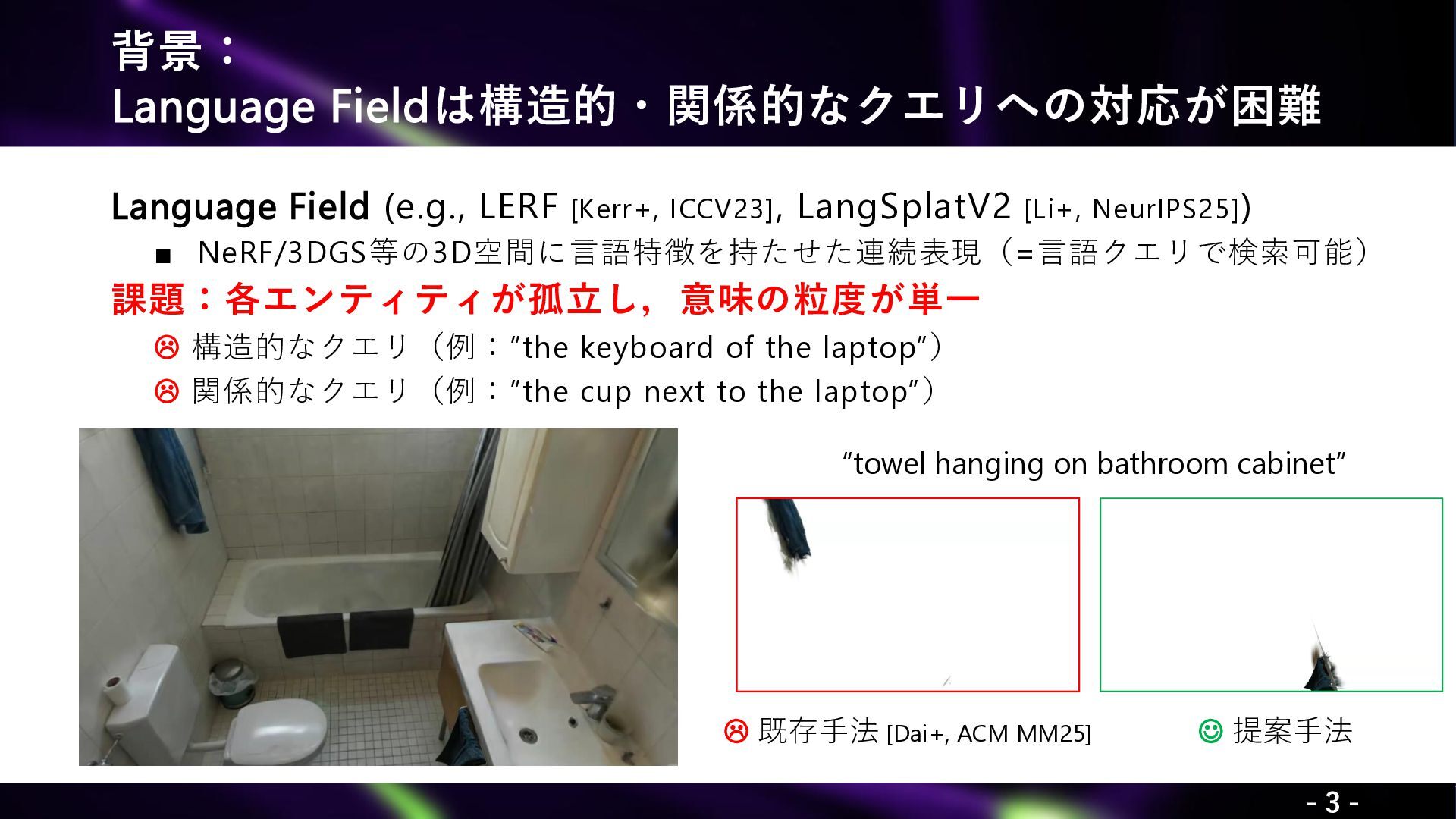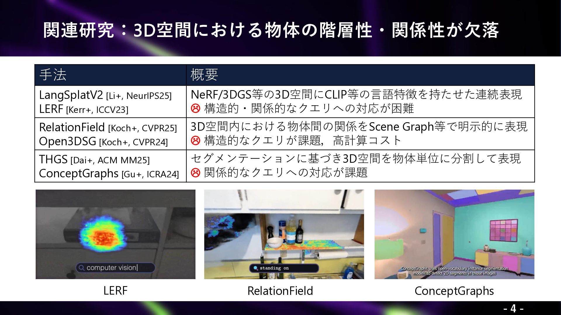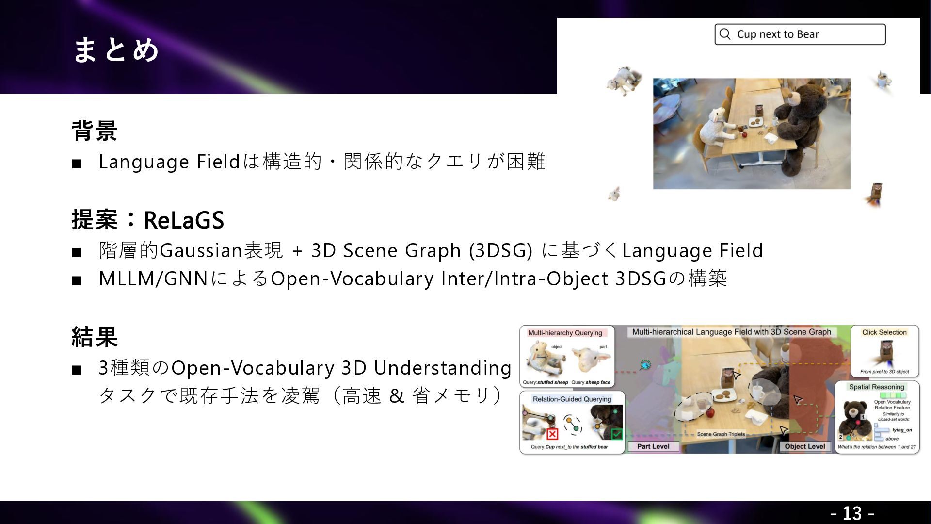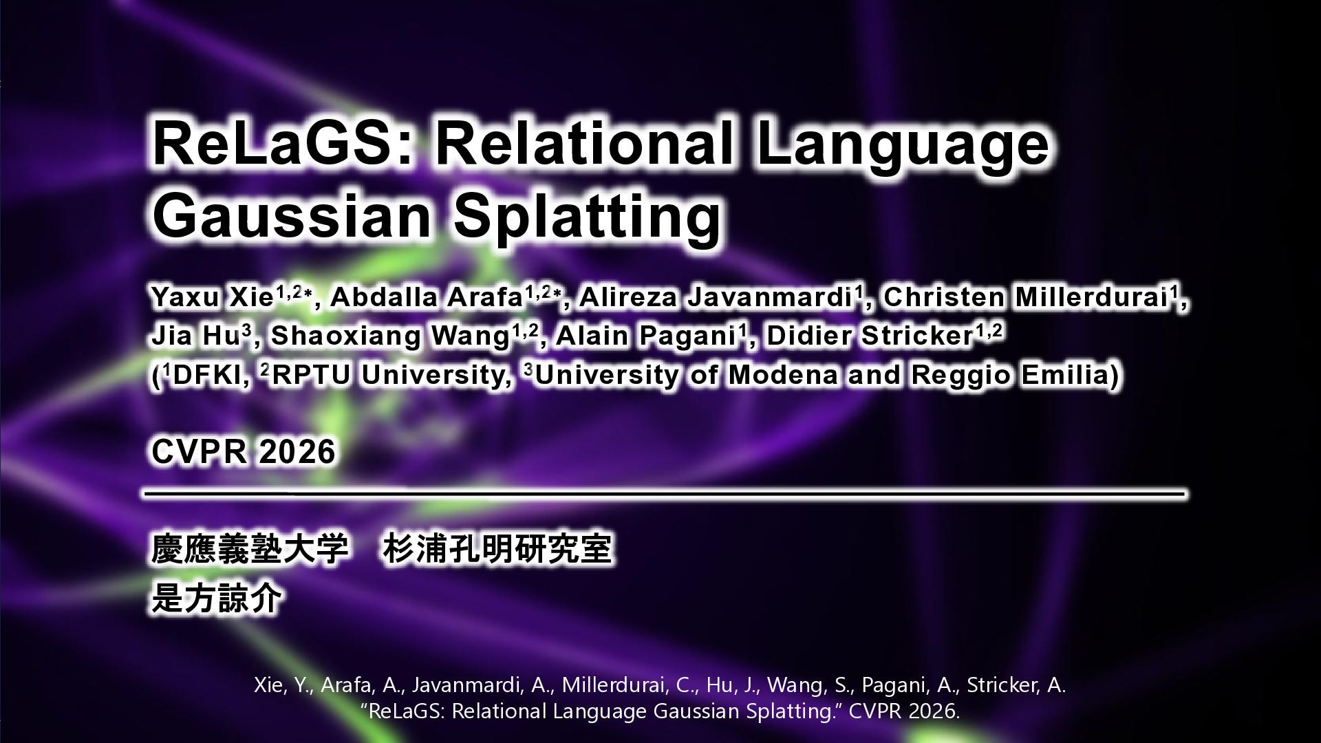 Xie, Y., Arafa, A., Javanmardi, A., Millerdurai, C., Hu, J., Wang, S., Pagani, A., Stricker, A. “ReLaGS: Relational Language Gaussian Splatting.” CVPR 2026. Yaxu Xie1,2∗, Abdalla Arafa1,2∗, Alireza Javanmardi1, Christen Millerdurai1, Jia Hu3, Shaoxiang Wang1,2, Alain Pagani1, Didier Stricker1,2 (1DFKI, 2RPTU University, 3University of Modena and Reggio Emilia)