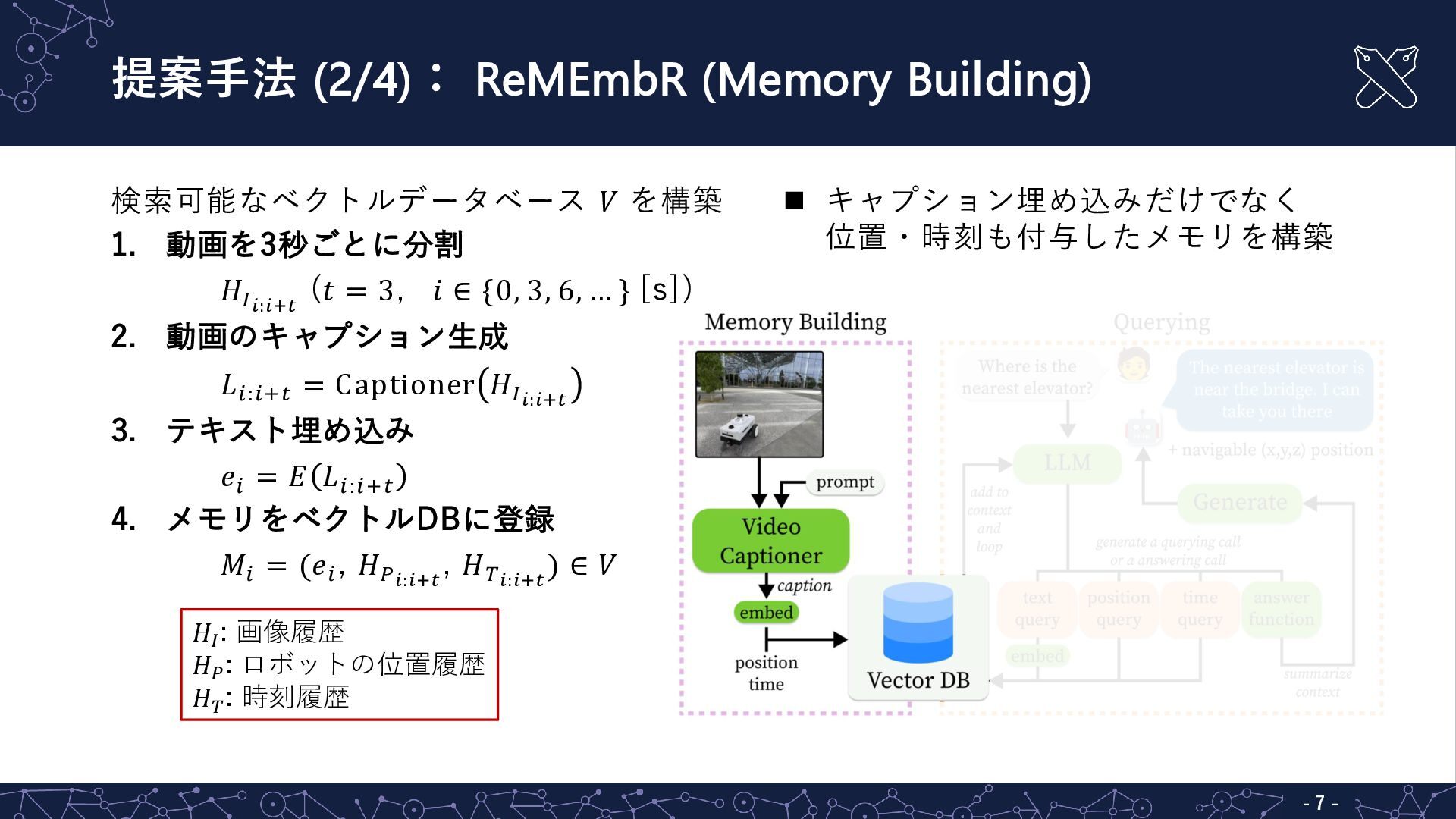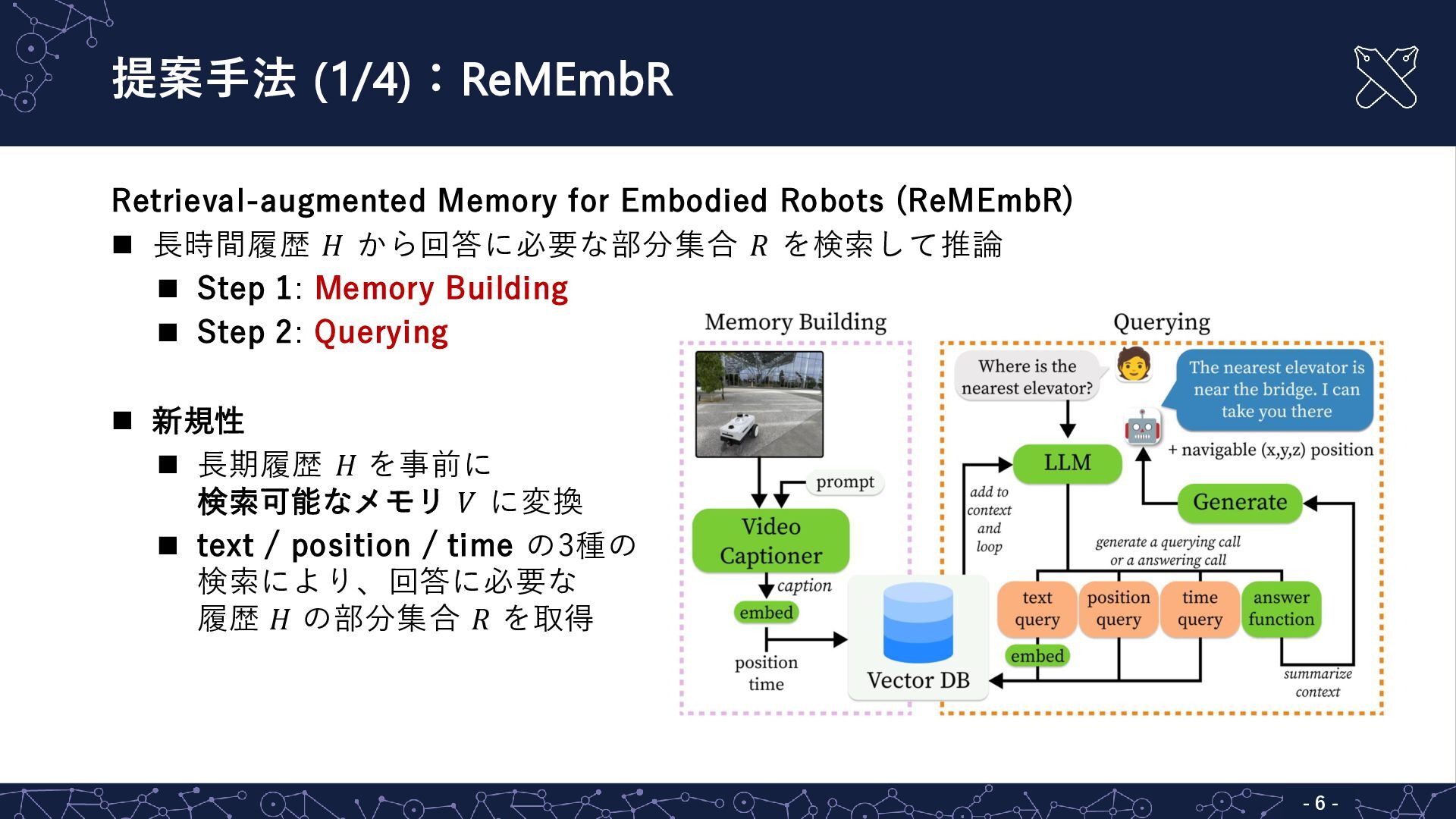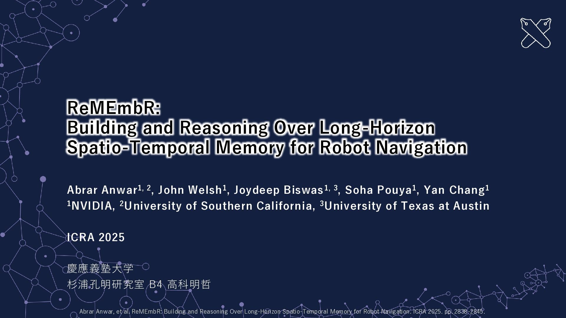 Yan Chang1 1NVIDIA, 2University of Southern California, 3University of Texas at Austin ICRA 2025 慶應義塾大学 杉浦孔明研究室 B4 高科明哲 ReMEmbR: Building and Reasoning Over Long-Horizon Spatio-Temporal Memory for Robot Navigation Abrar Anwar, et al. ReMEmbR: Building and Reasoning Over Long-Horizon Spatio-Temporal Memory for Robot Navigation. ICRA 2025. pp. 2838-2845.