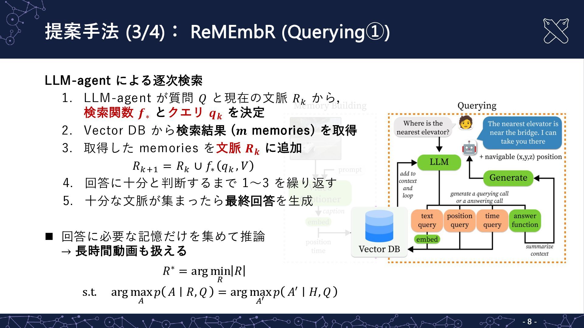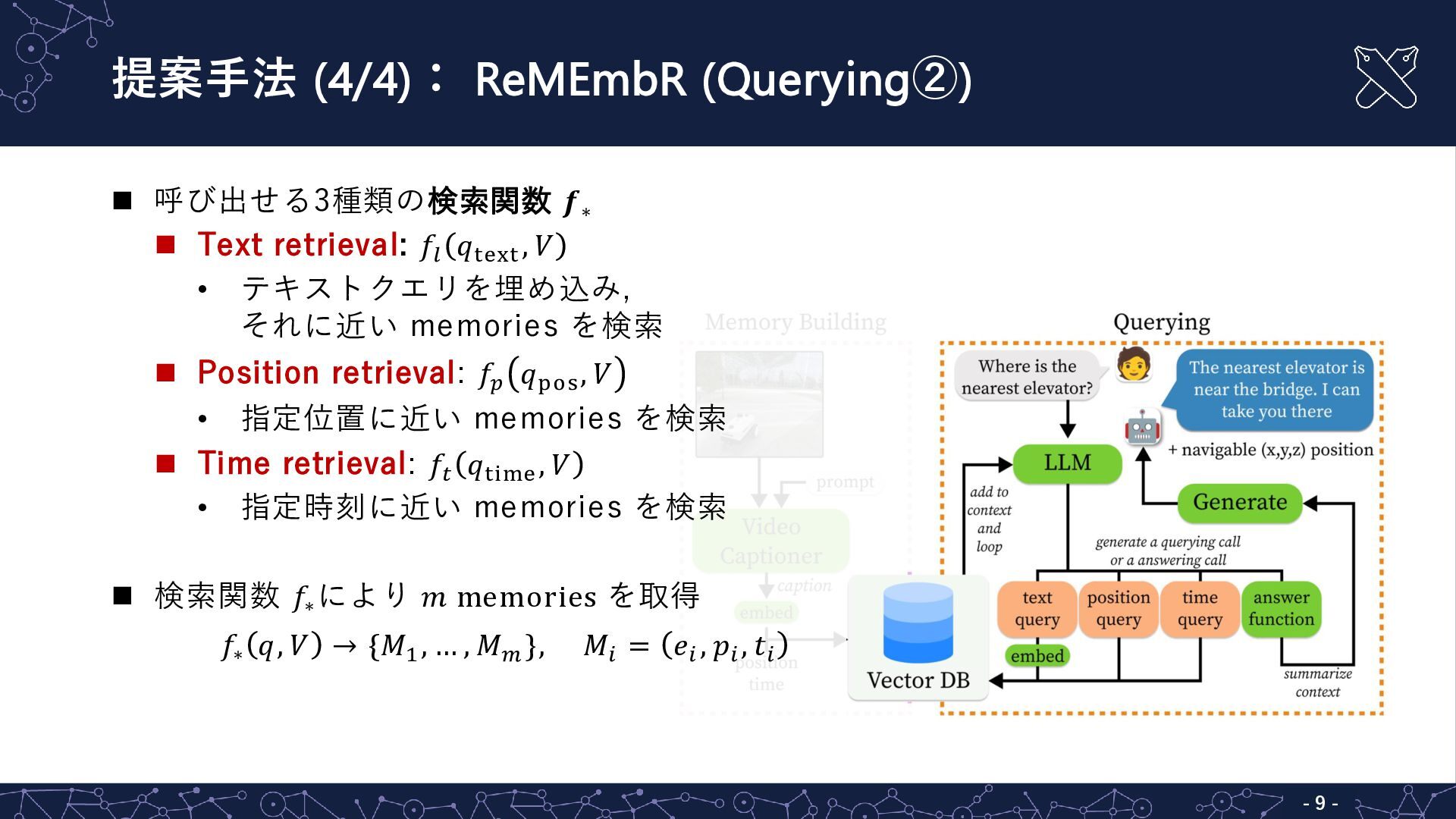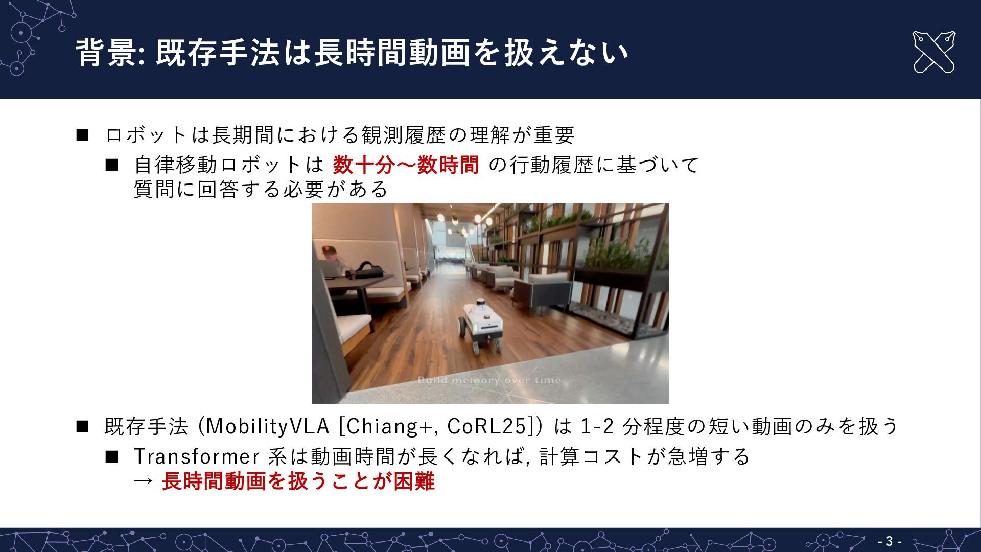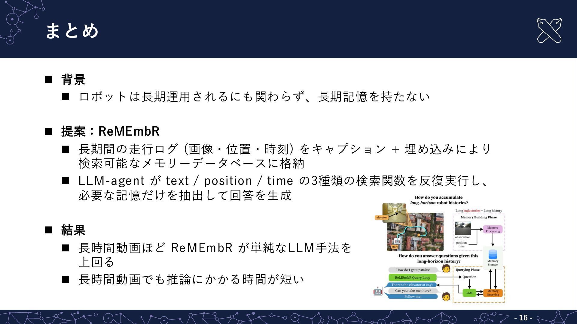 Yan Chang1 1NVIDIA, 2University of Southern California, 3University of Texas at Austin ICRA 2025 慶應義塾大学 杉浦孔明研究室 B4 高科明哲 ReMEmbR: Building and Reasoning Over Long-Horizon Spatio-Temporal Memory for Robot Navigation Abrar Anwar, et al. ReMEmbR: Building and Reasoning Over Long-Horizon Spatio-Temporal Memory for Robot Navigation. ICRA 2025. pp. 2838-2845.