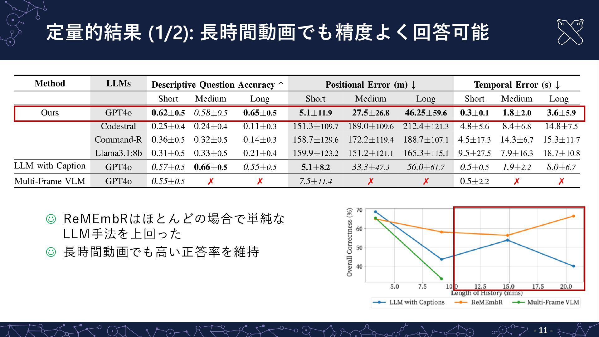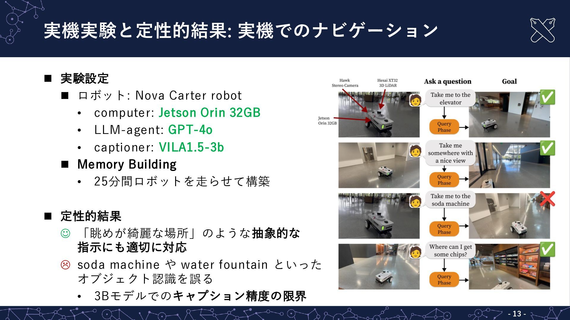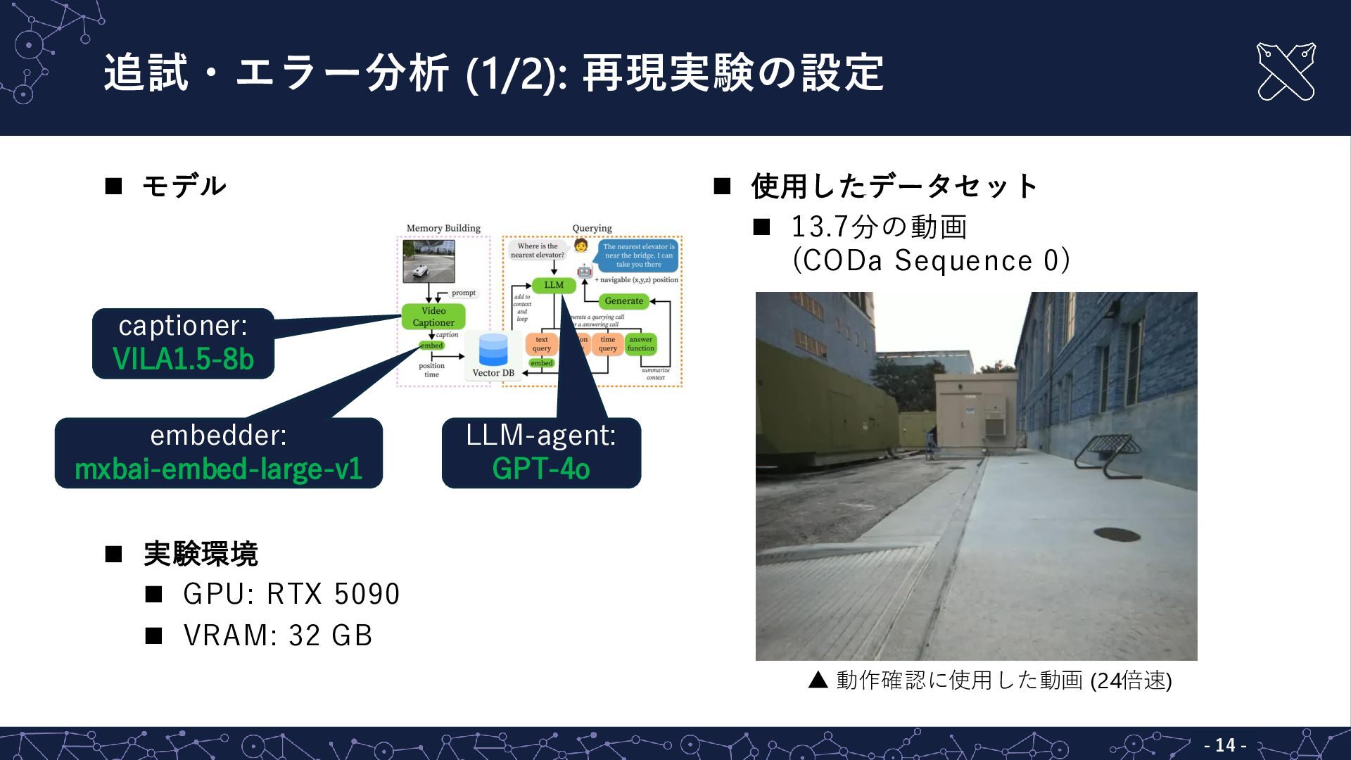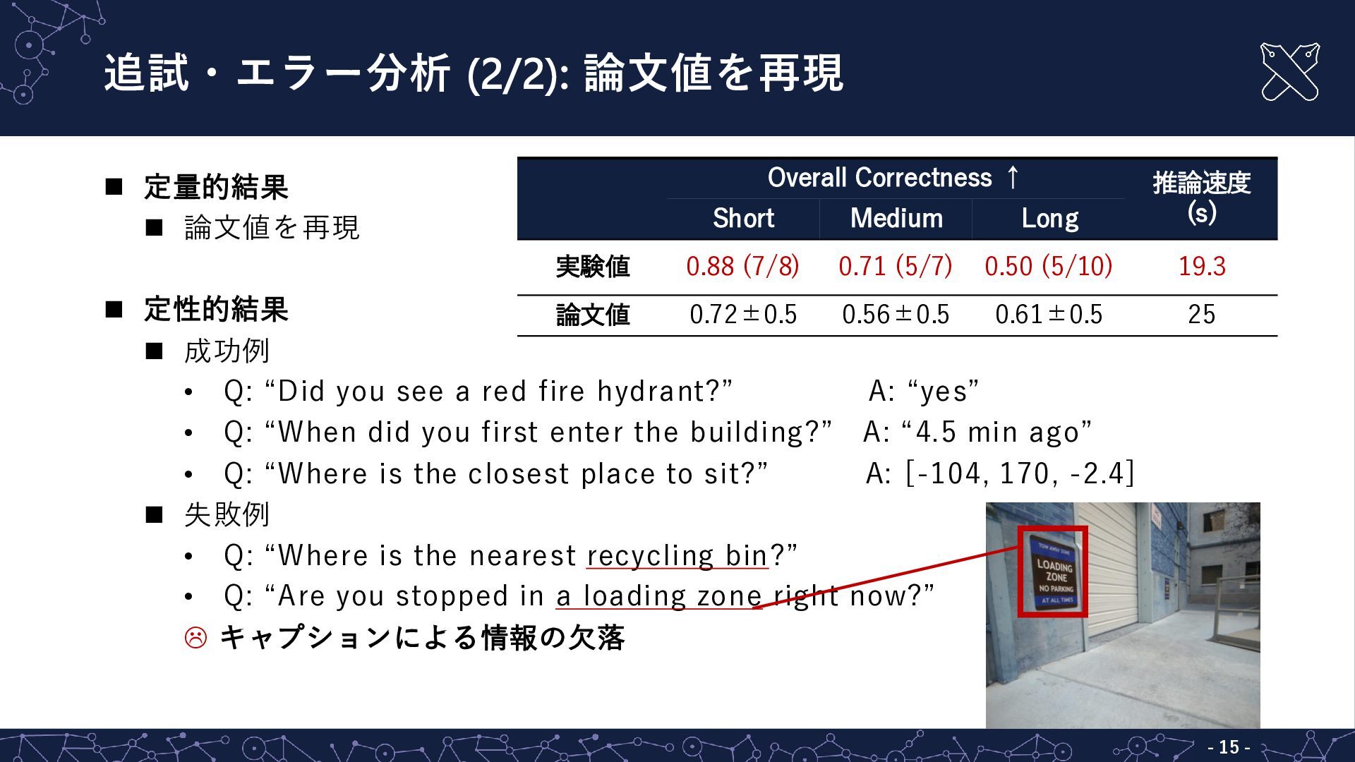◼ 定性的結果 ◼ 成功例 • Q: “Did you see a red fire hydrant?” A: “yes” • Q: “When did you first enter the building?” A: “4.5 min ago” • Q: “Where is the closest place to sit?” A: [-104, 170, -2.4] ◼ 失敗例 • Q: “Where is the nearest recycling bin?” • Q: “Are you stopped in a loading zone right now?” キャプションによる情報の欠落 Overall Correctness ↑ 推論速度 (s) Short Medium Long 実験値 0.88 (7/8) 0.71 (5/7) 0.50 (5/10) 19.3 論文値 0.72±0.5 0.56±0.5 0.61±0.5 25