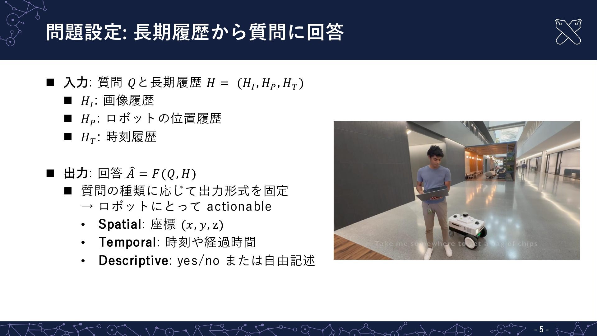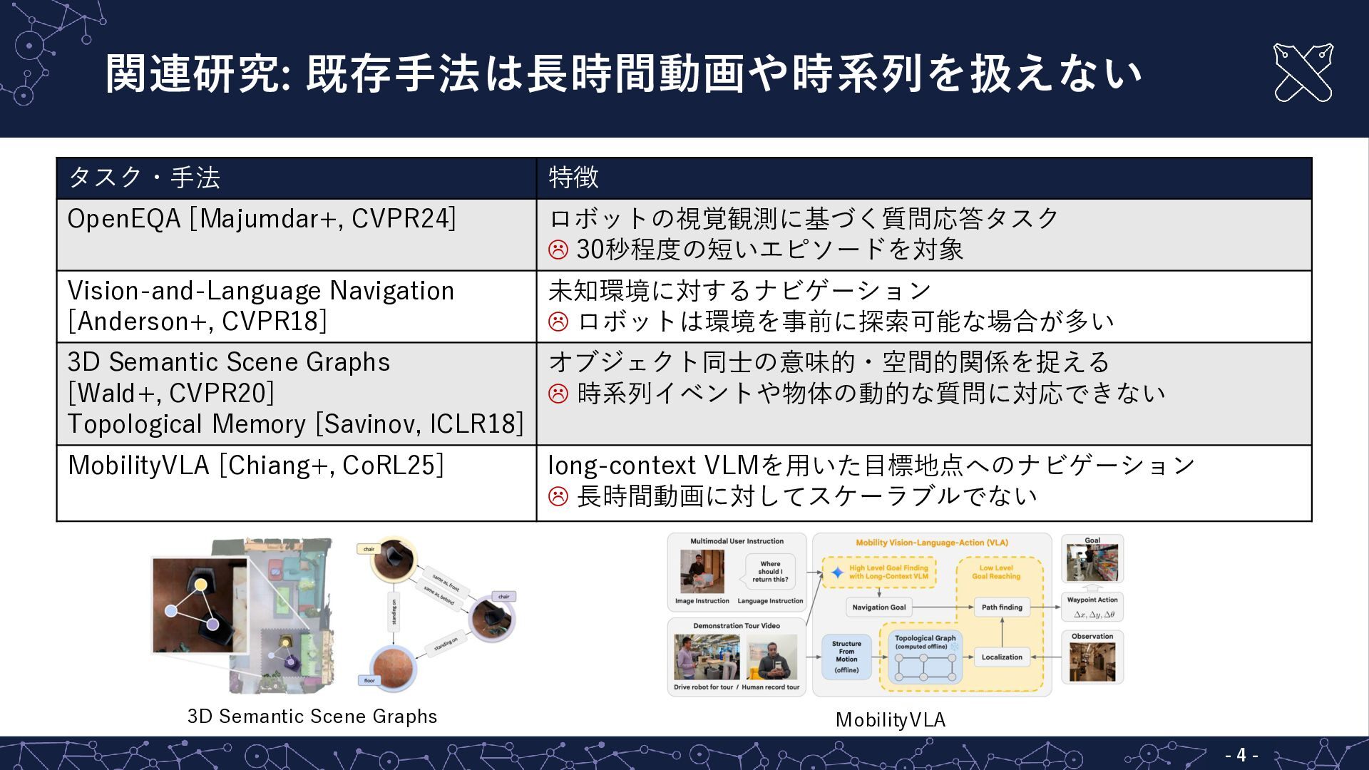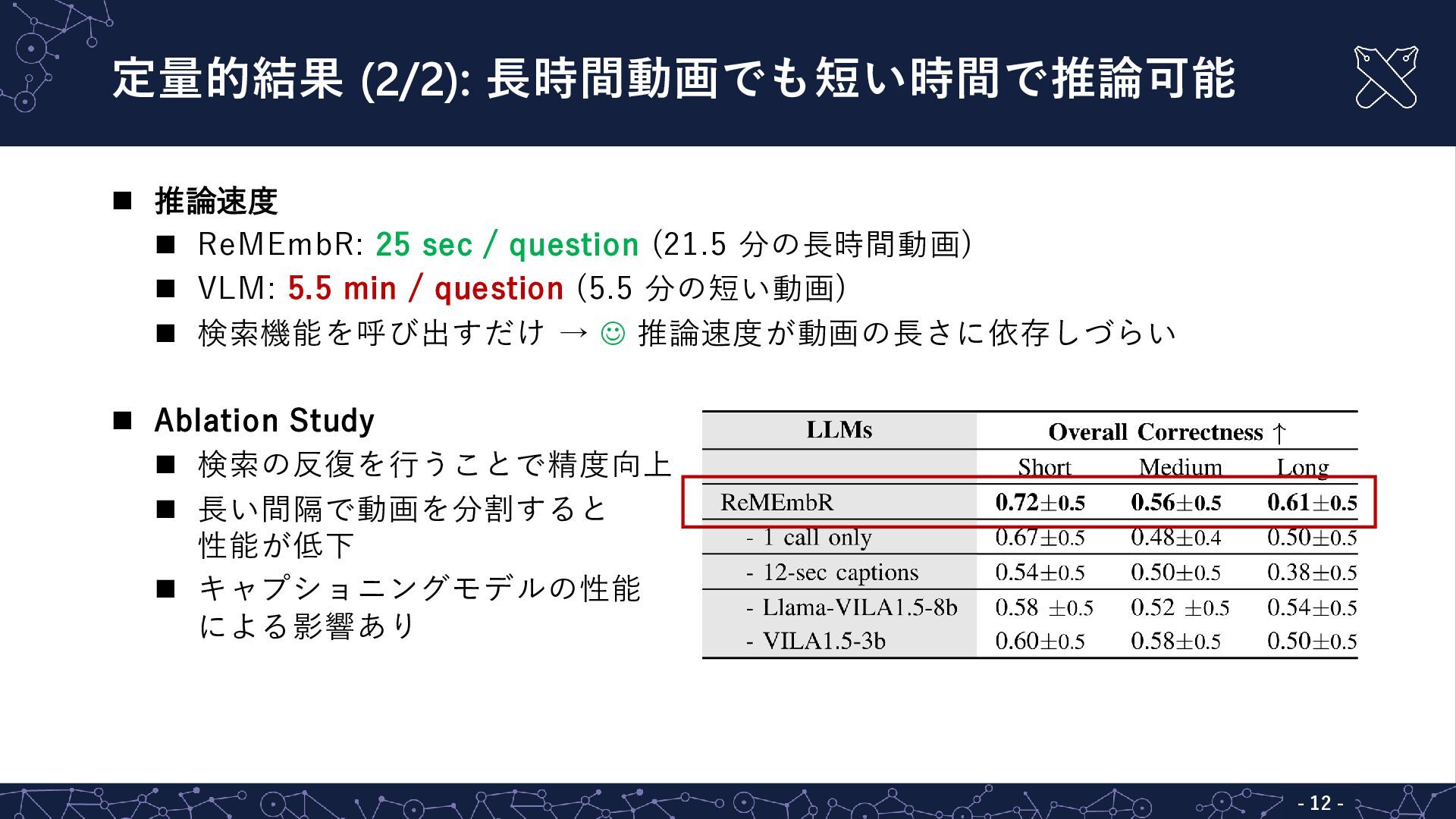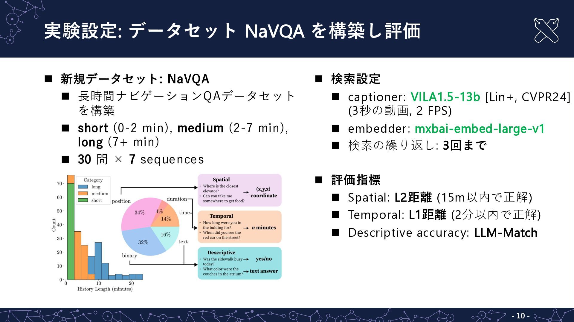 ◼ 定性的結果 ◼ 成功例 • Q: “Did you see a red fire hydrant?” A: “yes” • Q: “When did you first enter the building?” A: “4.5 min ago” • Q: “Where is the closest place to sit?” A: [-104, 170, -2.4] ◼ 失敗例 • Q: “Where is the nearest recycling bin?” • Q: “Are you stopped in a loading zone right now?” キャプションによる情報の欠落 Overall Correctness ↑ 推論速度 (s) Short Medium Long 実験値 0.88 (7/8) 0.71 (5/7) 0.50 (5/10) 19.3 論文値 0.72±0.5 0.56±0.5 0.61±0.5 25
