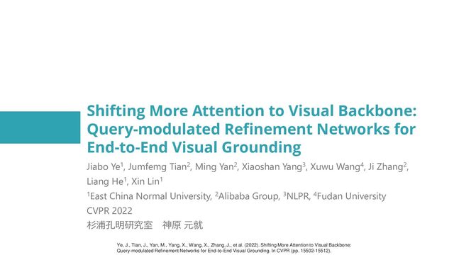 End-to-End Visual Grounding Jiabo Ye1, Jumfemg Tian2, Ming Yan2, Xiaoshan Yang3, Xuwu Wang4, Ji Zhang2, Liang He1, Xin Lin1 1East China Normal University, 2Alibaba Group, 3NLPR, 4Fudan University CVPR 2022 杉浦孔明研究室 神原 元就 Ye, J., Tian, J., Yan, M., Yang, X., Wang, X., Zhang, J., et al. (2022). Shifting More Attention to Visual Backbone: Query-modulated Refinement Networks for End-to-End Visual Grounding. In CVPR (pp. 15502-15512).