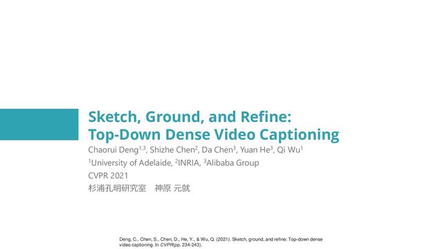Shizhe Chen2, Da Chen3, Yuan He3, Qi Wu1 1University of Adelaide, 2INRIA, 3Alibaba Group CVPR 2021 杉浦孔明研究室 神原 元就 Deng, C., Chen, S., Chen, D., He, Y., & Wu, Q. (2021). Sketch, ground, and refine: Top-down dense video captioning. In CVPR(pp. 234-243).