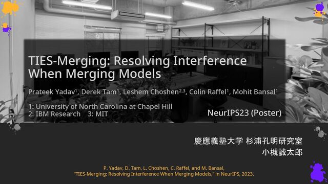 Leshem Choshen2,3, Colin Raffel1, Mohit Bansal1 1: University of North Carolina at Chapel Hill 2: IBM Research 3: MIT 慶應義塾大学 杉浦孔明研究室 小槻誠太郎 P. Yadav, D. Tam, L. Choshen, C. Raffel, and M. Bansal, “TIES-Merging: Resolving Interference When Merging Models,” in NeurIPS, 2023. NeurIPS23 (Poster)