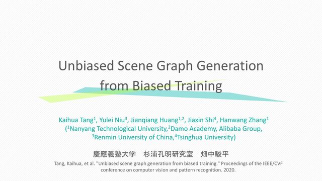 (1Nanyang Technological University,2Damo Academy, Alibaba Group, 3Renmin University of China,4Tsinghua University) Unbiased Scene Graph Generation from Biased Training Tang, Kaihua, et al. "Unbiased scene graph generation from biased training." Proceedings of the IEEE/CVF conference on computer vision and pattern recognition. 2020. 慶應義塾大学 杉浦孔明研究室 畑中駿平