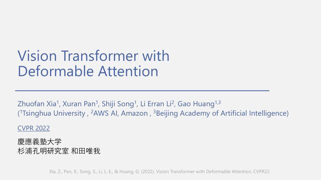 Song1, Li Erran Li2, Gao Huang1,3 (1Tsinghua University , 2AWS AI, Amazon , 3Beijing Academy of Artificial Intelligence) 慶應義塾⼤学 杉浦孔明研究室 和⽥唯我 Xia, Z., Pan, X., Song, S., Li, L. E., & Huang, G. (2022). Vision Transformer with Deformable Attention. CVPR22 CVPR 2022