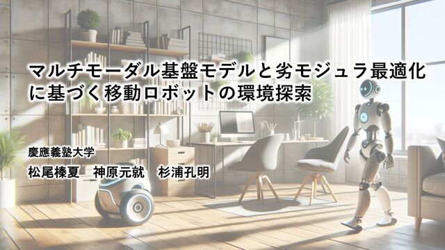 [Hernandez+, IROS20], ZAVIS [Park+, ICRA23] ☺ 物体の存在確率を使用して物体を効率的に探索 COPOタスクへの適用 → 組み合わせ爆発の回避× 行動系列生成 Matcha [Zhao+, IROS23], NavCon [Biggie+, CoRL23] ☺ 大規模言語モデル (LLM) を使用し良好な結果 COPOタスクにおいて最適解が得られる保証× [Hernandez+, IROS20] ZAVIS [Park+, ICRA23] NavCon [Biggie+, CoRL23]