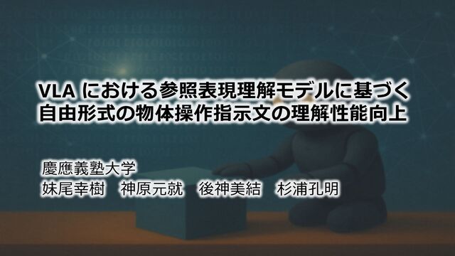 OpenVLA: 175 h, π0 -FAST: 166 h 本研究: VLAのためのPlug & Play可能な⾃由形式指⽰⽂の理解・実⾏フレームワーク Motivation: VLAに⾃由形式の指⽰⽂を理解・実⾏させたい 2 “Can you pick up the can near the front of the table?” SIMPLER [Li+, CoRL24] における成功率