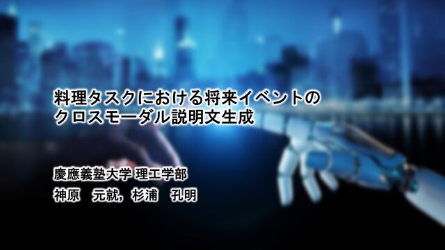 計12Kサンプル “grill the tomatoes in a pan and then put them on a plate” BILA-caption データセット “the rabbit figurine falls off the shelf because it is pushed away by the robot” • 生活支援ロボットによる物体配置タスクにお ける,危険性についての説明文が付与 • 計1000サンプル